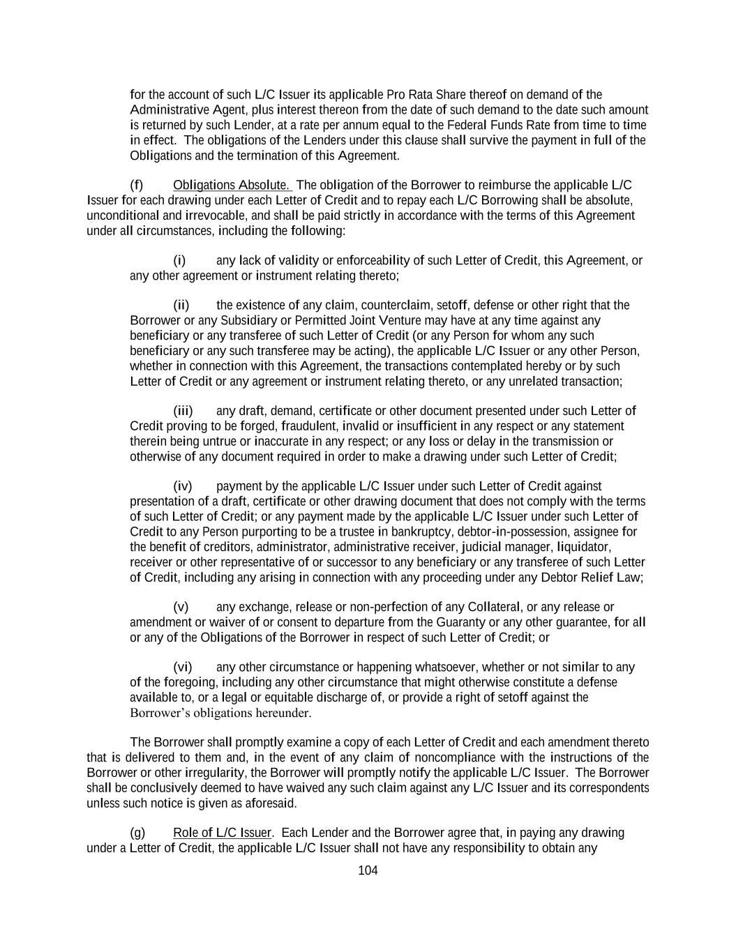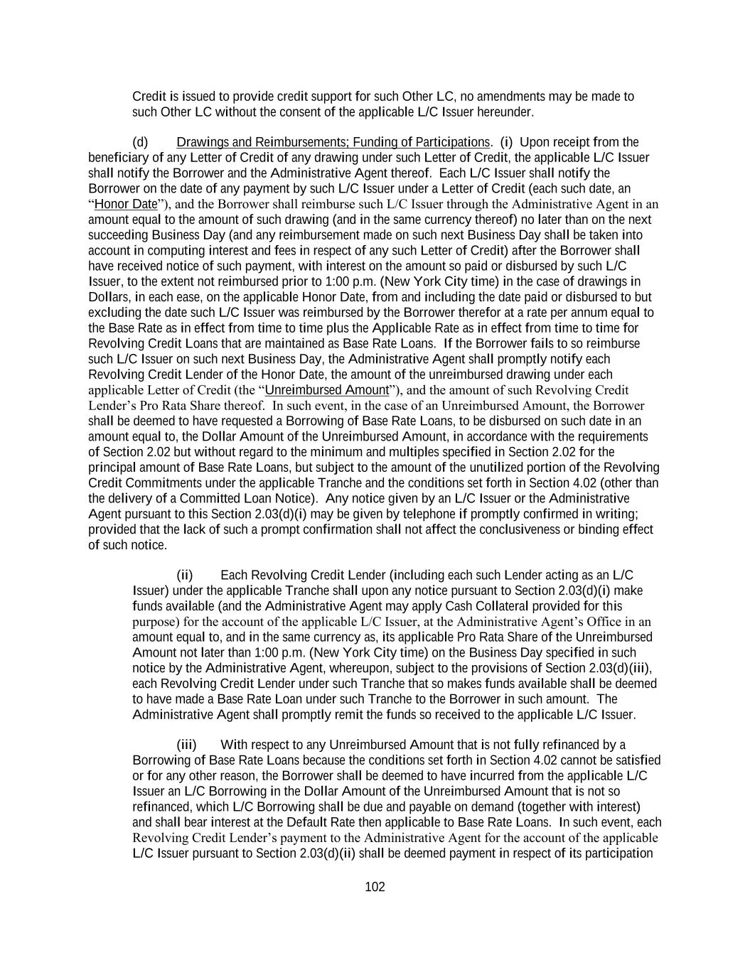 184 (b) second, to payment of that portion of the Obligations constituting fees, indemnities, expenses and other amounts (other than principal, interest and Letter of Credit fees) payable to the Lenders and the L/C Issuers (including fees, disbursements and other charges of counsel payable under Sections 10.04 and 10.05) arising under the Loan Documents and amounts payable under Article III, ratably among them in proportion to the respective amounts described in this clause (b) held by them; (c) third, to payment of that portion of the Obligations constituting accrued and unpaid Letter of Credit fees, interest on the Loans and L/C Borrowings, ratably among the Lenders in proportion to the respective amounts described in this clause (c) held by them; (d) fourth, (i) to payment of that portion of the Obligations constituting unpaid principal of the Loans, the L/C Borrowings and obligations of the Loan Parties then owing under Secured Hedge Agreements and the Secured Cash Management Agreements and (ii) to Cash Collateralize that portion of L/C Obligations comprising the aggregate undrawn amount of Letters of Credit to the extent not otherwise Cash Collateralized by the Borrower pursuant to Sections 2.03 and 2.16, ratably among the Lenders, the L/C Issuers, the Hedge Banks party to such Secured Hedge Agreements and the Cash Management Banks party to such Secured Cash Management Agreements in proportion to the respective amounts described in this clause (d) held by them; provided that (x) any such amounts applied pursuant to the foregoing clause (ii) shall be paid to the Administrative Agent for the ratable account of the applicable L/C Issuers to Cash Collateralize such L/C Obligations, (y) subject to Sections 2.03(d) and 2.16, amounts used to Cash Collateralize the aggregate undrawn amount of Letters of Credit pursuant to this clause (d) shall be applied to satisfy drawings under such Letters of Credit as they occur and (z) upon the expiration of any Letter of Credit without any pending drawing, the pro rata share of Cash Collateral attributable to such expired Letter of Credit shall be applied by the Administrative Agent in accordance with the priority of payments set forth in this Section 8.04; (e) fifth, to the payment of all other Obligations of the Loan Parties owing under or in respect of the Loan Documents or under Secured Hedge Agreement or Secured Cash Management Agreements that are then due and payable to the Administrative Agent and the other Secured Parties, ratably based upon the respective aggregate amounts of all such Obligations then owing to the Administrative Agent and the other Secured Parties; and (f) last, after all of the Obligations have been paid in full (other than contingent indemnification obligations not yet due and owing), to the Borrower or as otherwise required by Law; provided that no amounts received from any Guarantor shall be applied to Excluded Swap Obligations of such Guarantor. If any amount remains on deposit as Cash Collateral after all Letters of Credit have either been fully drawn or expired without any pending drawing, such remaining amount shall be applied to the other Obligations, if any, in accordance with the priority of payments set forth above . Notwithstanding the foregoing, Obligations arising under Secured Cash Management Agreements and Secured Hedge Agreements shall be excluded from the application of payments described above if the Administrative Agent has not received written notice thereof, together with such supporting documentation as the Administrative Agent may reasonably request, from the applicable Cash Management Bank or Hedge Bank, as the case may be. Each Cash Management Bank or Hedge Bank not a party to this Agreement that has given the notice contemplated by the preceding sentence shall, by such notice, be deemed to have