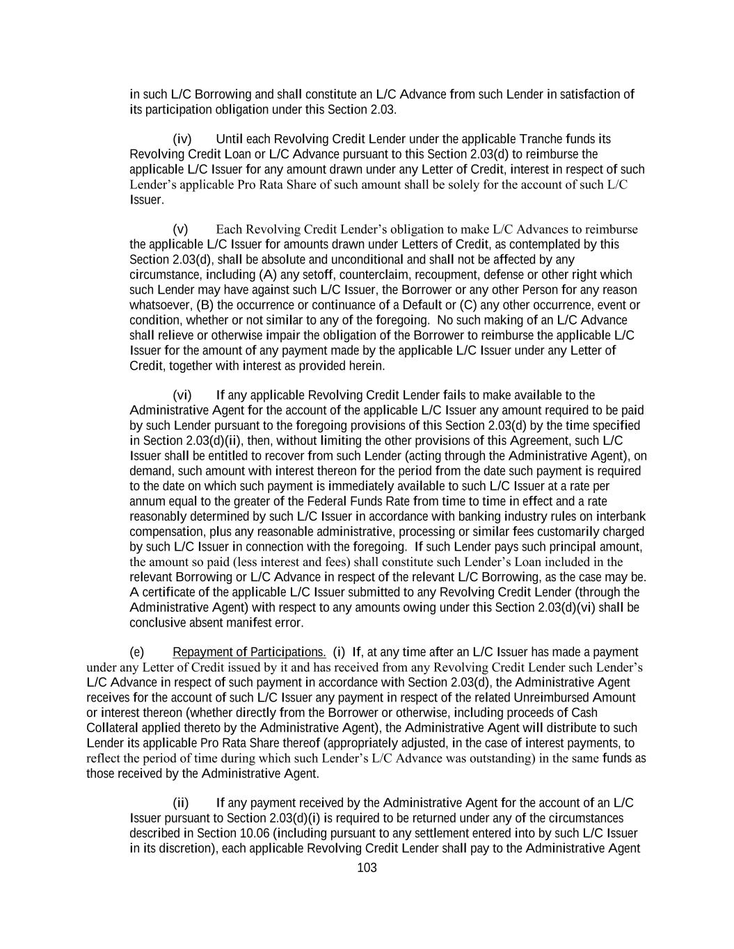 210 L/C Issuer, the Swingline Lender or any Lender, in each case in their capacities as such, exercises its right of setoff, and such payment or the proceeds of such setoff or any part thereof is subsequently invalidated, declared to be or avoided as fraudulent or preferential, set aside or required (including pursuant to any settlement entered into by such Agent, such L/C Issuer, the Swingline Lender or such Lender in its discretion) to be repaid to a trustee, debtor-in-possession, receiver or any other party, in connection with any proceeding under any Debtor Relief Law or otherwise, then (a) to the extent of such recovery, the obligation or part thereof originally intended to be satisfied shall be revived and continued in full force and effect as if such payment had not been made or such setoff had not occurred, and (b) each Lender and each L/C Issuer severally agrees to pay to the Administrative Agent upon demand its applicable share (without duplication) of any amount so recovered from or repaid by any Agent, plus interest thereon from the date of such demand to the date such payment is made at a rate per annum equal to the Federal Funds Rate from time to time in effect. The obligations of the Lenders, the Swingline Lender and the L/C Issuers under clause (b) of the preceding sentence shall survive the payment in full of the Obligations and the termination of this Agreement. Section 10.07 Successors and Assigns. (a) The provisions of this Agreement shall be binding upon and inure to the benefit of the parties hereto and their respective successors and assigns permitted hereby, except that the Borrower may not assign or otherwise transfer any of its rights or obligations hereunder without the prior written consent of the Administrative Agent and each Lender, and no Lender may assign or otherwise transfer any of its rights or obligations hereunder except (i) to an Eligible Assignee (other than to any Disqualified Institution) in accordance with the provisions of Section 10.07(b), (ii) by way of participation in accordance with the provisions of Section 10.07(d), (iii) by way of pledge or assignment of a security interest subject to the restrictions of Section 10.07(f) or (iv) to an SPC in accordance with the provisions of Section 10.07(g) (and any other attempted assignment or transfer by any party hereto shall be null and void). Nothing in this Agreement, expressed or implied, shall be construed to confer upon any Person (other than the parties hereto, their respective successors and assigns permitted hereby, Participants to the extent provided in Section 10.07(d) and, to the extent expressly contemplated hereby, the Indemnitees) any legal or equitable right, remedy or claim under or by reason of this Agreement. (b) Any Lender may at any time assign to one or more Eligible Assignees all or a portion of its rights and obligations under this Agreement (including all or a portion of its Commitment(s) and the Loans (including, for purposes of this Section 10.07(b), participations in L/C Obligations and Swingline Loans) at the time owing to it); provided that: (i) (A) in the case of an assignment of the entire remaining amount of the assigning Lender’s Commitment under any Facility and the Loans at the time owing to it under such Facility no minimum amount shall need be assigned, (B) in the case of an Existing Lender Assignment no minimum amount shall need be assigned, and (C) in any case not described in clause (b)(i)(A) and (B) of this Section 10.07, the aggregate amount of the Commitment (which for this purpose includes Loans outstanding thereunder) or, if the applicable Commitment is not then in effect, the outstanding principal balance of the Loans of the assigning Lender subject to each such assignment, determined as of the date the Assignment and Assumption with respect to such assignment is delivered to the Administrative Agent or, if “Trade Date” is specified in the Assignment and Assumption, as of the Trade Date, shall not be less than $1,000,000 unless each of the Administrative Agent and the Borrower otherwise consents; provided, however, that concurrent assignments to members of an Assignee Group and concurrent assignments from members of an Assignee Group to a single Eligible Assignee (or to an Eligible Assignee and members of its Assignee Group) will be treated as a single assignment for purposes of determining whether such minimum amount has been met;