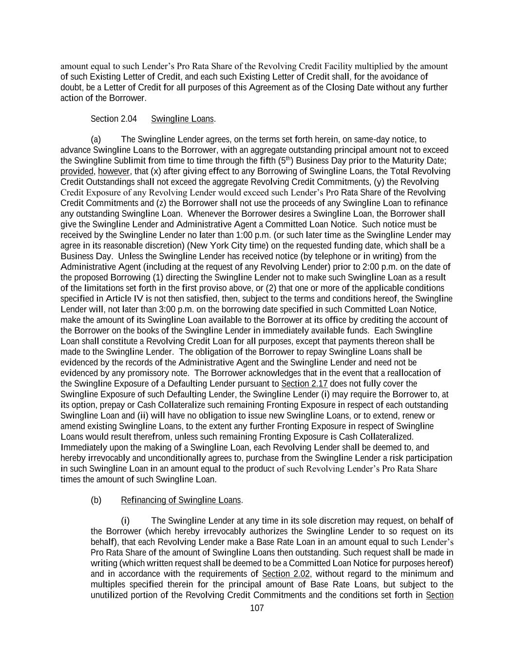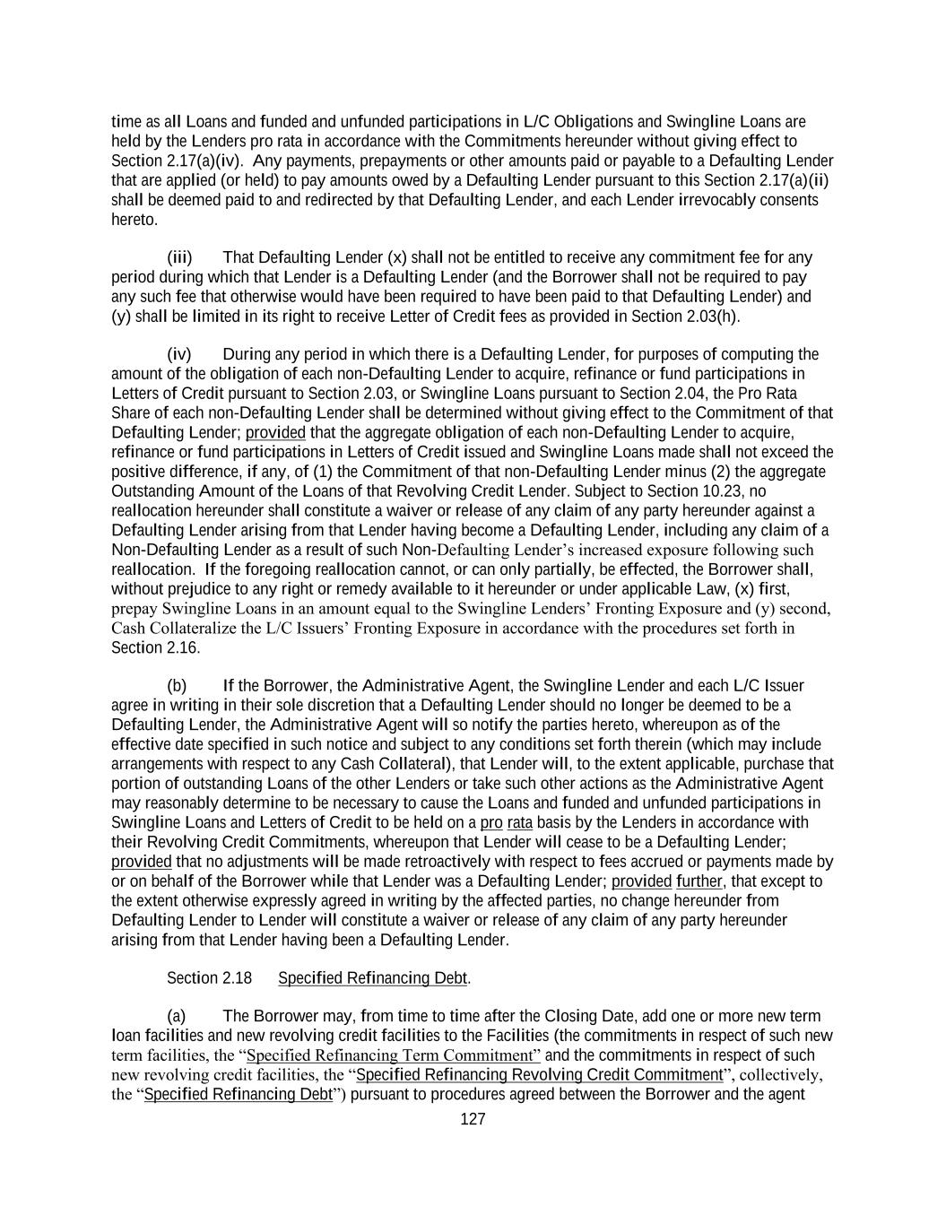 212 (vi) no Revolving Credit Commitments or Revolving Credit Loans may be assigned to any Affiliate Lender; (vii) the assigning Lender shall deliver any Notes or, in lieu thereof, a lost note affidavit and indemnity reasonably acceptable to the Borrower evidencing such Loans to the Borrower or the Administrative Agent; and (viii) in connection with any assignment of rights and obligations of any Defaulting Lender hereunder, no such assignment shall be effective unless and until, in addition to the other conditions thereto set forth herein, the parties to the assignment shall make such additional payments to the Administrative Agent in an aggregate amount sufficient, upon distribution thereof as appropriate (which may be outright payment, purchases by the assignee of participations or subparticipations, or other compensating actions, including funding, with the consent of the Borrower and the Administrative Agent, the applicable Pro Rata Share of Loans previously requested but not funded by the Defaulting Lender, to each of which the applicable assignee and assignor hereby irrevocably consent), to (x) pay and satisfy in full all payment liabilities then owed by such Defaulting Lender to the Administrative Agent or any L/C Issuer, the Swingline Lender or Lender hereunder (and interest accrued thereon) and (y) acquire (and fund as appropriate) its full Pro Rata share of all Loans and participations in Letters of Credit and Swingline Loans in accordance with its Pro Rata Share; provided that notwithstanding the foregoing, in the event that any assignment of rights and obligations of any Defaulting Lender hereunder shall become effective under applicable Law without compliance with the provisions of this clause, then the assignee of such interest shall be deemed to be a Defaulting Lender for all purposes of this Agreement until such compliance occurs. Subject to acceptance and recording thereof by the Administrative Agent pursuant to Section 10.07(c), from and after the effective date specified in each Assignment and Assumption, the Eligible Assignee thereunder shall be a party to this Agreement and, to the extent of the interest assigned by such Assignment and Assumption, have the rights and obligations of a Lender under this Agreement, and the assigning Lender thereunder shall, to the extent of the interest assigned by such Assignment and Assumption, be released from its obligations under this Agreement (and, in the case of an Assignment and Assumption covering all of the assigning Lender’s rights and obligations under this Agreement, such Lender shall cease to be a party hereto but shall continue to be entitled to the benefits of Sections 3.01, 3.04, 3.05, 10.04 and 10.05 with respect to facts and circumstances occurring prior to the effective date of such assignment, and subject to the obligations set forth in Section 10.08). Upon request, and the surrender by the assigning Lender of its Note (or, in lieu thereof, a lost note affidavit and indemnity reasonably acceptable to the Borrower), the Borrower (at its expense) shall execute and deliver a Note to the assignee Lender. Any assignment or transfer by a Lender of rights or obligations under this Agreement (other than any purported assignment or transfer to a Disqualified Institution) that does not comply with this clause (b) shall be treated for purposes of this Agreement as a sale by such Lender of a participation in such rights and obligations in accordance with Section 10.07(d). In connection with any prospective assignment, each assigning Lender shall deliver to the Borrower a copy of its request (including the name of the prospective assignee) for assignment at the time the Administrative Agent is notified of the prospective assignment, irrespective of the existence or non-existence of a Specified Event of Default. (c) The Administrative Agent, acting solely for this purpose as a non-fiduciary agent of the Borrower, shall maintain at the Administrative Agent’s Office a copy of each Assignment and Assumption delivered to it and a register in which it shall record the names and addresses of the Lenders, and the Commitments of, and principal amounts (and related interest amounts) of the Loans, L/C Obligations (specifying the Unreimbursed Amounts), L/C Borrowings and amounts due under Section 2.03, owing to each Lender pursuant to the terms hereof from time to time (the “Register”). The entries in