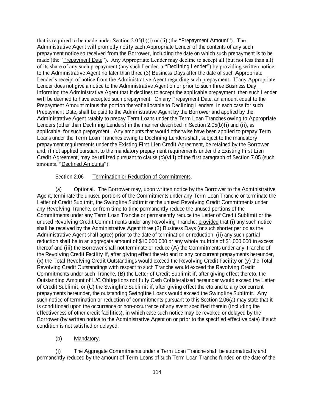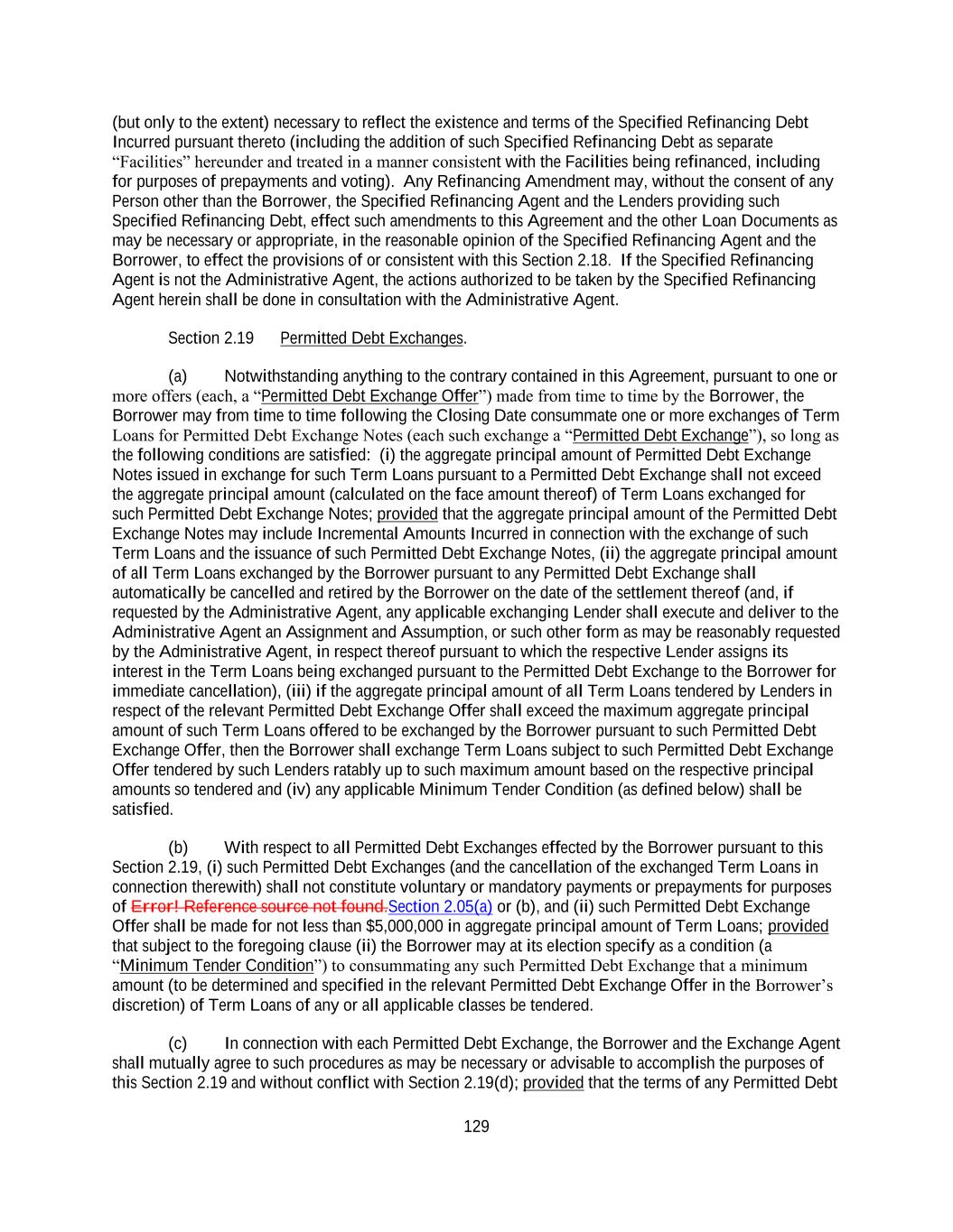 129 (but only to the extent) necessary to reflect the existence and terms of the Specified Refinancing Debt Incurred pursuant thereto (including the addition of such Specified Refinancing Debt as separate “Facilities” hereunder and treated in a manner consistent with the Facilities being refinanced, including for purposes of prepayments and voting). Any Refinancing Amendment may, without the consent of any Person other than the Borrower, the Specified Refinancing Agent and the Lenders providing such Specified Refinancing Debt, effect such amendments to this Agreement and the other Loan Documents as may be necessary or appropriate, in the reasonable opinion of the Specified Refinancing Agent and the Borrower, to effect the provisions of or consistent with this Section 2.18. If the Specified Refinancing Agent is not the Administrative Agent, the actions authorized to be taken by the Specified Refinancing Agent herein shall be done in consultation with the Administrative Agent. Section 2.19 Permitted Debt Exchanges. (a) Notwithstanding anything to the contrary contained in this Agreement, pursuant to one or more offers (each, a “Permitted Debt Exchange Offer”) made from time to time by the Borrower, the Borrower may from time to time following the Closing Date consummate one or more exchanges of Term Loans for Permitted Debt Exchange Notes (each such exchange a “Permitted Debt Exchange”), so long as the following conditions are satisfied: (i) the aggregate principal amount of Permitted Debt Exchange Notes issued in exchange for such Term Loans pursuant to a Permitted Debt Exchange shall not exceed the aggregate principal amount (calculated on the face amount thereof) of Term Loans exchanged for such Permitted Debt Exchange Notes; provided that the aggregate principal amount of the Permitted Debt Exchange Notes may include Incremental Amounts Incurred in connection with the exchange of such Term Loans and the issuance of such Permitted Debt Exchange Notes, (ii) the aggregate principal amount of all Term Loans exchanged by the Borrower pursuant to any Permitted Debt Exchange shall automatically be cancelled and retired by the Borrower on the date of the settlement thereof (and, if requested by the Administrative Agent, any applicable exchanging Lender shall execute and deliver to the Administrative Agent an Assignment and Assumption, or such other form as may be reasonably requested by the Administrative Agent, in respect thereof pursuant to which the respective Lender assigns its interest in the Term Loans being exchanged pursuant to the Permitted Debt Exchange to the Borrower for immediate cancellation), (iii) if the aggregate principal amount of all Term Loans tendered by Lenders in respect of the relevant Permitted Debt Exchange Offer shall exceed the maximum aggregate principal amount of such Term Loans offered to be exchanged by the Borrower pursuant to such Permitted Debt Exchange Offer, then the Borrower shall exchange Term Loans subject to such Permitted Debt Exchange Offer tendered by such Lenders ratably up to such maximum amount based on the respective principal amounts so tendered and (iv) any applicable Minimum Tender Condition (as defined below) shall be satisfied. (b) With respect to all Permitted Debt Exchanges effected by the Borrower pursuant to this Section 2.19, (i) such Permitted Debt Exchanges (and the cancellation of the exchanged Term Loans in connection therewith) shall not constitute voluntary or mandatory payments or prepayments for purposes of Error! Reference source not found.Section 2.05(a) or (b), and (ii) such Permitted Debt Exchange Offer shall be made for not less than $5,000,000 in aggregate principal amount of Term Loans; provided that subject to the foregoing clause (ii) the Borrower may at its election specify as a condition (a “Minimum Tender Condition”) to consummating any such Permitted Debt Exchange that a minimum amount (to be determined and specified in the relevant Permitted Debt Exchange Offer in the Borrower’s discretion) of Term Loans of any or all applicable classes be tendered. (c) In connection with each Permitted Debt Exchange, the Borrower and the Exchange Agent shall mutually agree to such procedures as may be necessary or advisable to accomplish the purposes of this Section 2.19 and without conflict with Section 2.19(d); provided that the terms of any Permitted Debt