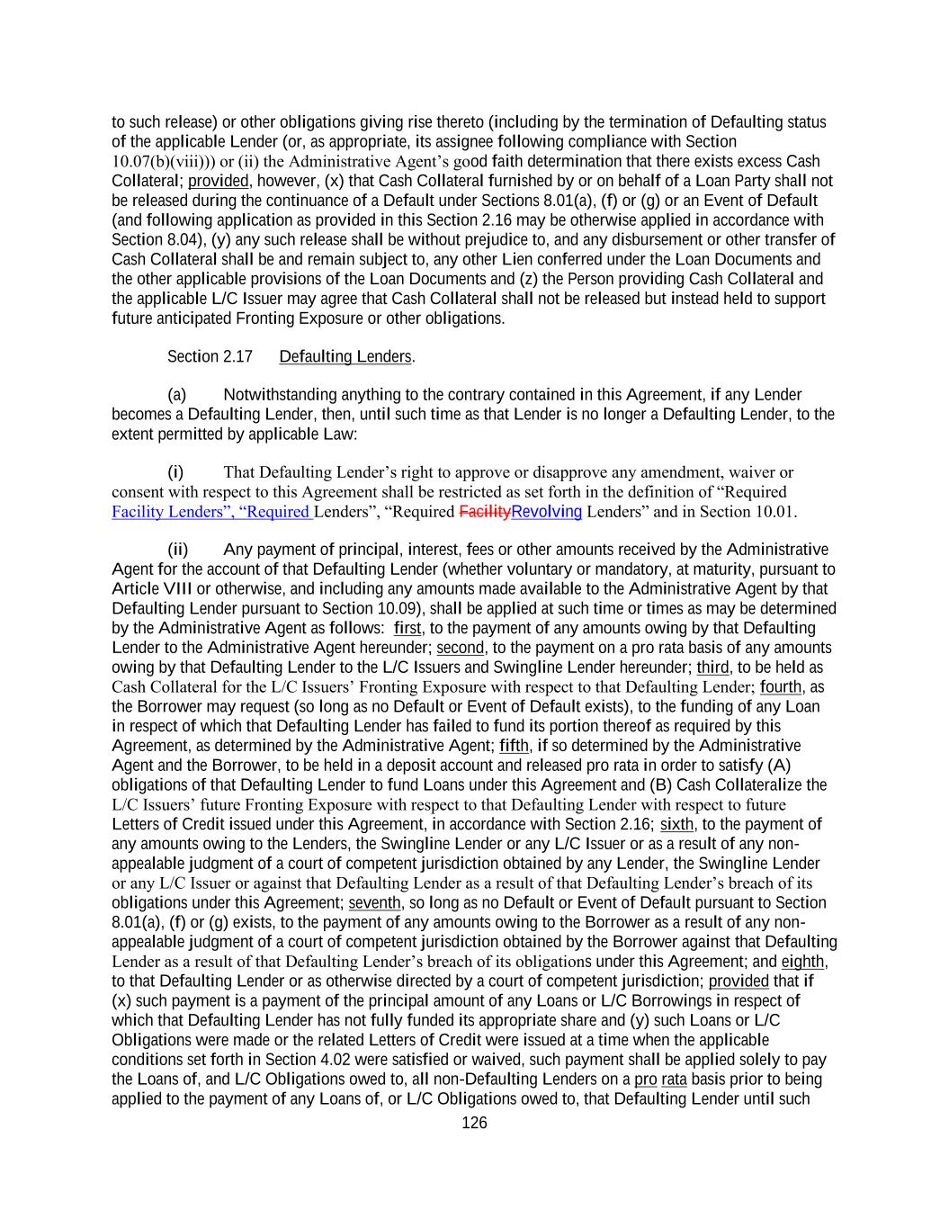137 replacement or termination shall be sufficient (together with all other consenting Lenders including any other Replaceable Lender) to cause the adoption of the applicable modification, waiver or amendment of the Loan Documents and (ii) in the case of any such replacement as a result of the Borrower having become obligated to pay amounts described in Sections 3.01 or 3.05, such replacement would eliminate or reduce payments pursuant to Sections 3.01 or 3.05, as applicable, in the future. Any Lender being replaced pursuant to this Section 3.08(a) shall (i) execute and deliver an Assignment and Assumption with respect to such Lender’s Commitment and outstanding Loans and participations in Swingline Loans and L/C Obligations and (ii) deliver any Notes evidencing such Loans to the Borrower (for return to the Borrower) or the Administrative Agent. Pursuant to such Assignment and Assumption, (A) the assignee Lender shall acquire all or a portion, as the case may be, of the assigning Lender’s Commitment and outstanding Loans and participations in Swingline Loans and L/C Obligations, (B) all Obligations relating to the Loans and participations (and the amount of all accrued interest, fees and premiums in respect thereof) so assigned shall be paid in full by the assignee Lender to such assigning Lender concurrently with such assignment and assumption and (C) upon such payment and, if so requested by the assignee Lender, the assigning Lender shall deliver to the assignee Lender the applicable Note or Notes executed by the Borrower, the assignee Lender shall become a Lender hereunder and the assigning Lender shall cease to constitute a Lender hereunder with respect to such assigned Loans, Commitments and participations, except with respect to indemnification provisions under this Agreement, which shall survive as to such assigning Lender. In connection with any such replacement, if any such Replaceable Lender does not execute and deliver to the Administrative Agent a duly executed Assignment and Assumption reflecting such replacement within two Business Days of the date on which the assignee Lender executes and delivers such Assignment and Assumption to such Replaceable Lender, then such Replaceable Lender shall be deemed to have executed and delivered such Assignment and Assumption without any action on the part of the Replaceable Lender. In connection with the replacement of any Lender pursuant to this Section 3.08(a), the Borrower shall pay to such Lender such amounts as may be required pursuant to Section 3.06. (b) Notwithstanding anything to the contrary contained above, (i) any Lender that acts as an L/C Issuer may not be replaced hereunder at any time that it has any Letter of Credit outstanding hereunder unless arrangements satisfactory to such L/C Issuer (including the furnishing of a back-up standby letter of credit in form and substance, and issued by an issuer reasonably satisfactory to such L/C Issuer or the depositing of Cash Collateral into a Cash Collateral account in amounts and pursuant to arrangements consistent with the requirements of Section 2.16) have been made with respect to such outstanding Letter of Credit, (ii) the Lender that acts as Swingline Lender may not be replaced hereunder at any time unless all Swingline Loans are repaid in full in cash and (iii) the Lender that acts as the Administrative Agent may not be replaced hereunder except in accordance with the terms of Section 9.09. (c) In the event that (i) the Borrower or the Administrative Agent has requested the Lenders to consent to a waiver of any provisions of the Loan Documents or to agree to any amendment or other modification thereto, (ii) the waiver, amendment or modification in question requires the agreement of all affected Lenders in accordance with the terms of Section 10.01 or all the Lenders with respect to a certain class of the Loans and (iii) the Required Lenders (or Required Facility Lenders, as applicable) have agreed to such waiver, amendment or modification, then any Lender who does not agree to such waiver, amendment or modification, in each case, shall be deemed a “Non-Consenting Lender”; provided, that the term “Non-Consenting Lender” shall also include any Lender that rejects (or is deemed to reject) (x) a loan modification offer under Section 10.01, which loan modification has been accepted by at least the Required Facility Lenders of the respective Tranche of Loans whose Loans and/or Commitments are to be extended pursuant to such loan modification and (y) any Lender that does not elect to become a lender in respect of any Specified Refinancing Debt pursuant to Section 2.18.