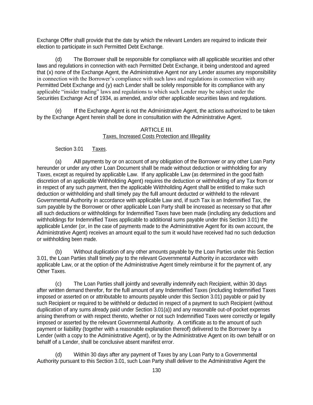 130 Exchange Offer shall provide that the date by which the relevant Lenders are required to indicate their election to participate in such Permitted Debt Exchange. (d) The Borrower shall be responsible for compliance with all applicable securities and other laws and regulations in connection with each Permitted Debt Exchange, it being understood and agreed that (x) none of the Exchange Agent, the Administrative Agent nor any Lender assumes any responsibility in connection with the Borrower’s compliance with such laws and regulations in connection with any Permitted Debt Exchange and (y) each Lender shall be solely responsible for its compliance with any applicable “insider trading” laws and regulations to which such Lender may be subject under the Securities Exchange Act of 1934, as amended, and/or other applicable securities laws and regulations. (e) If the Exchange Agent is not the Administrative Agent, the actions authorized to be taken by the Exchange Agent herein shall be done in consultation with the Administrative Agent. ARTICLE III. Taxes, Increased Costs Protection and Illegality Section 3.01 Taxes. (a) All payments by or on account of any obligation of the Borrower or any other Loan Party hereunder or under any other Loan Document shall be made without deduction or withholding for any Taxes, except as required by applicable Law. If any applicable Law (as determined in the good faith discretion of an applicable Withholding Agent) requires the deduction or withholding of any Tax from or in respect of any such payment, then the applicable Withholding Agent shall be entitled to make such deduction or withholding and shall timely pay the full amount deducted or withheld to the relevant Governmental Authority in accordance with applicable Law and, if such Tax is an Indemnified Tax, the sum payable by the Borrower or other applicable Loan Party shall be increased as necessary so that after all such deductions or withholdings for Indemnified Taxes have been made (including any deductions and withholdings for Indemnified Taxes applicable to additional sums payable under this Section 3.01) the applicable Lender (or, in the case of payments made to the Administrative Agent for its own account, the Administrative Agent) receives an amount equal to the sum it would have received had no such deduction or withholding been made. (b) Without duplication of any other amounts payable by the Loan Parties under this Section 3.01, the Loan Parties shall timely pay to the relevant Governmental Authority in accordance with applicable Law, or at the option of the Administrative Agent timely reimburse it for the payment of, any Other Taxes. (c) The Loan Parties shall jointly and severally indemnify each Recipient, within 30 days after written demand therefor, for the full amount of any Indemnified Taxes (including Indemnified Taxes imposed or asserted on or attributable to amounts payable under this Section 3.01) payable or paid by such Recipient or required to be withheld or deducted in respect of a payment to such Recipient (without duplication of any sums already paid under Section 3.01(a)) and any reasonable out-of-pocket expenses arising therefrom or with respect thereto, whether or not such Indemnified Taxes were correctly or legally imposed or asserted by the relevant Governmental Authority. A certificate as to the amount of such payment or liability (together with a reasonable explanation thereof) delivered to the Borrower by a Lender (with a copy to the Administrative Agent), or by the Administrative Agent on its own behalf or on behalf of a Lender, shall be conclusive absent manifest error. (d) Within 30 days after any payment of Taxes by any Loan Party to a Governmental Authority pursuant to this Section 3.01, such Loan Party shall deliver to the Administrative Agent the