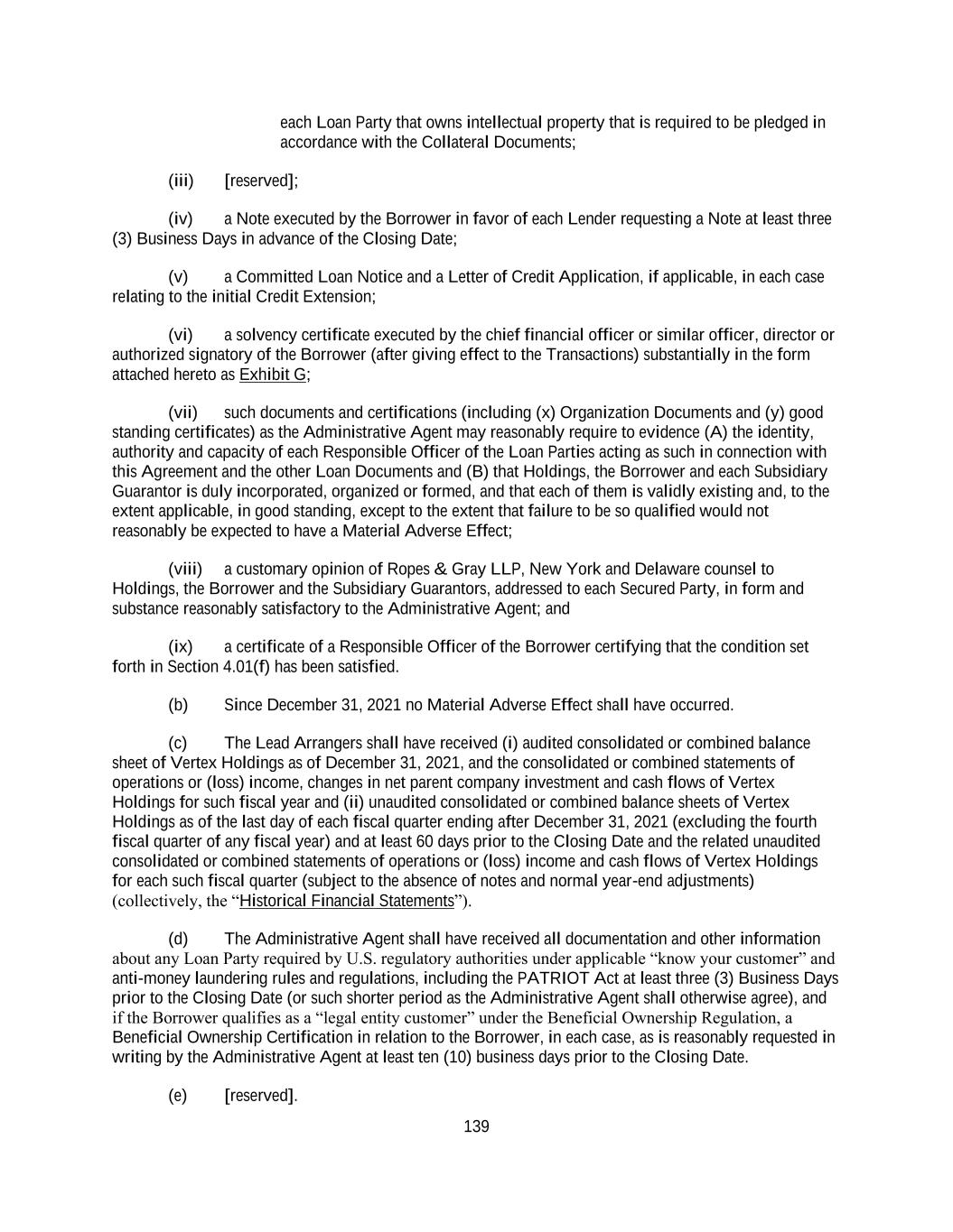 139 each Loan Party that owns intellectual property that is required to be pledged in accordance with the Collateral Documents; (iii) [reserved]; (iv) a Note executed by the Borrower in favor of each Lender requesting a Note at least three (3) Business Days in advance of the Closing Date; (v) a Committed Loan Notice and a Letter of Credit Application, if applicable, in each case relating to the initial Credit Extension; (vi) a solvency certificate executed by the chief financial officer or similar officer, director or authorized signatory of the Borrower (after giving effect to the Transactions) substantially in the form attached hereto as Exhibit G; (vii) such documents and certifications (including (x) Organization Documents and (y) good standing certificates) as the Administrative Agent may reasonably require to evidence (A) the identity, authority and capacity of each Responsible Officer of the Loan Parties acting as such in connection with this Agreement and the other Loan Documents and (B) that Holdings, the Borrower and each Subsidiary Guarantor is duly incorporated, organized or formed, and that each of them is validly existing and, to the extent applicable, in good standing, except to the extent that failure to be so qualified would not reasonably be expected to have a Material Adverse Effect; (viii) a customary opinion of Ropes & Gray LLP, New York and Delaware counsel to Holdings, the Borrower and the Subsidiary Guarantors, addressed to each Secured Party, in form and substance reasonably satisfactory to the Administrative Agent; and (ix) a certificate of a Responsible Officer of the Borrower certifying that the condition set forth in Section 4.01(f) has been satisfied. (b) Since December 31, 2021 no Material Adverse Effect shall have occurred. (c) The Lead Arrangers shall have received (i) audited consolidated or combined balance sheet of Vertex Holdings as of December 31, 2021, and the consolidated or combined statements of operations or (loss) income, changes in net parent company investment and cash flows of Vertex Holdings for such fiscal year and (ii) unaudited consolidated or combined balance sheets of Vertex Holdings as of the last day of each fiscal quarter ending after December 31, 2021 (excluding the fourth fiscal quarter of any fiscal year) and at least 60 days prior to the Closing Date and the related unaudited consolidated or combined statements of operations or (loss) income and cash flows of Vertex Holdings for each such fiscal quarter (subject to the absence of notes and normal year-end adjustments) (collectively, the “Historical Financial Statements”). (d) The Administrative Agent shall have received all documentation and other information about any Loan Party required by U.S. regulatory authorities under applicable “know your customer” and anti-money laundering rules and regulations, including the PATRIOT Act at least three (3) Business Days prior to the Closing Date (or such shorter period as the Administrative Agent shall otherwise agree), and if the Borrower qualifies as a “legal entity customer” under the Beneficial Ownership Regulation, a Beneficial Ownership Certification in relation to the Borrower, in each case, as is reasonably requested in writing by the Administrative Agent at least ten (10) business days prior to the Closing Date. (e) [reserved].