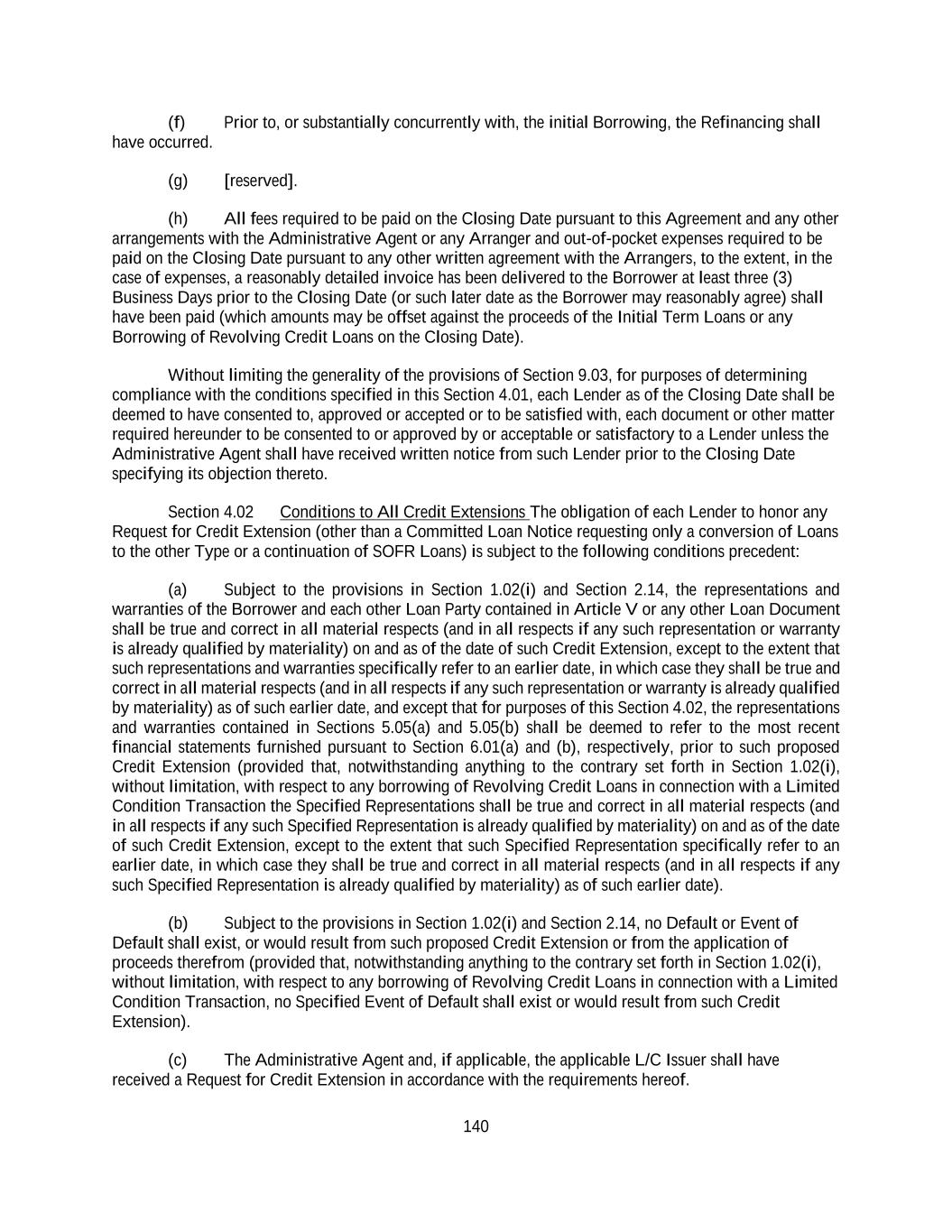 140 (f) Prior to, or substantially concurrently with, the initial Borrowing, the Refinancing shall have occurred. (g) [reserved]. (h) All fees required to be paid on the Closing Date pursuant to this Agreement and any other arrangements with the Administrative Agent or any Arranger and out-of-pocket expenses required to be paid on the Closing Date pursuant to any other written agreement with the Arrangers, to the extent, in the case of expenses, a reasonably detailed invoice has been delivered to the Borrower at least three (3) Business Days prior to the Closing Date (or such later date as the Borrower may reasonably agree) shall have been paid (which amounts may be offset against the proceeds of the Initial Term Loans or any Borrowing of Revolving Credit Loans on the Closing Date). Without limiting the generality of the provisions of Section 9.03, for purposes of determining compliance with the conditions specified in this Section 4.01, each Lender as of the Closing Date shall be deemed to have consented to, approved or accepted or to be satisfied with, each document or other matter required hereunder to be consented to or approved by or acceptable or satisfactory to a Lender unless the Administrative Agent shall have received written notice from such Lender prior to the Closing Date specifying its objection thereto. Section 4.02 Conditions to All Credit Extensions The obligation of each Lender to honor any Request for Credit Extension (other than a Committed Loan Notice requesting only a conversion of Loans to the other Type or a continuation of SOFR Loans) is subject to the following conditions precedent: (a) Subject to the provisions in Section 1.02(i) and Section 2.14, the representations and warranties of the Borrower and each other Loan Party contained in Article V or any other Loan Document shall be true and correct in all material respects (and in all respects if any such representation or warranty is already qualified by materiality) on and as of the date of such Credit Extension, except to the extent that such representations and warranties specifically refer to an earlier date, in which case they shall be true and correct in all material respects (and in all respects if any such representation or warranty is already qualified by materiality) as of such earlier date, and except that for purposes of this Section 4.02, the representations and warranties contained in Sections 5.05(a) and 5.05(b) shall be deemed to refer to the most recent financial statements furnished pursuant to Section 6.01(a) and (b), respectively, prior to such proposed Credit Extension (provided that, notwithstanding anything to the contrary set forth in Section 1.02(i), without limitation, with respect to any borrowing of Revolving Credit Loans in connection with a Limited Condition Transaction the Specified Representations shall be true and correct in all material respects (and in all respects if any such Specified Representation is already qualified by materiality) on and as of the date of such Credit Extension, except to the extent that such Specified Representation specifically refer to an earlier date, in which case they shall be true and correct in all material respects (and in all respects if any such Specified Representation is already qualified by materiality) as of such earlier date). (b) Subject to the provisions in Section 1.02(i) and Section 2.14, no Default or Event of Default shall exist, or would result from such proposed Credit Extension or from the application of proceeds therefrom (provided that, notwithstanding anything to the contrary set forth in Section 1.02(i), without limitation, with respect to any borrowing of Revolving Credit Loans in connection with a Limited Condition Transaction, no Specified Event of Default shall exist or would result from such Credit Extension). (c) The Administrative Agent and, if applicable, the applicable L/C Issuer shall have received a Request for Credit Extension in accordance with the requirements hereof.