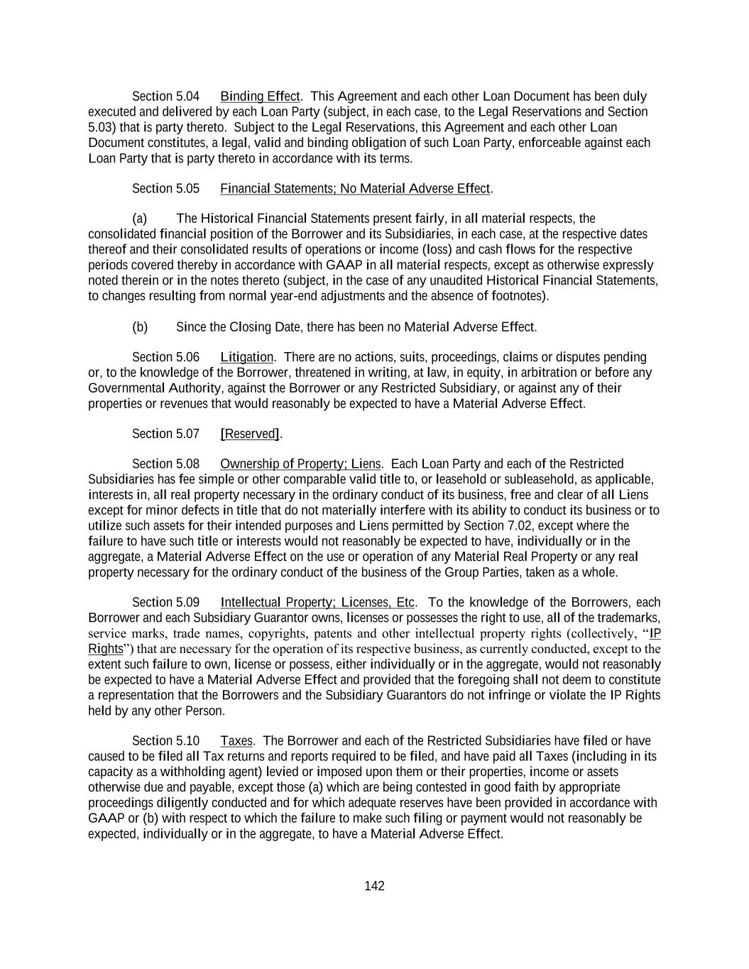 142 Section 5.04 Binding Effect. This Agreement and each other Loan Document has been duly executed and delivered by each Loan Party (subject, in each case, to the Legal Reservations and Section 5.03) that is party thereto. Subject to the Legal Reservations, this Agreement and each other Loan Document constitutes, a legal, valid and binding obligation of such Loan Party, enforceable against each Loan Party that is party thereto in accordance with its terms. Section 5.05 Financial Statements; No Material Adverse Effect. (a) The Historical Financial Statements present fairly, in all material respects, the consolidated financial position of the Borrower and its Subsidiaries, in each case, at the respective dates thereof and their consolidated results of operations or income (loss) and cash flows for the respective periods covered thereby in accordance with GAAP in all material respects, except as otherwise expressly noted therein or in the notes thereto (subject, in the case of any unaudited Historical Financial Statements, to changes resulting from normal year-end adjustments and the absence of footnotes). (b) Since the Closing Date, there has been no Material Adverse Effect. Section 5.06 Litigation. There are no actions, suits, proceedings, claims or disputes pending or, to the knowledge of the Borrower, threatened in writing, at law, in equity, in arbitration or before any Governmental Authority, against the Borrower or any Restricted Subsidiary, or against any of their properties or revenues that would reasonably be expected to have a Material Adverse Effect. Section 5.07 [Reserved]. Section 5.08 Ownership of Property; Liens. Each Loan Party and each of the Restricted Subsidiaries has fee simple or other comparable valid title to, or leasehold or subleasehold, as applicable, interests in, all real property necessary in the ordinary conduct of its business, free and clear of all Liens except for minor defects in title that do not materially interfere with its ability to conduct its business or to utilize such assets for their intended purposes and Liens permitted by Section 7.02, except where the failure to have such title or interests would not reasonably be expected to have, individually or in the aggregate, a Material Adverse Effect on the use or operation of any Material Real Property or any real property necessary for the ordinary conduct of the business of the Group Parties, taken as a whole. Section 5.09 Intellectual Property; Licenses, Etc. To the knowledge of the Borrowers, each Borrower and each Subsidiary Guarantor owns, licenses or possesses the right to use, all of the trademarks, service marks, trade names, copyrights, patents and other intellectual property rights (collectively, “IP Rights”) that are necessary for the operation of its respective business, as currently conducted, except to the extent such failure to own, license or possess, either individually or in the aggregate, would not reasonably be expected to have a Material Adverse Effect and provided that the foregoing shall not deem to constitute a representation that the Borrowers and the Subsidiary Guarantors do not infringe or violate the IP Rights held by any other Person. Section 5.10 Taxes. The Borrower and each of the Restricted Subsidiaries have filed or have caused to be filed all Tax returns and reports required to be filed, and have paid all Taxes (including in its capacity as a withholding agent) levied or imposed upon them or their properties, income or assets otherwise due and payable, except those (a) which are being contested in good faith by appropriate proceedings diligently conducted and for which adequate reserves have been provided in accordance with GAAP or (b) with respect to which the failure to make such filing or payment would not reasonably be expected, individually or in the aggregate, to have a Material Adverse Effect.