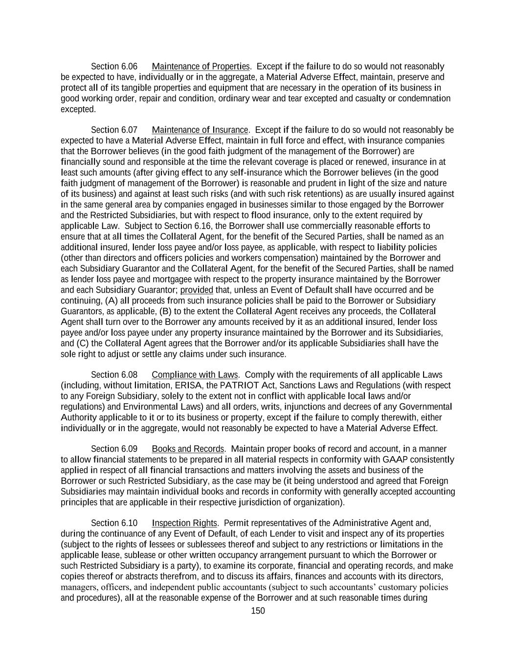 150 Section 6.06 Maintenance of Properties. Except if the failure to do so would not reasonably be expected to have, individually or in the aggregate, a Material Adverse Effect, maintain, preserve and protect all of its tangible properties and equipment that are necessary in the operation of its business in good working order, repair and condition, ordinary wear and tear excepted and casualty or condemnation excepted. Section 6.07 Maintenance of Insurance. Except if the failure to do so would not reasonably be expected to have a Material Adverse Effect, maintain in full force and effect, with insurance companies that the Borrower believes (in the good faith judgment of the management of the Borrower) are financially sound and responsible at the time the relevant coverage is placed or renewed, insurance in at least such amounts (after giving effect to any self-insurance which the Borrower believes (in the good faith judgment of management of the Borrower) is reasonable and prudent in light of the size and nature of its business) and against at least such risks (and with such risk retentions) as are usually insured against in the same general area by companies engaged in businesses similar to those engaged by the Borrower and the Restricted Subsidiaries, but with respect to flood insurance, only to the extent required by applicable Law. Subject to Section 6.16, the Borrower shall use commercially reasonable efforts to ensure that at all times the Collateral Agent, for the benefit of the Secured Parties, shall be named as an additional insured, lender loss payee and/or loss payee, as applicable, with respect to liability policies (other than directors and officers policies and workers compensation) maintained by the Borrower and each Subsidiary Guarantor and the Collateral Agent, for the benefit of the Secured Parties, shall be named as lender loss payee and mortgagee with respect to the property insurance maintained by the Borrower and each Subsidiary Guarantor; provided that, unless an Event of Default shall have occurred and be continuing, (A) all proceeds from such insurance policies shall be paid to the Borrower or Subsidiary Guarantors, as applicable, (B) to the extent the Collateral Agent receives any proceeds, the Collateral Agent shall turn over to the Borrower any amounts received by it as an additional insured, lender loss payee and/or loss payee under any property insurance maintained by the Borrower and its Subsidiaries, and (C) the Collateral Agent agrees that the Borrower and/or its applicable Subsidiaries shall have the sole right to adjust or settle any claims under such insurance. Section 6.08 Compliance with Laws. Comply with the requirements of all applicable Laws (including, without limitation, ERISA, the PATRIOT Act, Sanctions Laws and Regulations (with respect to any Foreign Subsidiary, solely to the extent not in conflict with applicable local laws and/or regulations) and Environmental Laws) and all orders, writs, injunctions and decrees of any Governmental Authority applicable to it or to its business or property, except if the failure to comply therewith, either individually or in the aggregate, would not reasonably be expected to have a Material Adverse Effect. Section 6.09 Books and Records. Maintain proper books of record and account, in a manner to allow financial statements to be prepared in all material respects in conformity with GAAP consistently applied in respect of all financial transactions and matters involving the assets and business of the Borrower or such Restricted Subsidiary, as the case may be (it being understood and agreed that Foreign Subsidiaries may maintain individual books and records in conformity with generally accepted accounting principles that are applicable in their respective jurisdiction of organization). Section 6.10 Inspection Rights. Permit representatives of the Administrative Agent and, during the continuance of any Event of Default, of each Lender to visit and inspect any of its properties (subject to the rights of lessees or sublessees thereof and subject to any restrictions or limitations in the applicable lease, sublease or other written occupancy arrangement pursuant to which the Borrower or such Restricted Subsidiary is a party), to examine its corporate, financial and operating records, and make copies thereof or abstracts therefrom, and to discuss its affairs, finances and accounts with its directors, managers, officers, and independent public accountants (subject to such accountants’ customary policies and procedures), all at the reasonable expense of the Borrower and at such reasonable times during