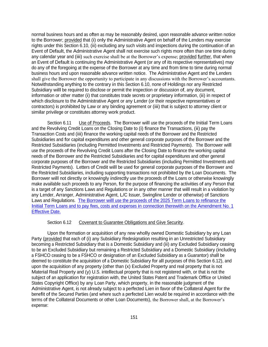 151 normal business hours and as often as may be reasonably desired, upon reasonable advance written notice to the Borrower; provided that (i) only the Administrative Agent on behalf of the Lenders may exercise rights under this Section 6.10, (ii) excluding any such visits and inspections during the continuation of an Event of Default, the Administrative Agent shall not exercise such rights more often than one time during any calendar year and (iii) such exercise shall be at the Borrower’s expense; provided further, that when an Event of Default is continuing the Administrative Agent (or any of its respective representatives) may do any of the foregoing at the expense of the Borrower at any time and from time to time during normal business hours and upon reasonable advance written notice. The Administrative Agent and the Lenders shall give the Borrower the opportunity to participate in any discussions with the Borrower’s accountants. Notwithstanding anything to the contrary in this Section 6.10, none of Holdings nor any Restricted Subsidiary will be required to disclose or permit the inspection or discussion of, any document, information or other matter (i) that constitutes trade secrets or proprietary information, (ii) in respect of which disclosure to the Administrative Agent or any Lender (or their respective representatives or contractors) is prohibited by Law or any binding agreement or (iii) that is subject to attorney client or similar privilege or constitutes attorney work product. Section 6.11 Use of Proceeds. The Borrower will use the proceeds of the Initial Term Loans and the Revolving Credit Loans on the Closing Date to (i) finance the Transactions, (ii) pay the Transaction Costs and (iii) finance the working capital needs of the Borrower and the Restricted Subsidiaries and for capital expenditures and other general corporate purposes of the Borrower and the Restricted Subsidiaries (including Permitted Investments and Restricted Payments). The Borrower will use the proceeds of the Revolving Credit Loans after the Closing Date to finance the working capital needs of the Borrower and the Restricted Subsidiaries and for capital expenditures and other general corporate purposes of the Borrower and the Restricted Subsidiaries (including Permitted Investments and Restricted Payments). Letters of Credit will be used for general corporate purposes of the Borrower and the Restricted Subsidiaries, including supporting transactions not prohibited by the Loan Documents. The Borrower will not directly or knowingly indirectly use the proceeds of the Loans or otherwise knowingly make available such proceeds to any Person, for the purpose of financing the activities of any Person that is a target of any Sanctions Laws and Regulations or in any other manner that will result in a violation by any Lender, Arranger, Administrative Agent, L/C Issuer, Swingline Lender or otherwise) of Sanctions Laws and Regulations. The Borrower will use the proceeds of the 2025 Term Loans to refinance the Initial Term Loans and to pay fees, costs and expenses in connection therewith on the Amendment No. 1 Effective Date. Section 6.12 Covenant to Guarantee Obligations and Give Security. Upon the formation or acquisition of any new wholly owned Domestic Subsidiary by any Loan Party (provided that each of (i) any Subsidiary Redesignation resulting in an Unrestricted Subsidiary becoming a Restricted Subsidiary that is a Domestic Subsidiary and (ii) any Excluded Subsidiary ceasing to be an Excluded Subsidiary but remaining a Restricted Subsidiary and a Domestic Subsidiary (including a FSHCO ceasing to be a FSHCO or designation of an Excluded Subsidiary as a Guarantor) shall be deemed to constitute the acquisition of a Domestic Subsidiary for all purposes of this Section 6.12), and upon the acquisition of any property (other than (x) Excluded Property and real property that is not Material Real Property and (y) U.S. intellectual property that is not registered with, or that is not the subject of an application for registration with, the United States Patent and Trademark Office or United States Copyright Office) by any Loan Party, which property, in the reasonable judgment of the Administrative Agent, is not already subject to a perfected Lien in favor of the Collateral Agent for the benefit of the Secured Parties (and where such a perfected Lien would be required in accordance with the terms of the Collateral Documents or other Loan Documents), the Borrower shall, at the Borrower’s expense: