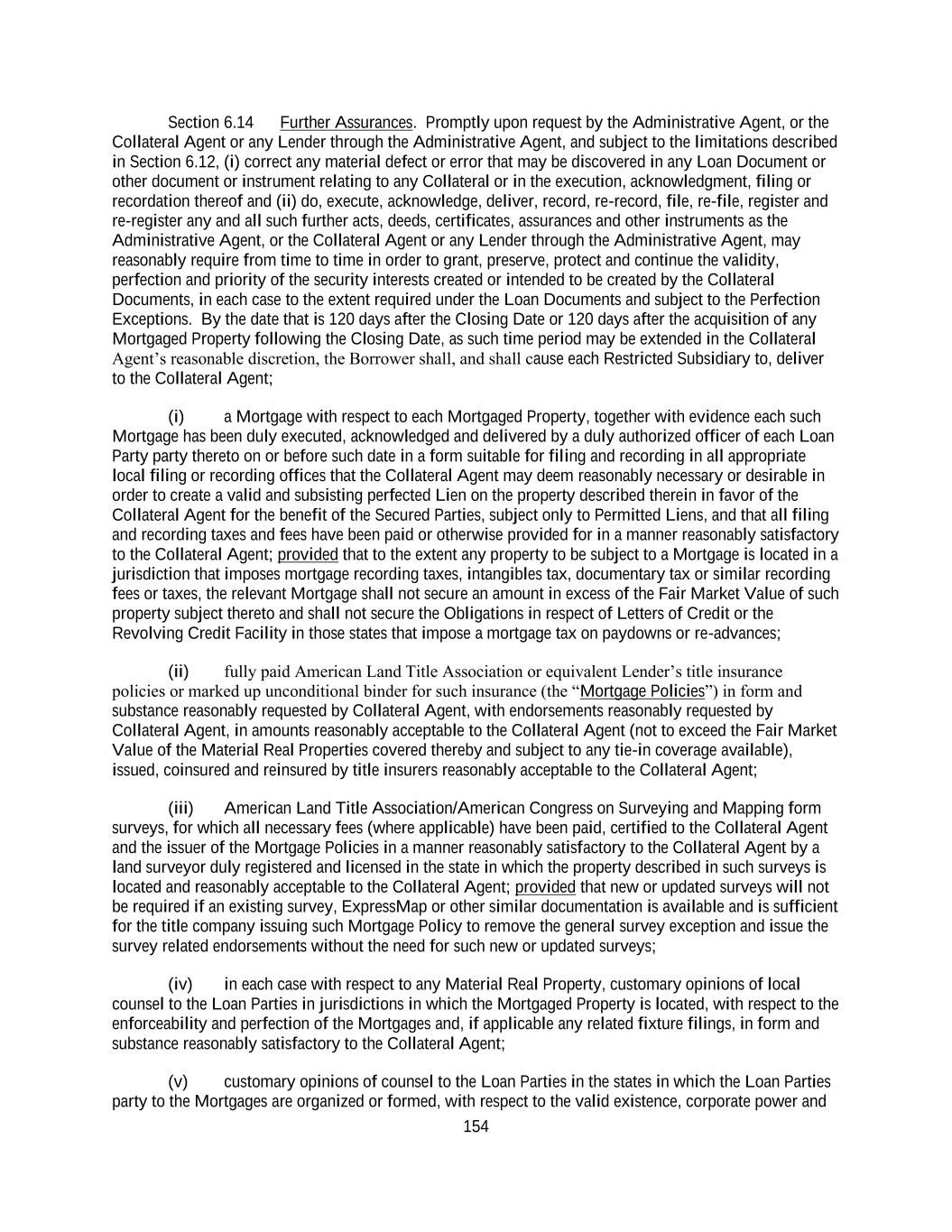 154 Section 6.14 Further Assurances. Promptly upon request by the Administrative Agent, or the Collateral Agent or any Lender through the Administrative Agent, and subject to the limitations described in Section 6.12, (i) correct any material defect or error that may be discovered in any Loan Document or other document or instrument relating to any Collateral or in the execution, acknowledgment, filing or recordation thereof and (ii) do, execute, acknowledge, deliver, record, re-record, file, re-file, register and re-register any and all such further acts, deeds, certificates, assurances and other instruments as the Administrative Agent, or the Collateral Agent or any Lender through the Administrative Agent, may reasonably require from time to time in order to grant, preserve, protect and continue the validity, perfection and priority of the security interests created or intended to be created by the Collateral Documents, in each case to the extent required under the Loan Documents and subject to the Perfection Exceptions. By the date that is 120 days after the Closing Date or 120 days after the acquisition of any Mortgaged Property following the Closing Date, as such time period may be extended in the Collateral Agent’s reasonable discretion, the Borrower shall, and shall cause each Restricted Subsidiary to, deliver to the Collateral Agent; (i) a Mortgage with respect to each Mortgaged Property, together with evidence each such Mortgage has been duly executed, acknowledged and delivered by a duly authorized officer of each Loan Party party thereto on or before such date in a form suitable for filing and recording in all appropriate local filing or recording offices that the Collateral Agent may deem reasonably necessary or desirable in order to create a valid and subsisting perfected Lien on the property described therein in favor of the Collateral Agent for the benefit of the Secured Parties, subject only to Permitted Liens, and that all filing and recording taxes and fees have been paid or otherwise provided for in a manner reasonably satisfactory to the Collateral Agent; provided that to the extent any property to be subject to a Mortgage is located in a jurisdiction that imposes mortgage recording taxes, intangibles tax, documentary tax or similar recording fees or taxes, the relevant Mortgage shall not secure an amount in excess of the Fair Market Value of such property subject thereto and shall not secure the Obligations in respect of Letters of Credit or the Revolving Credit Facility in those states that impose a mortgage tax on paydowns or re-advances; (ii) fully paid American Land Title Association or equivalent Lender’s title insurance policies or marked up unconditional binder for such insurance (the “Mortgage Policies”) in form and substance reasonably requested by Collateral Agent, with endorsements reasonably requested by Collateral Agent, in amounts reasonably acceptable to the Collateral Agent (not to exceed the Fair Market Value of the Material Real Properties covered thereby and subject to any tie-in coverage available), issued, coinsured and reinsured by title insurers reasonably acceptable to the Collateral Agent; (iii) American Land Title Association/American Congress on Surveying and Mapping form surveys, for which all necessary fees (where applicable) have been paid, certified to the Collateral Agent and the issuer of the Mortgage Policies in a manner reasonably satisfactory to the Collateral Agent by a land surveyor duly registered and licensed in the state in which the property described in such surveys is located and reasonably acceptable to the Collateral Agent; provided that new or updated surveys will not be required if an existing survey, ExpressMap or other similar documentation is available and is sufficient for the title company issuing such Mortgage Policy to remove the general survey exception and issue the survey related endorsements without the need for such new or updated surveys; (iv) in each case with respect to any Material Real Property, customary opinions of local counsel to the Loan Parties in jurisdictions in which the Mortgaged Property is located, with respect to the enforceability and perfection of the Mortgages and, if applicable any related fixture filings, in form and substance reasonably satisfactory to the Collateral Agent; (v) customary opinions of counsel to the Loan Parties in the states in which the Loan Parties party to the Mortgages are organized or formed, with respect to the valid existence, corporate power and