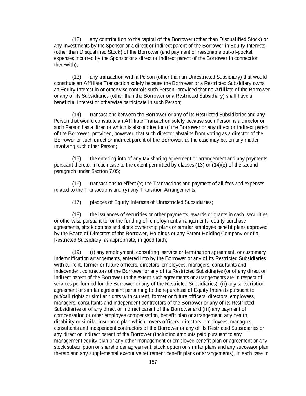 157 (12) any contribution to the capital of the Borrower (other than Disqualified Stock) or any investments by the Sponsor or a direct or indirect parent of the Borrower in Equity Interests (other than Disqualified Stock) of the Borrower (and payment of reasonable out-of-pocket expenses incurred by the Sponsor or a direct or indirect parent of the Borrower in connection therewith); (13) any transaction with a Person (other than an Unrestricted Subsidiary) that would constitute an Affiliate Transaction solely because the Borrower or a Restricted Subsidiary owns an Equity Interest in or otherwise controls such Person; provided that no Affiliate of the Borrower or any of its Subsidiaries (other than the Borrower or a Restricted Subsidiary) shall have a beneficial interest or otherwise participate in such Person; (14) transactions between the Borrower or any of its Restricted Subsidiaries and any Person that would constitute an Affiliate Transaction solely because such Person is a director or such Person has a director which is also a director of the Borrower or any direct or indirect parent of the Borrower; provided, however, that such director abstains from voting as a director of the Borrower or such direct or indirect parent of the Borrower, as the case may be, on any matter involving such other Person; (15) the entering into of any tax sharing agreement or arrangement and any payments pursuant thereto, in each case to the extent permitted by clauses (13) or (14)(e) of the second paragraph under Section 7.05; (16) transactions to effect (x) the Transactions and payment of all fees and expenses related to the Transactions and (y) any Transition Arrangements; (17) pledges of Equity Interests of Unrestricted Subsidiaries; (18) the issuances of securities or other payments, awards or grants in cash, securities or otherwise pursuant to, or the funding of, employment arrangements, equity purchase agreements, stock options and stock ownership plans or similar employee benefit plans approved by the Board of Directors of the Borrower, Holdings or any Parent Holding Company or of a Restricted Subsidiary, as appropriate, in good faith; (19) (i) any employment, consulting, service or termination agreement, or customary indemnification arrangements, entered into by the Borrower or any of its Restricted Subsidiaries with current, former or future officers, directors, employees, managers, consultants and independent contractors of the Borrower or any of its Restricted Subsidiaries (or of any direct or indirect parent of the Borrower to the extent such agreements or arrangements are in respect of services performed for the Borrower or any of the Restricted Subsidiaries), (ii) any subscription agreement or similar agreement pertaining to the repurchase of Equity Interests pursuant to put/call rights or similar rights with current, former or future officers, directors, employees, managers, consultants and independent contractors of the Borrower or any of its Restricted Subsidiaries or of any direct or indirect parent of the Borrower and (iii) any payment of compensation or other employee compensation, benefit plan or arrangement, any health, disability or similar insurance plan which covers officers, directors, employees, managers, consultants and independent contractors of the Borrower or any of its Restricted Subsidiaries or any direct or indirect parent of the Borrower (including amounts paid pursuant to any management equity plan or any other management or employee benefit plan or agreement or any stock subscription or shareholder agreement, stock option or similar plans and any successor plan thereto and any supplemental executive retirement benefit plans or arrangements), in each case in