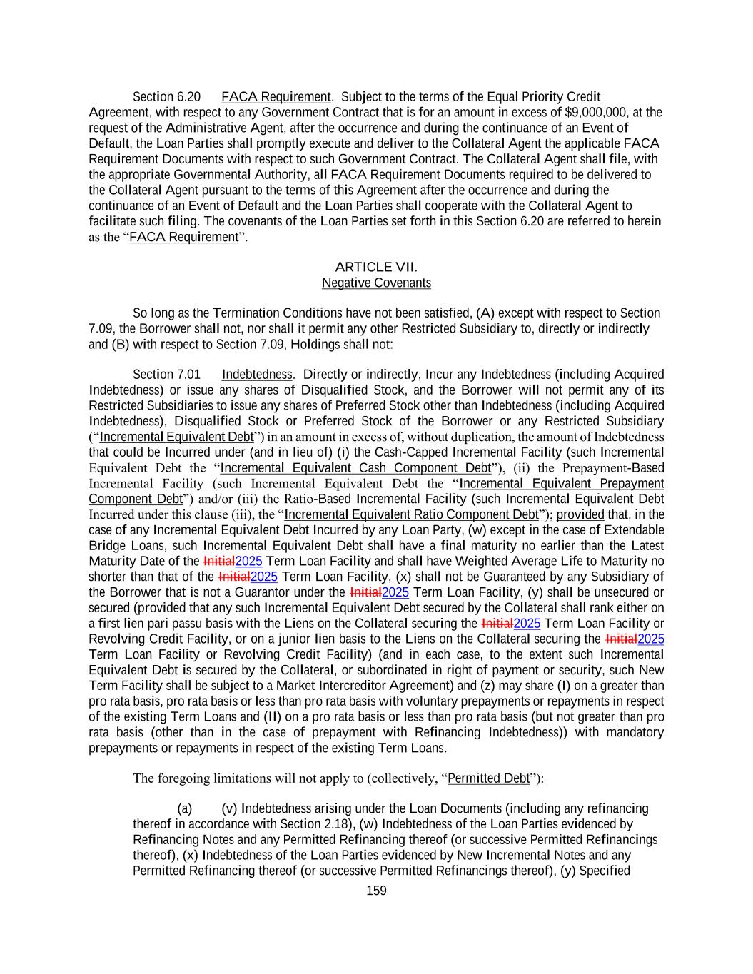 159 Section 6.20 FACA Requirement. Subject to the terms of the Equal Priority Credit Agreement, with respect to any Government Contract that is for an amount in excess of $9,000,000, at the request of the Administrative Agent, after the occurrence and during the continuance of an Event of Default, the Loan Parties shall promptly execute and deliver to the Collateral Agent the applicable FACA Requirement Documents with respect to such Government Contract. The Collateral Agent shall file, with the appropriate Governmental Authority, all FACA Requirement Documents required to be delivered to the Collateral Agent pursuant to the terms of this Agreement after the occurrence and during the continuance of an Event of Default and the Loan Parties shall cooperate with the Collateral Agent to facilitate such filing. The covenants of the Loan Parties set forth in this Section 6.20 are referred to herein as the “FACA Requirement”. ARTICLE VII. Negative Covenants So long as the Termination Conditions have not been satisfied, (A) except with respect to Section 7.09, the Borrower shall not, nor shall it permit any other Restricted Subsidiary to, directly or indirectly and (B) with respect to Section 7.09, Holdings shall not: Section 7.01 Indebtedness. Directly or indirectly, Incur any Indebtedness (including Acquired Indebtedness) or issue any shares of Disqualified Stock, and the Borrower will not permit any of its Restricted Subsidiaries to issue any shares of Preferred Stock other than Indebtedness (including Acquired Indebtedness), Disqualified Stock or Preferred Stock of the Borrower or any Restricted Subsidiary (“Incremental Equivalent Debt”) in an amount in excess of, without duplication, the amount of Indebtedness that could be Incurred under (and in lieu of) (i) the Cash-Capped Incremental Facility (such Incremental Equivalent Debt the “Incremental Equivalent Cash Component Debt”), (ii) the Prepayment-Based Incremental Facility (such Incremental Equivalent Debt the “Incremental Equivalent Prepayment Component Debt”) and/or (iii) the Ratio-Based Incremental Facility (such Incremental Equivalent Debt Incurred under this clause (iii), the “Incremental Equivalent Ratio Component Debt”); provided that, in the case of any Incremental Equivalent Debt Incurred by any Loan Party, (w) except in the case of Extendable Bridge Loans, such Incremental Equivalent Debt shall have a final maturity no earlier than the Latest Maturity Date of the Initial2025 Term Loan Facility and shall have Weighted Average Life to Maturity no shorter than that of the Initial2025 Term Loan Facility, (x) shall not be Guaranteed by any Subsidiary of the Borrower that is not a Guarantor under the Initial2025 Term Loan Facility, (y) shall be unsecured or secured (provided that any such Incremental Equivalent Debt secured by the Collateral shall rank either on a first lien pari passu basis with the Liens on the Collateral securing the Initial2025 Term Loan Facility or Revolving Credit Facility, or on a junior lien basis to the Liens on the Collateral securing the Initial2025 Term Loan Facility or Revolving Credit Facility) (and in each case, to the extent such Incremental Equivalent Debt is secured by the Collateral, or subordinated in right of payment or security, such New Term Facility shall be subject to a Market Intercreditor Agreement) and (z) may share (I) on a greater than pro rata basis, pro rata basis or less than pro rata basis with voluntary prepayments or repayments in respect of the existing Term Loans and (II) on a pro rata basis or less than pro rata basis (but not greater than pro rata basis (other than in the case of prepayment with Refinancing Indebtedness)) with mandatory prepayments or repayments in respect of the existing Term Loans. The foregoing limitations will not apply to (collectively, “Permitted Debt”): (a) (v) Indebtedness arising under the Loan Documents (including any refinancing thereof in accordance with Section 2.18), (w) Indebtedness of the Loan Parties evidenced by Refinancing Notes and any Permitted Refinancing thereof (or successive Permitted Refinancings thereof), (x) Indebtedness of the Loan Parties evidenced by New Incremental Notes and any Permitted Refinancing thereof (or successive Permitted Refinancings thereof), (y) Specified