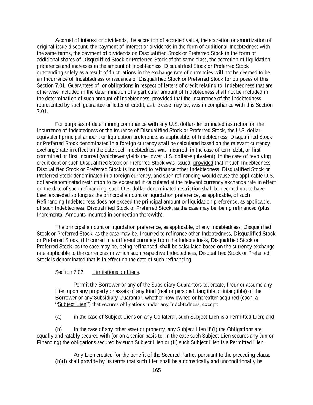 165 Accrual of interest or dividends, the accretion of accreted value, the accretion or amortization of original issue discount, the payment of interest or dividends in the form of additional Indebtedness with the same terms, the payment of dividends on Disqualified Stock or Preferred Stock in the form of additional shares of Disqualified Stock or Preferred Stock of the same class, the accretion of liquidation preference and increases in the amount of Indebtedness, Disqualified Stock or Preferred Stock outstanding solely as a result of fluctuations in the exchange rate of currencies will not be deemed to be an Incurrence of Indebtedness or issuance of Disqualified Stock or Preferred Stock for purposes of this Section 7.01. Guarantees of, or obligations in respect of letters of credit relating to, Indebtedness that are otherwise included in the determination of a particular amount of Indebtedness shall not be included in the determination of such amount of Indebtedness; provided that the Incurrence of the Indebtedness represented by such guarantee or letter of credit, as the case may be, was in compliance with this Section 7.01. For purposes of determining compliance with any U.S. dollar-denominated restriction on the Incurrence of Indebtedness or the issuance of Disqualified Stock or Preferred Stock, the U.S. dollar- equivalent principal amount or liquidation preference, as applicable, of Indebtedness, Disqualified Stock or Preferred Stock denominated in a foreign currency shall be calculated based on the relevant currency exchange rate in effect on the date such Indebtedness was Incurred, in the case of term debt, or first committed or first Incurred (whichever yields the lower U.S. dollar-equivalent), in the case of revolving credit debt or such Disqualified Stock or Preferred Stock was issued; provided that if such Indebtedness, Disqualified Stock or Preferred Stock is Incurred to refinance other Indebtedness, Disqualified Stock or Preferred Stock denominated in a foreign currency, and such refinancing would cause the applicable U.S. dollar-denominated restriction to be exceeded if calculated at the relevant currency exchange rate in effect on the date of such refinancing, such U.S. dollar-denominated restriction shall be deemed not to have been exceeded so long as the principal amount or liquidation preference, as applicable, of such Refinancing Indebtedness does not exceed the principal amount or liquidation preference, as applicable, of such Indebtedness, Disqualified Stock or Preferred Stock, as the case may be, being refinanced (plus Incremental Amounts Incurred in connection therewith). The principal amount or liquidation preference, as applicable, of any Indebtedness, Disqualified Stock or Preferred Stock, as the case may be, Incurred to refinance other Indebtedness, Disqualified Stock or Preferred Stock, if Incurred in a different currency from the Indebtedness, Disqualified Stock or Preferred Stock, as the case may be, being refinanced, shall be calculated based on the currency exchange rate applicable to the currencies in which such respective Indebtedness, Disqualified Stock or Preferred Stock is denominated that is in effect on the date of such refinancing. Section 7.02 Limitations on Liens. Permit the Borrower or any of the Subsidiary Guarantors to, create, Incur or assume any Lien upon any property or assets of any kind (real or personal, tangible or intangible) of the Borrower or any Subsidiary Guarantor, whether now owned or hereafter acquired (each, a “Subject Lien”) that secures obligations under any Indebtedness, except: (a) in the case of Subject Liens on any Collateral, such Subject Lien is a Permitted Lien; and (b) in the case of any other asset or property, any Subject Lien if (i) the Obligations are equally and ratably secured with (or on a senior basis to, in the case such Subject Lien secures any Junior Financing) the obligations secured by such Subject Lien or (ii) such Subject Lien is a Permitted Lien. Any Lien created for the benefit of the Secured Parties pursuant to the preceding clause (b)(i) shall provide by its terms that such Lien shall be automatically and unconditionally be