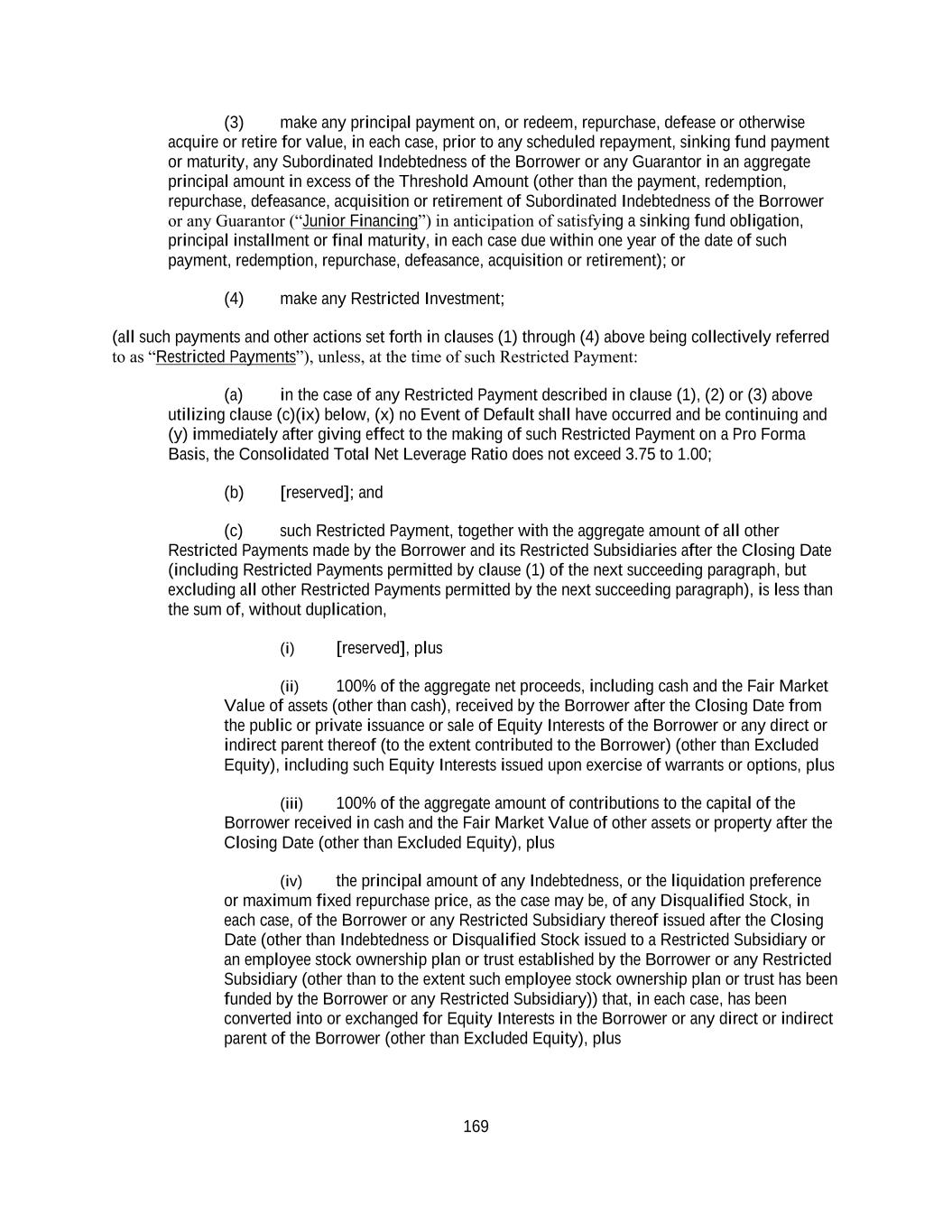 169 (3) make any principal payment on, or redeem, repurchase, defease or otherwise acquire or retire for value, in each case, prior to any scheduled repayment, sinking fund payment or maturity, any Subordinated Indebtedness of the Borrower or any Guarantor in an aggregate principal amount in excess of the Threshold Amount (other than the payment, redemption, repurchase, defeasance, acquisition or retirement of Subordinated Indebtedness of the Borrower or any Guarantor (“Junior Financing”) in anticipation of satisfying a sinking fund obligation, principal installment or final maturity, in each case due within one year of the date of such payment, redemption, repurchase, defeasance, acquisition or retirement); or (4) make any Restricted Investment; (all such payments and other actions set forth in clauses (1) through (4) above being collectively referred to as “Restricted Payments”), unless, at the time of such Restricted Payment: (a) in the case of any Restricted Payment described in clause (1), (2) or (3) above utilizing clause (c)(ix) below, (x) no Event of Default shall have occurred and be continuing and (y) immediately after giving effect to the making of such Restricted Payment on a Pro Forma Basis, the Consolidated Total Net Leverage Ratio does not exceed 3.75 to 1.00; (b) [reserved]; and (c) such Restricted Payment, together with the aggregate amount of all other Restricted Payments made by the Borrower and its Restricted Subsidiaries after the Closing Date (including Restricted Payments permitted by clause (1) of the next succeeding paragraph, but excluding all other Restricted Payments permitted by the next succeeding paragraph), is less than the sum of, without duplication, (i) [reserved], plus (ii) 100% of the aggregate net proceeds, including cash and the Fair Market Value of assets (other than cash), received by the Borrower after the Closing Date from the public or private issuance or sale of Equity Interests of the Borrower or any direct or indirect parent thereof (to the extent contributed to the Borrower) (other than Excluded Equity), including such Equity Interests issued upon exercise of warrants or options, plus (iii) 100% of the aggregate amount of contributions to the capital of the Borrower received in cash and the Fair Market Value of other assets or property after the Closing Date (other than Excluded Equity), plus (iv) the principal amount of any Indebtedness, or the liquidation preference or maximum fixed repurchase price, as the case may be, of any Disqualified Stock, in each case, of the Borrower or any Restricted Subsidiary thereof issued after the Closing Date (other than Indebtedness or Disqualified Stock issued to a Restricted Subsidiary or an employee stock ownership plan or trust established by the Borrower or any Restricted Subsidiary (other than to the extent such employee stock ownership plan or trust has been funded by the Borrower or any Restricted Subsidiary)) that, in each case, has been converted into or exchanged for Equity Interests in the Borrower or any direct or indirect parent of the Borrower (other than Excluded Equity), plus