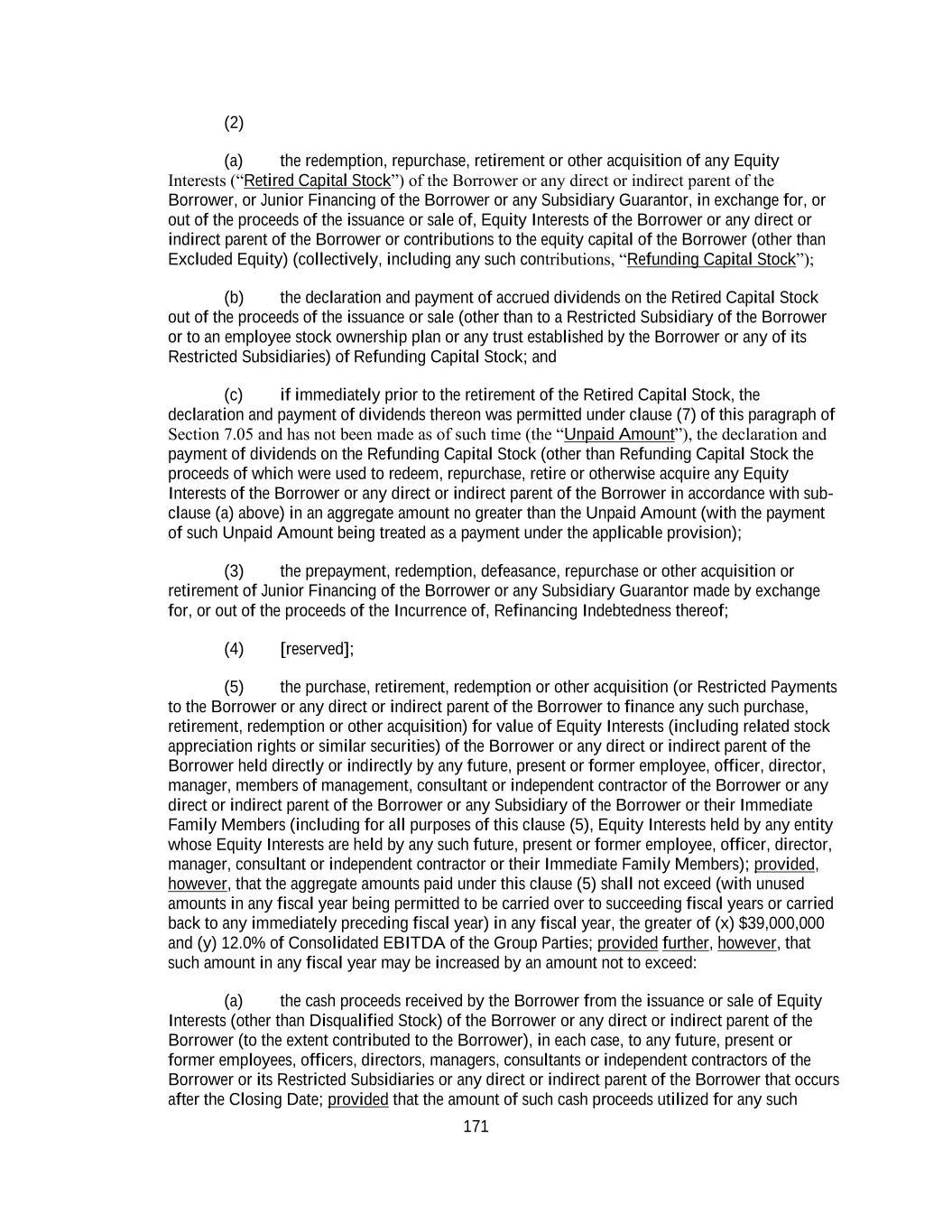 171 (2) (a) the redemption, repurchase, retirement or other acquisition of any Equity Interests (“Retired Capital Stock”) of the Borrower or any direct or indirect parent of the Borrower, or Junior Financing of the Borrower or any Subsidiary Guarantor, in exchange for, or out of the proceeds of the issuance or sale of, Equity Interests of the Borrower or any direct or indirect parent of the Borrower or contributions to the equity capital of the Borrower (other than Excluded Equity) (collectively, including any such contributions, “Refunding Capital Stock”); (b) the declaration and payment of accrued dividends on the Retired Capital Stock out of the proceeds of the issuance or sale (other than to a Restricted Subsidiary of the Borrower or to an employee stock ownership plan or any trust established by the Borrower or any of its Restricted Subsidiaries) of Refunding Capital Stock; and (c) if immediately prior to the retirement of the Retired Capital Stock, the declaration and payment of dividends thereon was permitted under clause (7) of this paragraph of Section 7.05 and has not been made as of such time (the “Unpaid Amount”), the declaration and payment of dividends on the Refunding Capital Stock (other than Refunding Capital Stock the proceeds of which were used to redeem, repurchase, retire or otherwise acquire any Equity Interests of the Borrower or any direct or indirect parent of the Borrower in accordance with sub- clause (a) above) in an aggregate amount no greater than the Unpaid Amount (with the payment of such Unpaid Amount being treated as a payment under the applicable provision); (3) the prepayment, redemption, defeasance, repurchase or other acquisition or retirement of Junior Financing of the Borrower or any Subsidiary Guarantor made by exchange for, or out of the proceeds of the Incurrence of, Refinancing Indebtedness thereof; (4) [reserved]; (5) the purchase, retirement, redemption or other acquisition (or Restricted Payments to the Borrower or any direct or indirect parent of the Borrower to finance any such purchase, retirement, redemption or other acquisition) for value of Equity Interests (including related stock appreciation rights or similar securities) of the Borrower or any direct or indirect parent of the Borrower held directly or indirectly by any future, present or former employee, officer, director, manager, members of management, consultant or independent contractor of the Borrower or any direct or indirect parent of the Borrower or any Subsidiary of the Borrower or their Immediate Family Members (including for all purposes of this clause (5), Equity Interests held by any entity whose Equity Interests are held by any such future, present or former employee, officer, director, manager, consultant or independent contractor or their Immediate Family Members); provided, however, that the aggregate amounts paid under this clause (5) shall not exceed (with unused amounts in any fiscal year being permitted to be carried over to succeeding fiscal years or carried back to any immediately preceding fiscal year) in any fiscal year, the greater of (x) $39,000,000 and (y) 12.0% of Consolidated EBITDA of the Group Parties; provided further, however, that such amount in any fiscal year may be increased by an amount not to exceed: (a) the cash proceeds received by the Borrower from the issuance or sale of Equity Interests (other than Disqualified Stock) of the Borrower or any direct or indirect parent of the Borrower (to the extent contributed to the Borrower), in each case, to any future, present or former employees, officers, directors, managers, consultants or independent contractors of the Borrower or its Restricted Subsidiaries or any direct or indirect parent of the Borrower that occurs after the Closing Date; provided that the amount of such cash proceeds utilized for any such