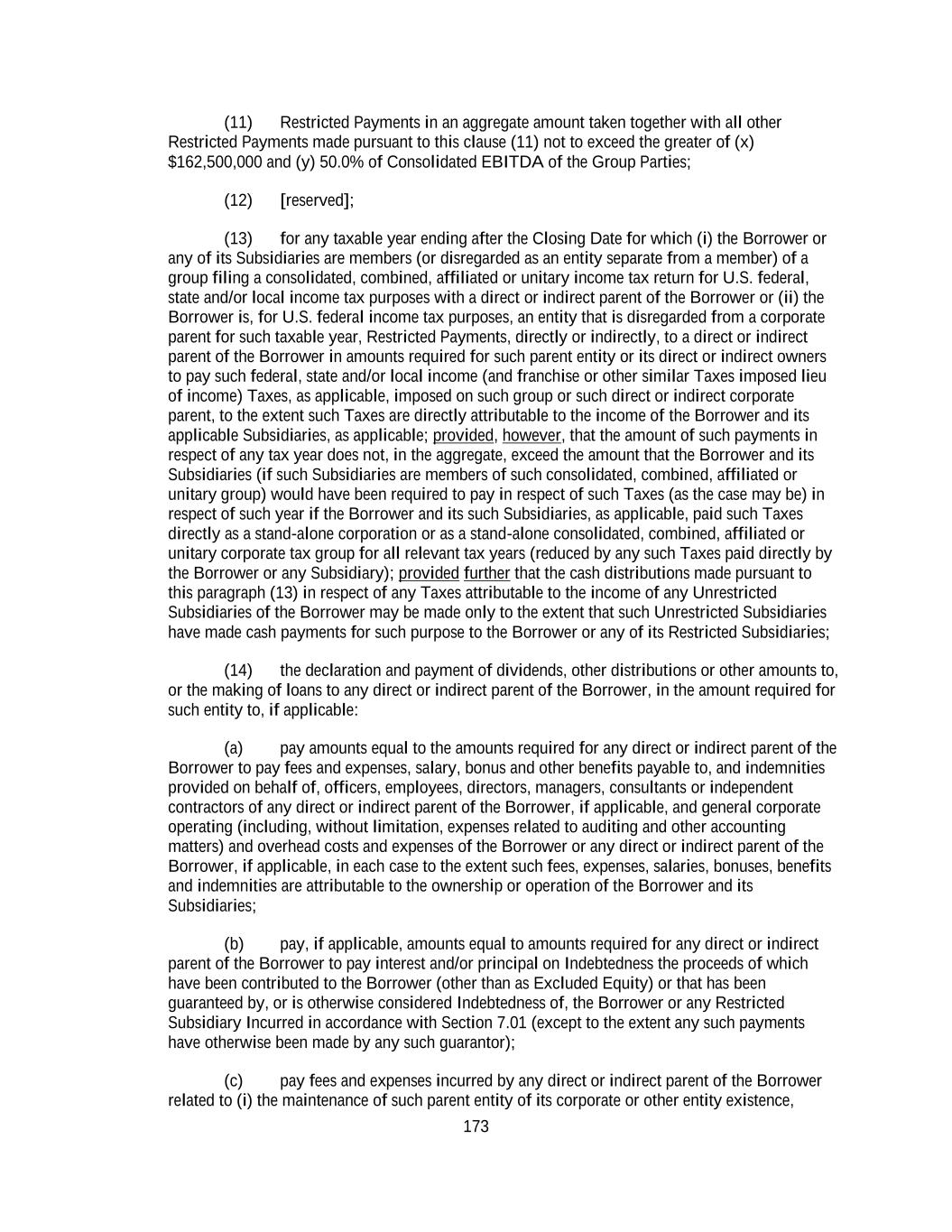 173 (11) Restricted Payments in an aggregate amount taken together with all other Restricted Payments made pursuant to this clause (11) not to exceed the greater of (x) $162,500,000 and (y) 50.0% of Consolidated EBITDA of the Group Parties; (12) [reserved]; (13) for any taxable year ending after the Closing Date for which (i) the Borrower or any of its Subsidiaries are members (or disregarded as an entity separate from a member) of a group filing a consolidated, combined, affiliated or unitary income tax return for U.S. federal, state and/or local income tax purposes with a direct or indirect parent of the Borrower or (ii) the Borrower is, for U.S. federal income tax purposes, an entity that is disregarded from a corporate parent for such taxable year, Restricted Payments, directly or indirectly, to a direct or indirect parent of the Borrower in amounts required for such parent entity or its direct or indirect owners to pay such federal, state and/or local income (and franchise or other similar Taxes imposed lieu of income) Taxes, as applicable, imposed on such group or such direct or indirect corporate parent, to the extent such Taxes are directly attributable to the income of the Borrower and its applicable Subsidiaries, as applicable; provided, however, that the amount of such payments in respect of any tax year does not, in the aggregate, exceed the amount that the Borrower and its Subsidiaries (if such Subsidiaries are members of such consolidated, combined, affiliated or unitary group) would have been required to pay in respect of such Taxes (as the case may be) in respect of such year if the Borrower and its such Subsidiaries, as applicable, paid such Taxes directly as a stand-alone corporation or as a stand-alone consolidated, combined, affiliated or unitary corporate tax group for all relevant tax years (reduced by any such Taxes paid directly by the Borrower or any Subsidiary); provided further that the cash distributions made pursuant to this paragraph (13) in respect of any Taxes attributable to the income of any Unrestricted Subsidiaries of the Borrower may be made only to the extent that such Unrestricted Subsidiaries have made cash payments for such purpose to the Borrower or any of its Restricted Subsidiaries; (14) the declaration and payment of dividends, other distributions or other amounts to, or the making of loans to any direct or indirect parent of the Borrower, in the amount required for such entity to, if applicable: (a) pay amounts equal to the amounts required for any direct or indirect parent of the Borrower to pay fees and expenses, salary, bonus and other benefits payable to, and indemnities provided on behalf of, officers, employees, directors, managers, consultants or independent contractors of any direct or indirect parent of the Borrower, if applicable, and general corporate operating (including, without limitation, expenses related to auditing and other accounting matters) and overhead costs and expenses of the Borrower or any direct or indirect parent of the Borrower, if applicable, in each case to the extent such fees, expenses, salaries, bonuses, benefits and indemnities are attributable to the ownership or operation of the Borrower and its Subsidiaries; (b) pay, if applicable, amounts equal to amounts required for any direct or indirect parent of the Borrower to pay interest and/or principal on Indebtedness the proceeds of which have been contributed to the Borrower (other than as Excluded Equity) or that has been guaranteed by, or is otherwise considered Indebtedness of, the Borrower or any Restricted Subsidiary Incurred in accordance with Section 7.01 (except to the extent any such payments have otherwise been made by any such guarantor); (c) pay fees and expenses incurred by any direct or indirect parent of the Borrower related to (i) the maintenance of such parent entity of its corporate or other entity existence,
