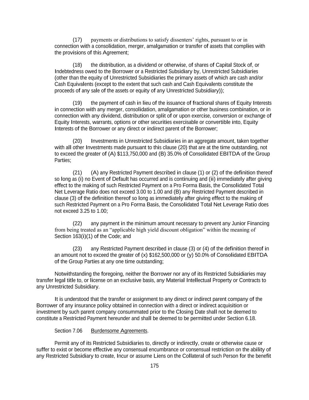 175 (17) payments or distributions to satisfy dissenters’ rights, pursuant to or in connection with a consolidation, merger, amalgamation or transfer of assets that complies with the provisions of this Agreement; (18) the distribution, as a dividend or otherwise, of shares of Capital Stock of, or Indebtedness owed to the Borrower or a Restricted Subsidiary by, Unrestricted Subsidiaries (other than the equity of Unrestricted Subsidiaries the primary assets of which are cash and/or Cash Equivalents (except to the extent that such cash and Cash Equivalents constitute the proceeds of any sale of the assets or equity of any Unrestricted Subsidiary)); (19) the payment of cash in lieu of the issuance of fractional shares of Equity Interests in connection with any merger, consolidation, amalgamation or other business combination, or in connection with any dividend, distribution or split of or upon exercise, conversion or exchange of Equity Interests, warrants, options or other securities exercisable or convertible into, Equity Interests of the Borrower or any direct or indirect parent of the Borrower; (20) Investments in Unrestricted Subsidiaries in an aggregate amount, taken together with all other Investments made pursuant to this clause (20) that are at the time outstanding, not to exceed the greater of (A) $113,750,000 and (B) 35.0% of Consolidated EBITDA of the Group Parties; (21) (A) any Restricted Payment described in clause (1) or (2) of the definition thereof so long as (i) no Event of Default has occurred and is continuing and (ii) immediately after giving effect to the making of such Restricted Payment on a Pro Forma Basis, the Consolidated Total Net Leverage Ratio does not exceed 3.00 to 1.00 and (B) any Restricted Payment described in clause (3) of the definition thereof so long as immediately after giving effect to the making of such Restricted Payment on a Pro Forma Basis, the Consolidated Total Net Leverage Ratio does not exceed 3.25 to 1.00; (22) any payment in the minimum amount necessary to prevent any Junior Financing from being treated as an “applicable high yield discount obligation” within the meaning of Section 163(i)(1) of the Code; and (23) any Restricted Payment described in clause (3) or (4) of the definition thereof in an amount not to exceed the greater of (x) $162,500,000 or (y) 50.0% of Consolidated EBITDA of the Group Parties at any one time outstanding; Notwithstanding the foregoing, neither the Borrower nor any of its Restricted Subsidiaries may transfer legal title to, or license on an exclusive basis, any Material Intellectual Property or Contracts to any Unrestricted Subsidiary. It is understood that the transfer or assignment to any direct or indirect parent company of the Borrower of any insurance policy obtained in connection with a direct or indirect acquisition or investment by such parent company consummated prior to the Closing Date shall not be deemed to constitute a Restricted Payment hereunder and shall be deemed to be permitted under Section 6.18. Section 7.06 Burdensome Agreements. Permit any of its Restricted Subsidiaries to, directly or indirectly, create or otherwise cause or suffer to exist or become effective any consensual encumbrance or consensual restriction on the ability of any Restricted Subsidiary to create, Incur or assume Liens on the Collateral of such Person for the benefit