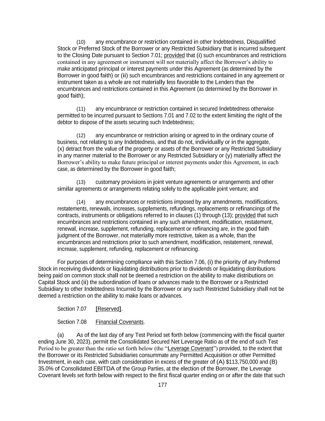177 (10) any encumbrance or restriction contained in other Indebtedness, Disqualified Stock or Preferred Stock of the Borrower or any Restricted Subsidiary that is incurred subsequent to the Closing Date pursuant to Section 7.01; provided that (i) such encumbrances and restrictions contained in any agreement or instrument will not materially affect the Borrower’s ability to make anticipated principal or interest payments under this Agreement (as determined by the Borrower in good faith) or (ii) such encumbrances and restrictions contained in any agreement or instrument taken as a whole are not materially less favorable to the Lenders than the encumbrances and restrictions contained in this Agreement (as determined by the Borrower in good faith); (11) any encumbrance or restriction contained in secured Indebtedness otherwise permitted to be incurred pursuant to Sections 7.01 and 7.02 to the extent limiting the right of the debtor to dispose of the assets securing such Indebtedness; (12) any encumbrance or restriction arising or agreed to in the ordinary course of business, not relating to any Indebtedness, and that do not, individually or in the aggregate, (x) detract from the value of the property or assets of the Borrower or any Restricted Subsidiary in any manner material to the Borrower or any Restricted Subsidiary or (y) materially affect the Borrower’s ability to make future principal or interest payments under this Agreement, in each case, as determined by the Borrower in good faith; (13) customary provisions in joint venture agreements or arrangements and other similar agreements or arrangements relating solely to the applicable joint venture; and (14) any encumbrances or restrictions imposed by any amendments, modifications, restatements, renewals, increases, supplements, refundings, replacements or refinancings of the contracts, instruments or obligations referred to in clauses (1) through (13); provided that such encumbrances and restrictions contained in any such amendment, modification, restatement, renewal, increase, supplement, refunding, replacement or refinancing are, in the good faith judgment of the Borrower, not materially more restrictive, taken as a whole, than the encumbrances and restrictions prior to such amendment, modification, restatement, renewal, increase, supplement, refunding, replacement or refinancing. For purposes of determining compliance with this Section 7.06, (i) the priority of any Preferred Stock in receiving dividends or liquidating distributions prior to dividends or liquidating distributions being paid on common stock shall not be deemed a restriction on the ability to make distributions on Capital Stock and (ii) the subordination of loans or advances made to the Borrower or a Restricted Subsidiary to other Indebtedness Incurred by the Borrower or any such Restricted Subsidiary shall not be deemed a restriction on the ability to make loans or advances. Section 7.07 [Reserved]. Section 7.08 Financial Covenants. (a) As of the last day of any Test Period set forth below (commencing with the fiscal quarter ending June 30, 2023), permit the Consolidated Secured Net Leverage Ratio as of the end of such Test Period to be greater than the ratio set forth below (the “Leverage Covenant”) provided, to the extent that the Borrower or its Restricted Subsidiaries consummate any Permitted Acquisition or other Permitted Investment, in each case, with cash consideration in excess of the greater of (A) $113,750,000 and (B) 35.0% of Consolidated EBITDA of the Group Parties, at the election of the Borrower, the Leverage Covenant levels set forth below with respect to the first fiscal quarter ending on or after the date that such
