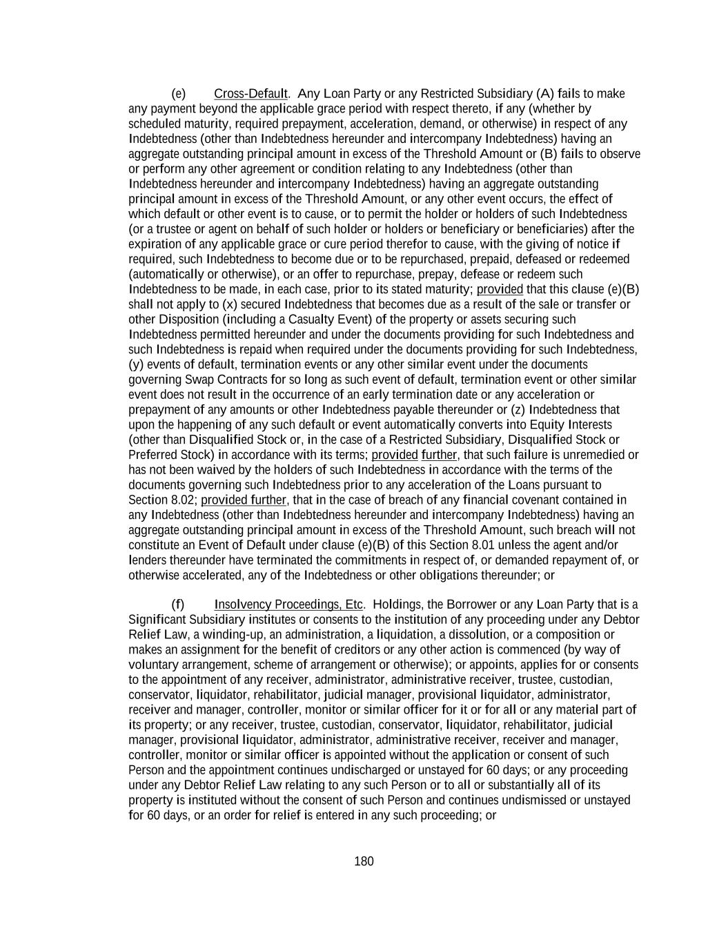 180 (e) Cross-Default. Any Loan Party or any Restricted Subsidiary (A) fails to make any payment beyond the applicable grace period with respect thereto, if any (whether by scheduled maturity, required prepayment, acceleration, demand, or otherwise) in respect of any Indebtedness (other than Indebtedness hereunder and intercompany Indebtedness) having an aggregate outstanding principal amount in excess of the Threshold Amount or (B) fails to observe or perform any other agreement or condition relating to any Indebtedness (other than Indebtedness hereunder and intercompany Indebtedness) having an aggregate outstanding principal amount in excess of the Threshold Amount, or any other event occurs, the effect of which default or other event is to cause, or to permit the holder or holders of such Indebtedness (or a trustee or agent on behalf of such holder or holders or beneficiary or beneficiaries) after the expiration of any applicable grace or cure period therefor to cause, with the giving of notice if required, such Indebtedness to become due or to be repurchased, prepaid, defeased or redeemed (automatically or otherwise), or an offer to repurchase, prepay, defease or redeem such Indebtedness to be made, in each case, prior to its stated maturity; provided that this clause (e)(B) shall not apply to (x) secured Indebtedness that becomes due as a result of the sale or transfer or other Disposition (including a Casualty Event) of the property or assets securing such Indebtedness permitted hereunder and under the documents providing for such Indebtedness and such Indebtedness is repaid when required under the documents providing for such Indebtedness, (y) events of default, termination events or any other similar event under the documents governing Swap Contracts for so long as such event of default, termination event or other similar event does not result in the occurrence of an early termination date or any acceleration or prepayment of any amounts or other Indebtedness payable thereunder or (z) Indebtedness that upon the happening of any such default or event automatically converts into Equity Interests (other than Disqualified Stock or, in the case of a Restricted Subsidiary, Disqualified Stock or Preferred Stock) in accordance with its terms; provided further, that such failure is unremedied or has not been waived by the holders of such Indebtedness in accordance with the terms of the documents governing such Indebtedness prior to any acceleration of the Loans pursuant to Section 8.02; provided further, that in the case of breach of any financial covenant contained in any Indebtedness (other than Indebtedness hereunder and intercompany Indebtedness) having an aggregate outstanding principal amount in excess of the Threshold Amount, such breach will not constitute an Event of Default under clause (e)(B) of this Section 8.01 unless the agent and/or lenders thereunder have terminated the commitments in respect of, or demanded repayment of, or otherwise accelerated, any of the Indebtedness or other obligations thereunder; or (f) Insolvency Proceedings, Etc. Holdings, the Borrower or any Loan Party that is a Significant Subsidiary institutes or consents to the institution of any proceeding under any Debtor Relief Law, a winding-up, an administration, a liquidation, a dissolution, or a composition or makes an assignment for the benefit of creditors or any other action is commenced (by way of voluntary arrangement, scheme of arrangement or otherwise); or appoints, applies for or consents to the appointment of any receiver, administrator, administrative receiver, trustee, custodian, conservator, liquidator, rehabilitator, judicial manager, provisional liquidator, administrator, receiver and manager, controller, monitor or similar officer for it or for all or any material part of its property; or any receiver, trustee, custodian, conservator, liquidator, rehabilitator, judicial manager, provisional liquidator, administrator, administrative receiver, receiver and manager, controller, monitor or similar officer is appointed without the application or consent of such Person and the appointment continues undischarged or unstayed for 60 days; or any proceeding under any Debtor Relief Law relating to any such Person or to all or substantially all of its property is instituted without the consent of such Person and continues undismissed or unstayed for 60 days, or an order for relief is entered in any such proceeding; or