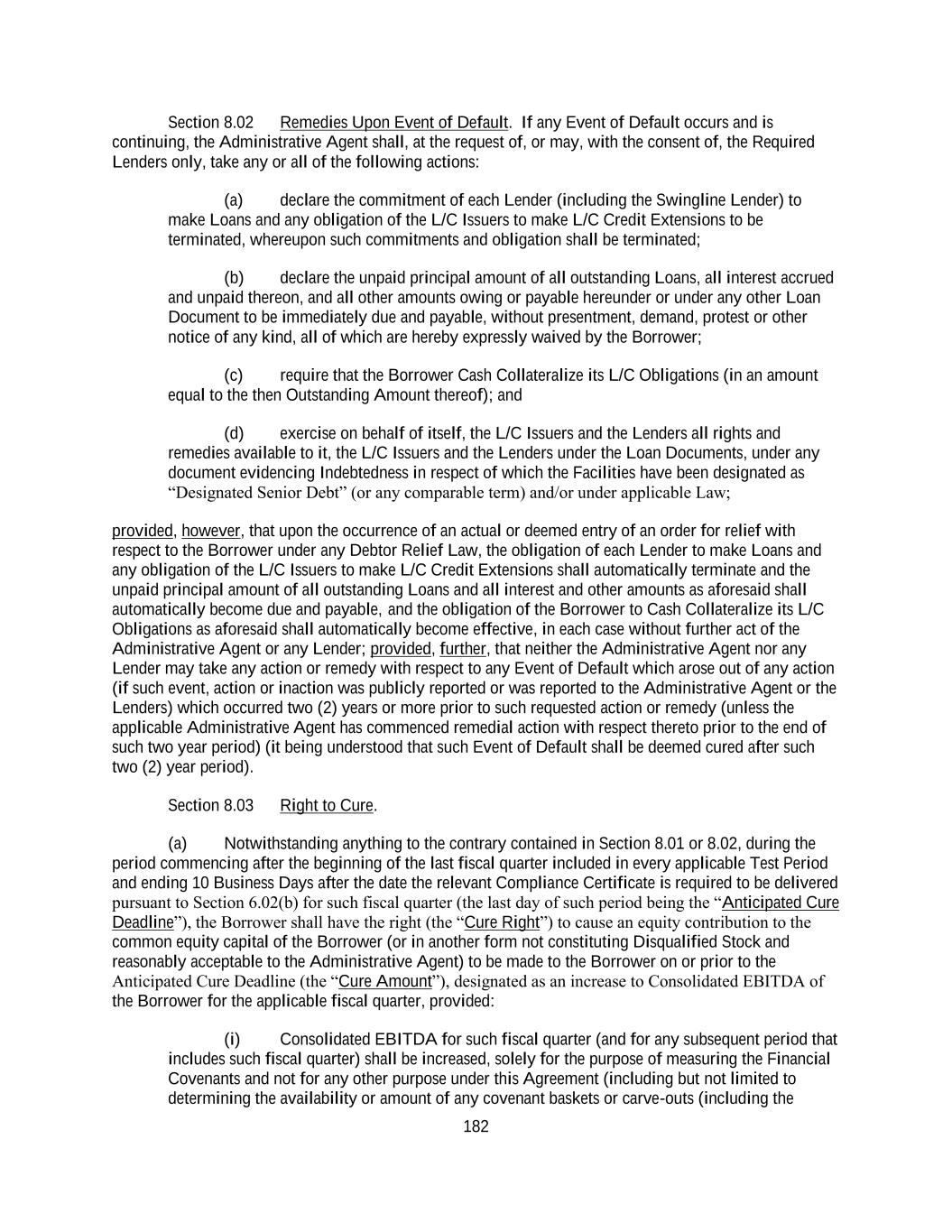 182 Section 8.02 Remedies Upon Event of Default. If any Event of Default occurs and is continuing, the Administrative Agent shall, at the request of, or may, with the consent of, the Required Lenders only, take any or all of the following actions: (a) declare the commitment of each Lender (including the Swingline Lender) to make Loans and any obligation of the L/C Issuers to make L/C Credit Extensions to be terminated, whereupon such commitments and obligation shall be terminated; (b) declare the unpaid principal amount of all outstanding Loans, all interest accrued and unpaid thereon, and all other amounts owing or payable hereunder or under any other Loan Document to be immediately due and payable, without presentment, demand, protest or other notice of any kind, all of which are hereby expressly waived by the Borrower; (c) require that the Borrower Cash Collateralize its L/C Obligations (in an amount equal to the then Outstanding Amount thereof); and (d) exercise on behalf of itself, the L/C Issuers and the Lenders all rights and remedies available to it, the L/C Issuers and the Lenders under the Loan Documents, under any document evidencing Indebtedness in respect of which the Facilities have been designated as “Designated Senior Debt” (or any comparable term) and/or under applicable Law; provided, however, that upon the occurrence of an actual or deemed entry of an order for relief with respect to the Borrower under any Debtor Relief Law, the obligation of each Lender to make Loans and any obligation of the L/C Issuers to make L/C Credit Extensions shall automatically terminate and the unpaid principal amount of all outstanding Loans and all interest and other amounts as aforesaid shall automatically become due and payable, and the obligation of the Borrower to Cash Collateralize its L/C Obligations as aforesaid shall automatically become effective, in each case without further act of the Administrative Agent or any Lender; provided, further, that neither the Administrative Agent nor any Lender may take any action or remedy with respect to any Event of Default which arose out of any action (if such event, action or inaction was publicly reported or was reported to the Administrative Agent or the Lenders) which occurred two (2) years or more prior to such requested action or remedy (unless the applicable Administrative Agent has commenced remedial action with respect thereto prior to the end of such two year period) (it being understood that such Event of Default shall be deemed cured after such two (2) year period). Section 8.03 Right to Cure. (a) Notwithstanding anything to the contrary contained in Section 8.01 or 8.02, during the period commencing after the beginning of the last fiscal quarter included in every applicable Test Period and ending 10 Business Days after the date the relevant Compliance Certificate is required to be delivered pursuant to Section 6.02(b) for such fiscal quarter (the last day of such period being the “Anticipated Cure Deadline”), the Borrower shall have the right (the “Cure Right”) to cause an equity contribution to the common equity capital of the Borrower (or in another form not constituting Disqualified Stock and reasonably acceptable to the Administrative Agent) to be made to the Borrower on or prior to the Anticipated Cure Deadline (the “Cure Amount”), designated as an increase to Consolidated EBITDA of the Borrower for the applicable fiscal quarter, provided: (i) Consolidated EBITDA for such fiscal quarter (and for any subsequent period that includes such fiscal quarter) shall be increased, solely for the purpose of measuring the Financial Covenants and not for any other purpose under this Agreement (including but not limited to determining the availability or amount of any covenant baskets or carve-outs (including the