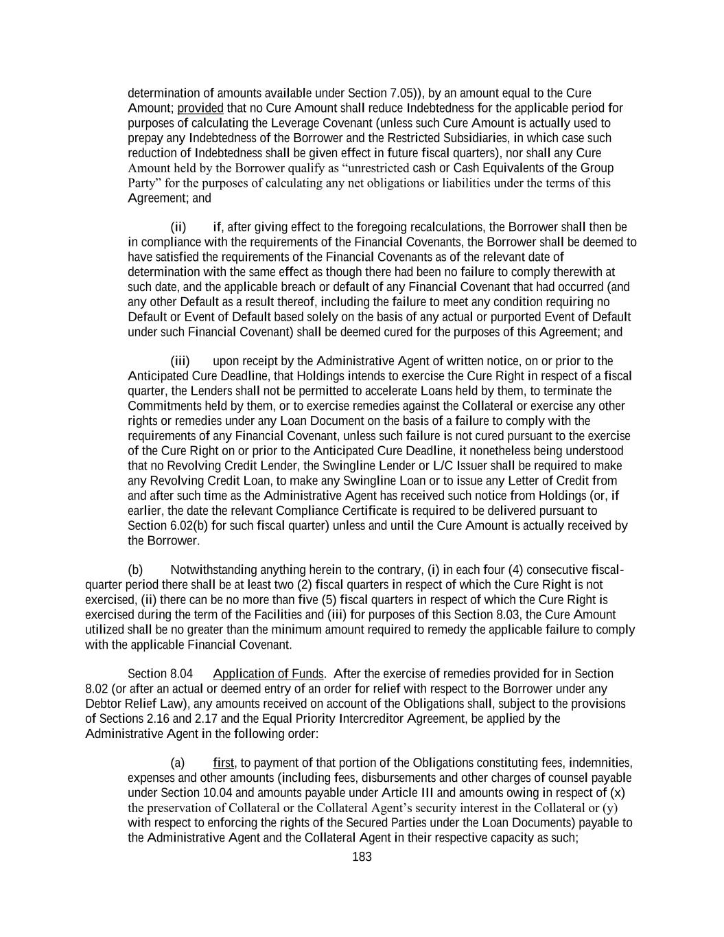 183 determination of amounts available under Section 7.05)), by an amount equal to the Cure Amount; provided that no Cure Amount shall reduce Indebtedness for the applicable period for purposes of calculating the Leverage Covenant (unless such Cure Amount is actually used to prepay any Indebtedness of the Borrower and the Restricted Subsidiaries, in which case such reduction of Indebtedness shall be given effect in future fiscal quarters), nor shall any Cure Amount held by the Borrower qualify as “unrestricted cash or Cash Equivalents of the Group Party” for the purposes of calculating any net obligations or liabilities under the terms of this Agreement; and (ii) if, after giving effect to the foregoing recalculations, the Borrower shall then be in compliance with the requirements of the Financial Covenants, the Borrower shall be deemed to have satisfied the requirements of the Financial Covenants as of the relevant date of determination with the same effect as though there had been no failure to comply therewith at such date, and the applicable breach or default of any Financial Covenant that had occurred (and any other Default as a result thereof, including the failure to meet any condition requiring no Default or Event of Default based solely on the basis of any actual or purported Event of Default under such Financial Covenant) shall be deemed cured for the purposes of this Agreement; and (iii) upon receipt by the Administrative Agent of written notice, on or prior to the Anticipated Cure Deadline, that Holdings intends to exercise the Cure Right in respect of a fiscal quarter, the Lenders shall not be permitted to accelerate Loans held by them, to terminate the Commitments held by them, or to exercise remedies against the Collateral or exercise any other rights or remedies under any Loan Document on the basis of a failure to comply with the requirements of any Financial Covenant, unless such failure is not cured pursuant to the exercise of the Cure Right on or prior to the Anticipated Cure Deadline, it nonetheless being understood that no Revolving Credit Lender, the Swingline Lender or L/C Issuer shall be required to make any Revolving Credit Loan, to make any Swingline Loan or to issue any Letter of Credit from and after such time as the Administrative Agent has received such notice from Holdings (or, if earlier, the date the relevant Compliance Certificate is required to be delivered pursuant to Section 6.02(b) for such fiscal quarter) unless and until the Cure Amount is actually received by the Borrower. (b) Notwithstanding anything herein to the contrary, (i) in each four (4) consecutive fiscal- quarter period there shall be at least two (2) fiscal quarters in respect of which the Cure Right is not exercised, (ii) there can be no more than five (5) fiscal quarters in respect of which the Cure Right is exercised during the term of the Facilities and (iii) for purposes of this Section 8.03, the Cure Amount utilized shall be no greater than the minimum amount required to remedy the applicable failure to comply with the applicable Financial Covenant. Section 8.04 Application of Funds. After the exercise of remedies provided for in Section 8.02 (or after an actual or deemed entry of an order for relief with respect to the Borrower under any Debtor Relief Law), any amounts received on account of the Obligations shall, subject to the provisions of Sections 2.16 and 2.17 and the Equal Priority Intercreditor Agreement, be applied by the Administrative Agent in the following order: (a) first, to payment of that portion of the Obligations constituting fees, indemnities, expenses and other amounts (including fees, disbursements and other charges of counsel payable under Section 10.04 and amounts payable under Article III and amounts owing in respect of (x) the preservation of Collateral or the Collateral Agent’s security interest in the Collateral or (y) with respect to enforcing the rights of the Secured Parties under the Loan Documents) payable to the Administrative Agent and the Collateral Agent in their respective capacity as such;
