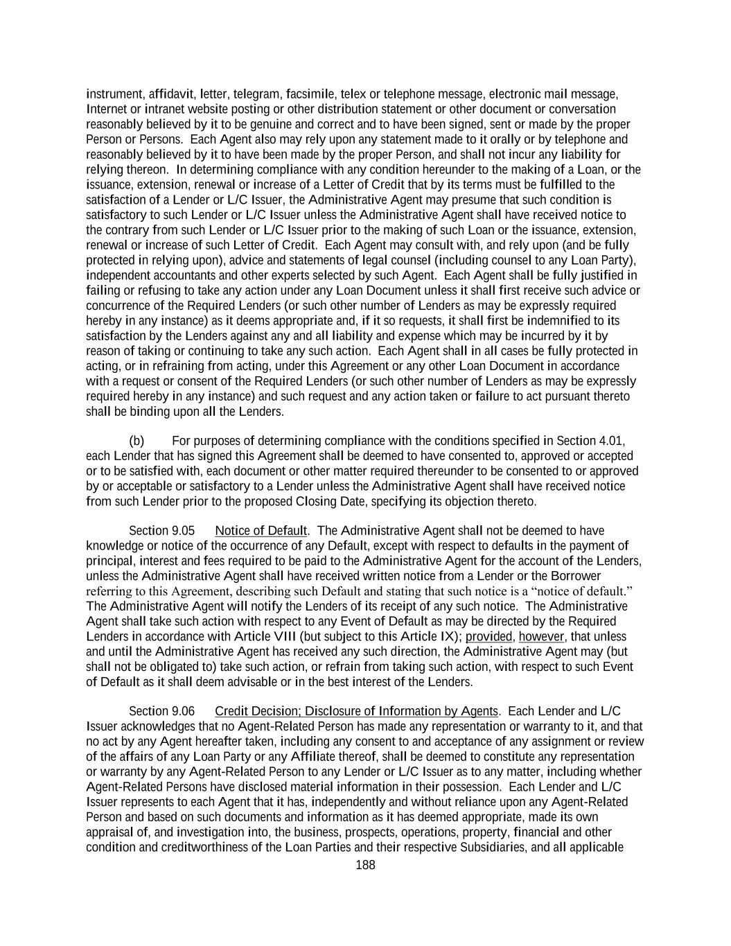 188 instrument, affidavit, letter, telegram, facsimile, telex or telephone message, electronic mail message, Internet or intranet website posting or other distribution statement or other document or conversation reasonably believed by it to be genuine and correct and to have been signed, sent or made by the proper Person or Persons. Each Agent also may rely upon any statement made to it orally or by telephone and reasonably believed by it to have been made by the proper Person, and shall not incur any liability for relying thereon. In determining compliance with any condition hereunder to the making of a Loan, or the issuance, extension, renewal or increase of a Letter of Credit that by its terms must be fulfilled to the satisfaction of a Lender or L/C Issuer, the Administrative Agent may presume that such condition is satisfactory to such Lender or L/C Issuer unless the Administrative Agent shall have received notice to the contrary from such Lender or L/C Issuer prior to the making of such Loan or the issuance, extension, renewal or increase of such Letter of Credit. Each Agent may consult with, and rely upon (and be fully protected in relying upon), advice and statements of legal counsel (including counsel to any Loan Party), independent accountants and other experts selected by such Agent. Each Agent shall be fully justified in failing or refusing to take any action under any Loan Document unless it shall first receive such advice or concurrence of the Required Lenders (or such other number of Lenders as may be expressly required hereby in any instance) as it deems appropriate and, if it so requests, it shall first be indemnified to its satisfaction by the Lenders against any and all liability and expense which may be incurred by it by reason of taking or continuing to take any such action. Each Agent shall in all cases be fully protected in acting, or in refraining from acting, under this Agreement or any other Loan Document in accordance with a request or consent of the Required Lenders (or such other number of Lenders as may be expressly required hereby in any instance) and such request and any action taken or failure to act pursuant thereto shall be binding upon all the Lenders. (b) For purposes of determining compliance with the conditions specified in Section 4.01, each Lender that has signed this Agreement shall be deemed to have consented to, approved or accepted or to be satisfied with, each document or other matter required thereunder to be consented to or approved by or acceptable or satisfactory to a Lender unless the Administrative Agent shall have received notice from such Lender prior to the proposed Closing Date, specifying its objection thereto. Section 9.05 Notice of Default. The Administrative Agent shall not be deemed to have knowledge or notice of the occurrence of any Default, except with respect to defaults in the payment of principal, interest and fees required to be paid to the Administrative Agent for the account of the Lenders, unless the Administrative Agent shall have received written notice from a Lender or the Borrower referring to this Agreement, describing such Default and stating that such notice is a “notice of default.” The Administrative Agent will notify the Lenders of its receipt of any such notice. The Administrative Agent shall take such action with respect to any Event of Default as may be directed by the Required Lenders in accordance with Article VIII (but subject to this Article IX); provided, however, that unless and until the Administrative Agent has received any such direction, the Administrative Agent may (but shall not be obligated to) take such action, or refrain from taking such action, with respect to such Event of Default as it shall deem advisable or in the best interest of the Lenders. Section 9.06 Credit Decision; Disclosure of Information by Agents. Each Lender and L/C Issuer acknowledges that no Agent-Related Person has made any representation or warranty to it, and that no act by any Agent hereafter taken, including any consent to and acceptance of any assignment or review of the affairs of any Loan Party or any Affiliate thereof, shall be deemed to constitute any representation or warranty by any Agent-Related Person to any Lender or L/C Issuer as to any matter, including whether Agent-Related Persons have disclosed material information in their possession. Each Lender and L/C Issuer represents to each Agent that it has, independently and without reliance upon any Agent-Related Person and based on such documents and information as it has deemed appropriate, made its own appraisal of, and investigation into, the business, prospects, operations, property, financial and other condition and creditworthiness of the Loan Parties and their respective Subsidiaries, and all applicable