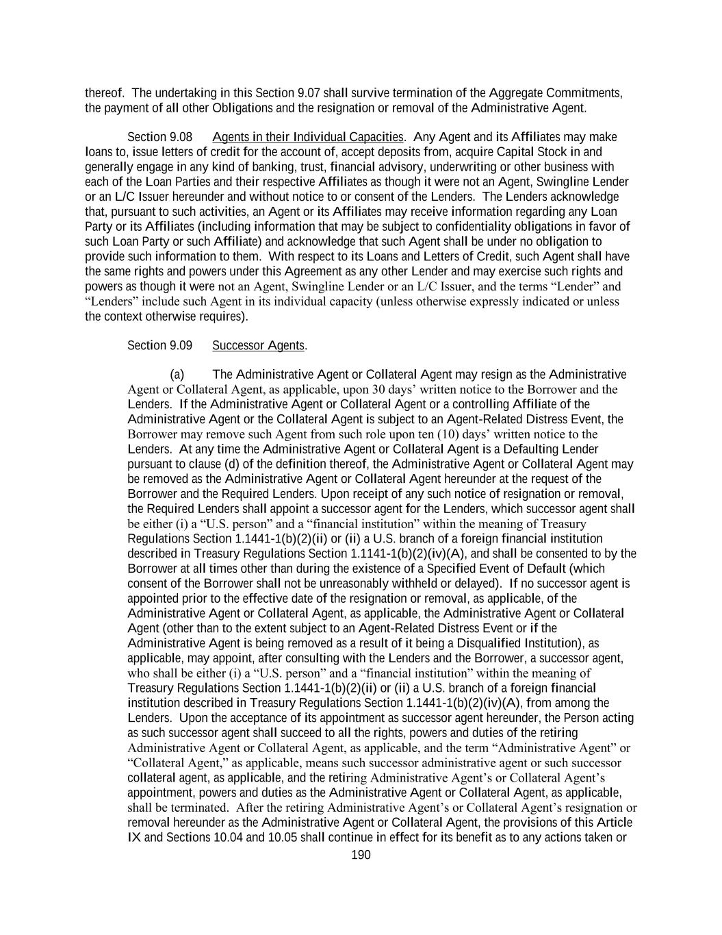 190 thereof. The undertaking in this Section 9.07 shall survive termination of the Aggregate Commitments, the payment of all other Obligations and the resignation or removal of the Administrative Agent. Section 9.08 Agents in their Individual Capacities. Any Agent and its Affiliates may make loans to, issue letters of credit for the account of, accept deposits from, acquire Capital Stock in and generally engage in any kind of banking, trust, financial advisory, underwriting or other business with each of the Loan Parties and their respective Affiliates as though it were not an Agent, Swingline Lender or an L/C Issuer hereunder and without notice to or consent of the Lenders. The Lenders acknowledge that, pursuant to such activities, an Agent or its Affiliates may receive information regarding any Loan Party or its Affiliates (including information that may be subject to confidentiality obligations in favor of such Loan Party or such Affiliate) and acknowledge that such Agent shall be under no obligation to provide such information to them. With respect to its Loans and Letters of Credit, such Agent shall have the same rights and powers under this Agreement as any other Lender and may exercise such rights and powers as though it were not an Agent, Swingline Lender or an L/C Issuer, and the terms “Lender” and “Lenders” include such Agent in its individual capacity (unless otherwise expressly indicated or unless the context otherwise requires). Section 9.09 Successor Agents. (a) The Administrative Agent or Collateral Agent may resign as the Administrative Agent or Collateral Agent, as applicable, upon 30 days’ written notice to the Borrower and the Lenders. If the Administrative Agent or Collateral Agent or a controlling Affiliate of the Administrative Agent or the Collateral Agent is subject to an Agent-Related Distress Event, the Borrower may remove such Agent from such role upon ten (10) days’ written notice to the Lenders. At any time the Administrative Agent or Collateral Agent is a Defaulting Lender pursuant to clause (d) of the definition thereof, the Administrative Agent or Collateral Agent may be removed as the Administrative Agent or Collateral Agent hereunder at the request of the Borrower and the Required Lenders. Upon receipt of any such notice of resignation or removal, the Required Lenders shall appoint a successor agent for the Lenders, which successor agent shall be either (i) a “U.S. person” and a “financial institution” within the meaning of Treasury Regulations Section 1.1441-1(b)(2)(ii) or (ii) a U.S. branch of a foreign financial institution described in Treasury Regulations Section 1.1141-1(b)(2)(iv)(A), and shall be consented to by the Borrower at all times other than during the existence of a Specified Event of Default (which consent of the Borrower shall not be unreasonably withheld or delayed). If no successor agent is appointed prior to the effective date of the resignation or removal, as applicable, of the Administrative Agent or Collateral Agent, as applicable, the Administrative Agent or Collateral Agent (other than to the extent subject to an Agent-Related Distress Event or if the Administrative Agent is being removed as a result of it being a Disqualified Institution), as applicable, may appoint, after consulting with the Lenders and the Borrower, a successor agent, who shall be either (i) a “U.S. person” and a “financial institution” within the meaning of Treasury Regulations Section 1.1441-1(b)(2)(ii) or (ii) a U.S. branch of a foreign financial institution described in Treasury Regulations Section 1.1441-1(b)(2)(iv)(A), from among the Lenders. Upon the acceptance of its appointment as successor agent hereunder, the Person acting as such successor agent shall succeed to all the rights, powers and duties of the retiring Administrative Agent or Collateral Agent, as applicable, and the term “Administrative Agent” or “Collateral Agent,” as applicable, means such successor administrative agent or such successor collateral agent, as applicable, and the retiring Administrative Agent’s or Collateral Agent’s appointment, powers and duties as the Administrative Agent or Collateral Agent, as applicable, shall be terminated. After the retiring Administrative Agent’s or Collateral Agent’s resignation or removal hereunder as the Administrative Agent or Collateral Agent, the provisions of this Article IX and Sections 10.04 and 10.05 shall continue in effect for its benefit as to any actions taken or