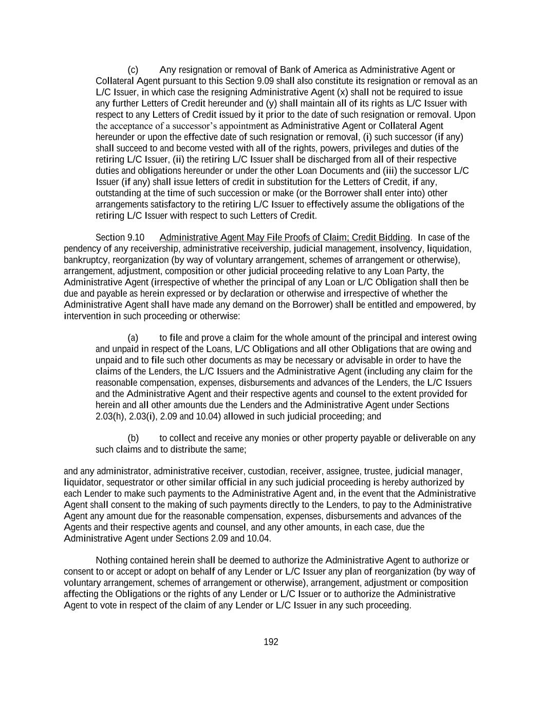 192 (c) Any resignation or removal of Bank of America as Administrative Agent or Collateral Agent pursuant to this Section 9.09 shall also constitute its resignation or removal as an L/C Issuer, in which case the resigning Administrative Agent (x) shall not be required to issue any further Letters of Credit hereunder and (y) shall maintain all of its rights as L/C Issuer with respect to any Letters of Credit issued by it prior to the date of such resignation or removal. Upon the acceptance of a successor’s appointment as Administrative Agent or Collateral Agent hereunder or upon the effective date of such resignation or removal, (i) such successor (if any) shall succeed to and become vested with all of the rights, powers, privileges and duties of the retiring L/C Issuer, (ii) the retiring L/C Issuer shall be discharged from all of their respective duties and obligations hereunder or under the other Loan Documents and (iii) the successor L/C Issuer (if any) shall issue letters of credit in substitution for the Letters of Credit, if any, outstanding at the time of such succession or make (or the Borrower shall enter into) other arrangements satisfactory to the retiring L/C Issuer to effectively assume the obligations of the retiring L/C Issuer with respect to such Letters of Credit. Section 9.10 Administrative Agent May File Proofs of Claim; Credit Bidding. In case of the pendency of any receivership, administrative receivership, judicial management, insolvency, liquidation, bankruptcy, reorganization (by way of voluntary arrangement, schemes of arrangement or otherwise), arrangement, adjustment, composition or other judicial proceeding relative to any Loan Party, the Administrative Agent (irrespective of whether the principal of any Loan or L/C Obligation shall then be due and payable as herein expressed or by declaration or otherwise and irrespective of whether the Administrative Agent shall have made any demand on the Borrower) shall be entitled and empowered, by intervention in such proceeding or otherwise: (a) to file and prove a claim for the whole amount of the principal and interest owing and unpaid in respect of the Loans, L/C Obligations and all other Obligations that are owing and unpaid and to file such other documents as may be necessary or advisable in order to have the claims of the Lenders, the L/C Issuers and the Administrative Agent (including any claim for the reasonable compensation, expenses, disbursements and advances of the Lenders, the L/C Issuers and the Administrative Agent and their respective agents and counsel to the extent provided for herein and all other amounts due the Lenders and the Administrative Agent under Sections 2.03(h), 2.03(i), 2.09 and 10.04) allowed in such judicial proceeding; and (b) to collect and receive any monies or other property payable or deliverable on any such claims and to distribute the same; and any administrator, administrative receiver, custodian, receiver, assignee, trustee, judicial manager, liquidator, sequestrator or other similar official in any such judicial proceeding is hereby authorized by each Lender to make such payments to the Administrative Agent and, in the event that the Administrative Agent shall consent to the making of such payments directly to the Lenders, to pay to the Administrative Agent any amount due for the reasonable compensation, expenses, disbursements and advances of the Agents and their respective agents and counsel, and any other amounts, in each case, due the Administrative Agent under Sections 2.09 and 10.04. Nothing contained herein shall be deemed to authorize the Administrative Agent to authorize or consent to or accept or adopt on behalf of any Lender or L/C Issuer any plan of reorganization (by way of voluntary arrangement, schemes of arrangement or otherwise), arrangement, adjustment or composition affecting the Obligations or the rights of any Lender or L/C Issuer or to authorize the Administrative Agent to vote in respect of the claim of any Lender or L/C Issuer in any such proceeding.