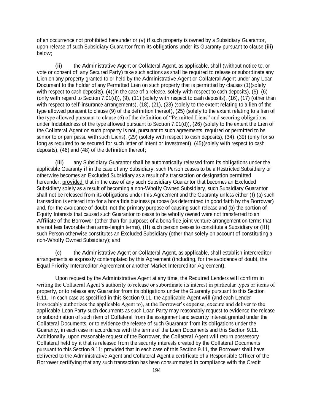 194 of an occurrence not prohibited hereunder or (v) if such property is owned by a Subsidiary Guarantor, upon release of such Subsidiary Guarantor from its obligations under its Guaranty pursuant to clause (iii) below; (ii) the Administrative Agent or Collateral Agent, as applicable, shall (without notice to, or vote or consent of, any Secured Party) take such actions as shall be required to release or subordinate any Lien on any property granted to or held by the Administrative Agent or Collateral Agent under any Loan Document to the holder of any Permitted Lien on such property that is permitted by clauses (1)(solely with respect to cash deposits), (4)(in the case of a release, solely with respect to cash deposits), (5), (6) (only with regard to Section 7.01(d)), (9), (11) (solely with respect to cash deposits), (16), (17) (other than with respect to self-insurance arrangements), (18), (21), (23) (solely to the extent relating to a lien of the type allowed pursuant to clause (9) of the definition thereof), (25) (solely to the extent relating to a lien of the type allowed pursuant to clause (6) of the definition of “Permitted Liens” and securing obligations under Indebtedness of the type allowed pursuant to Section 7.01(d)), (26) (solely to the extent the Lien of the Collateral Agent on such property is not, pursuant to such agreements, required or permitted to be senior to or pari passu with such Liens), (29) (solely with respect to cash deposits), (34), (39) (only for so long as required to be secured for such letter of intent or investment), (45)(solely with respect to cash deposits), (46) and (48) of the definition thereof; (iii) any Subsidiary Guarantor shall be automatically released from its obligations under the applicable Guaranty if in the case of any Subsidiary, such Person ceases to be a Restricted Subsidiary or otherwise becomes an Excluded Subsidiary as a result of a transaction or designation permitted hereunder; provided that in the case of any such Subsidiary Guarantor that becomes an Excluded Subsidiary solely as a result of becoming a non-Wholly Owned Subsidiary, such Subsidiary Guarantor shall not be released from its obligations under this Agreement and the Guaranty unless either (I) (a) such transaction is entered into for a bona fide business purpose (as determined in good faith by the Borrower) and, for the avoidance of doubt, not the primary purpose of causing such release and (b) the portion of Equity Interests that caused such Guarantor to cease to be wholly owned were not transferred to an Affiliate of the Borrower (other than for purposes of a bona fide joint venture arrangement on terms that are not less favorable than arms-length terms), (II) such person ceases to constitute a Subsidiary or (III) such Person otherwise constitutes an Excluded Subsidiary (other than solely on account of constituting a non-Wholly Owned Subsidiary); and (c) the Administrative Agent or Collateral Agent, as applicable, shall establish intercreditor arrangements as expressly contemplated by this Agreement (including, for the avoidance of doubt, the Equal Priority Intercreditor Agreement or another Market Intercreditor Agreement). Upon request by the Administrative Agent at any time, the Required Lenders will confirm in writing the Collateral Agent’s authority to release or subordinate its interest in particular types or items of property, or to release any Guarantor from its obligations under the Guaranty pursuant to this Section 9.11. In each case as specified in this Section 9.11, the applicable Agent will (and each Lender irrevocably authorizes the applicable Agent to), at the Borrower’s expense, execute and deliver to the applicable Loan Party such documents as such Loan Party may reasonably request to evidence the release or subordination of such item of Collateral from the assignment and security interest granted under the Collateral Documents, or to evidence the release of such Guarantor from its obligations under the Guaranty, in each case in accordance with the terms of the Loan Documents and this Section 9.11. Additionally, upon reasonable request of the Borrower, the Collateral Agent will return possessory Collateral held by it that is released from the security interests created by the Collateral Documents pursuant to this Section 9.11; provided that in each case of this Section 9.11, the Borrower shall have delivered to the Administrative Agent and Collateral Agent a certificate of a Responsible Officer of the Borrower certifying that any such transaction has been consummated in compliance with the Credit