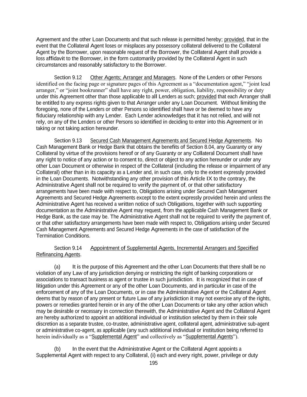 195 Agreement and the other Loan Documents and that such release is permitted hereby; provided, that in the event that the Collateral Agent loses or misplaces any possessory collateral delivered to the Collateral Agent by the Borrower, upon reasonable request of the Borrower, the Collateral Agent shall provide a loss affidavit to the Borrower, in the form customarily provided by the Collateral Agent in such circumstances and reasonably satisfactory to the Borrower. Section 9.12 Other Agents; Arranger and Managers. None of the Lenders or other Persons identified on the facing page or signature pages of this Agreement as a “documentation agent,” “joint lead arranger,” or “joint bookrunner” shall have any right, power, obligation, liability, responsibility or duty under this Agreement other than those applicable to all Lenders as such; provided that each Arranger shall be entitled to any express rights given to that Arranger under any Loan Document. Without limiting the foregoing, none of the Lenders or other Persons so identified shall have or be deemed to have any fiduciary relationship with any Lender. Each Lender acknowledges that it has not relied, and will not rely, on any of the Lenders or other Persons so identified in deciding to enter into this Agreement or in taking or not taking action hereunder. Section 9.13 Secured Cash Management Agreements and Secured Hedge Agreements. No Cash Management Bank or Hedge Bank that obtains the benefits of Section 8.04, any Guaranty or any Collateral by virtue of the provisions hereof or of any Guaranty or any Collateral Document shall have any right to notice of any action or to consent to, direct or object to any action hereunder or under any other Loan Document or otherwise in respect of the Collateral (including the release or impairment of any Collateral) other than in its capacity as a Lender and, in such case, only to the extent expressly provided in the Loan Documents. Notwithstanding any other provision of this Article IX to the contrary, the Administrative Agent shall not be required to verify the payment of, or that other satisfactory arrangements have been made with respect to, Obligations arising under Secured Cash Management Agreements and Secured Hedge Agreements except to the extent expressly provided herein and unless the Administrative Agent has received a written notice of such Obligations, together with such supporting documentation as the Administrative Agent may request, from the applicable Cash Management Bank or Hedge Bank, as the case may be. The Administrative Agent shall not be required to verify the payment of, or that other satisfactory arrangements have been made with respect to, Obligations arising under Secured Cash Management Agreements and Secured Hedge Agreements in the case of satisfaction of the Termination Conditions. Section 9.14 Appointment of Supplemental Agents, Incremental Arrangers and Specified Refinancing Agents. (a) It is the purpose of this Agreement and the other Loan Documents that there shall be no violation of any Law of any jurisdiction denying or restricting the right of banking corporations or associations to transact business as agent or trustee in such jurisdiction. It is recognized that in case of litigation under this Agreement or any of the other Loan Documents, and in particular in case of the enforcement of any of the Loan Documents, or in case the Administrative Agent or the Collateral Agent deems that by reason of any present or future Law of any jurisdiction it may not exercise any of the rights, powers or remedies granted herein or in any of the other Loan Documents or take any other action which may be desirable or necessary in connection therewith, the Administrative Agent and the Collateral Agent are hereby authorized to appoint an additional individual or institution selected by them in their sole discretion as a separate trustee, co-trustee, administrative agent, collateral agent, administrative sub-agent or administrative co-agent, as applicable (any such additional individual or institution being referred to herein individually as a “Supplemental Agent” and collectively as “Supplemental Agents”). (b) In the event that the Administrative Agent or the Collateral Agent appoints a Supplemental Agent with respect to any Collateral, (i) each and every right, power, privilege or duty