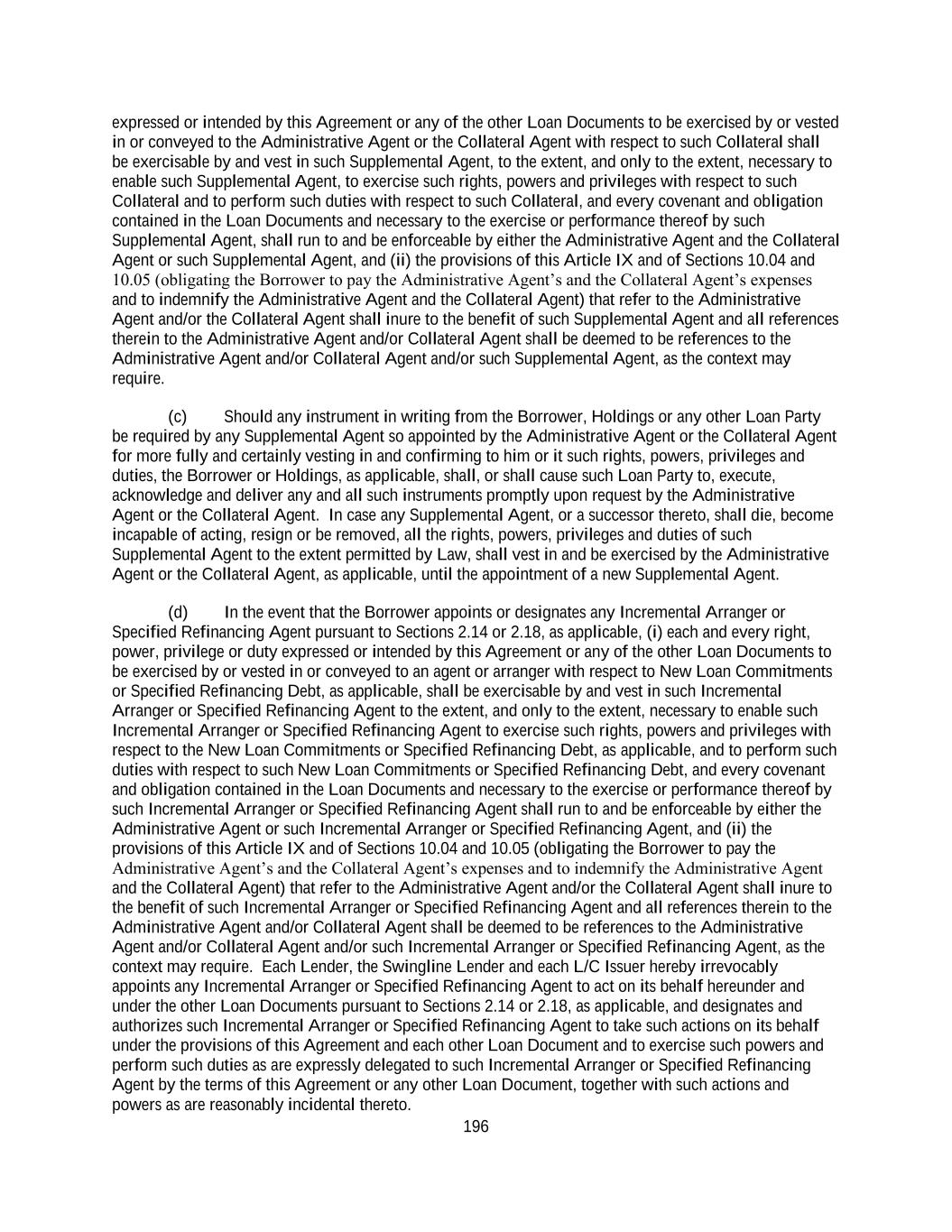 196 expressed or intended by this Agreement or any of the other Loan Documents to be exercised by or vested in or conveyed to the Administrative Agent or the Collateral Agent with respect to such Collateral shall be exercisable by and vest in such Supplemental Agent, to the extent, and only to the extent, necessary to enable such Supplemental Agent, to exercise such rights, powers and privileges with respect to such Collateral and to perform such duties with respect to such Collateral, and every covenant and obligation contained in the Loan Documents and necessary to the exercise or performance thereof by such Supplemental Agent, shall run to and be enforceable by either the Administrative Agent and the Collateral Agent or such Supplemental Agent, and (ii) the provisions of this Article IX and of Sections 10.04 and 10.05 (obligating the Borrower to pay the Administrative Agent’s and the Collateral Agent’s expenses and to indemnify the Administrative Agent and the Collateral Agent) that refer to the Administrative Agent and/or the Collateral Agent shall inure to the benefit of such Supplemental Agent and all references therein to the Administrative Agent and/or Collateral Agent shall be deemed to be references to the Administrative Agent and/or Collateral Agent and/or such Supplemental Agent, as the context may require. (c) Should any instrument in writing from the Borrower, Holdings or any other Loan Party be required by any Supplemental Agent so appointed by the Administrative Agent or the Collateral Agent for more fully and certainly vesting in and confirming to him or it such rights, powers, privileges and duties, the Borrower or Holdings, as applicable, shall, or shall cause such Loan Party to, execute, acknowledge and deliver any and all such instruments promptly upon request by the Administrative Agent or the Collateral Agent. In case any Supplemental Agent, or a successor thereto, shall die, become incapable of acting, resign or be removed, all the rights, powers, privileges and duties of such Supplemental Agent to the extent permitted by Law, shall vest in and be exercised by the Administrative Agent or the Collateral Agent, as applicable, until the appointment of a new Supplemental Agent. (d) In the event that the Borrower appoints or designates any Incremental Arranger or Specified Refinancing Agent pursuant to Sections 2.14 or 2.18, as applicable, (i) each and every right, power, privilege or duty expressed or intended by this Agreement or any of the other Loan Documents to be exercised by or vested in or conveyed to an agent or arranger with respect to New Loan Commitments or Specified Refinancing Debt, as applicable, shall be exercisable by and vest in such Incremental Arranger or Specified Refinancing Agent to the extent, and only to the extent, necessary to enable such Incremental Arranger or Specified Refinancing Agent to exercise such rights, powers and privileges with respect to the New Loan Commitments or Specified Refinancing Debt, as applicable, and to perform such duties with respect to such New Loan Commitments or Specified Refinancing Debt, and every covenant and obligation contained in the Loan Documents and necessary to the exercise or performance thereof by such Incremental Arranger or Specified Refinancing Agent shall run to and be enforceable by either the Administrative Agent or such Incremental Arranger or Specified Refinancing Agent, and (ii) the provisions of this Article IX and of Sections 10.04 and 10.05 (obligating the Borrower to pay the Administrative Agent’s and the Collateral Agent’s expenses and to indemnify the Administrative Agent and the Collateral Agent) that refer to the Administrative Agent and/or the Collateral Agent shall inure to the benefit of such Incremental Arranger or Specified Refinancing Agent and all references therein to the Administrative Agent and/or Collateral Agent shall be deemed to be references to the Administrative Agent and/or Collateral Agent and/or such Incremental Arranger or Specified Refinancing Agent, as the context may require. Each Lender, the Swingline Lender and each L/C Issuer hereby irrevocably appoints any Incremental Arranger or Specified Refinancing Agent to act on its behalf hereunder and under the other Loan Documents pursuant to Sections 2.14 or 2.18, as applicable, and designates and authorizes such Incremental Arranger or Specified Refinancing Agent to take such actions on its behalf under the provisions of this Agreement and each other Loan Document and to exercise such powers and perform such duties as are expressly delegated to such Incremental Arranger or Specified Refinancing Agent by the terms of this Agreement or any other Loan Document, together with such actions and powers as are reasonably incidental thereto.