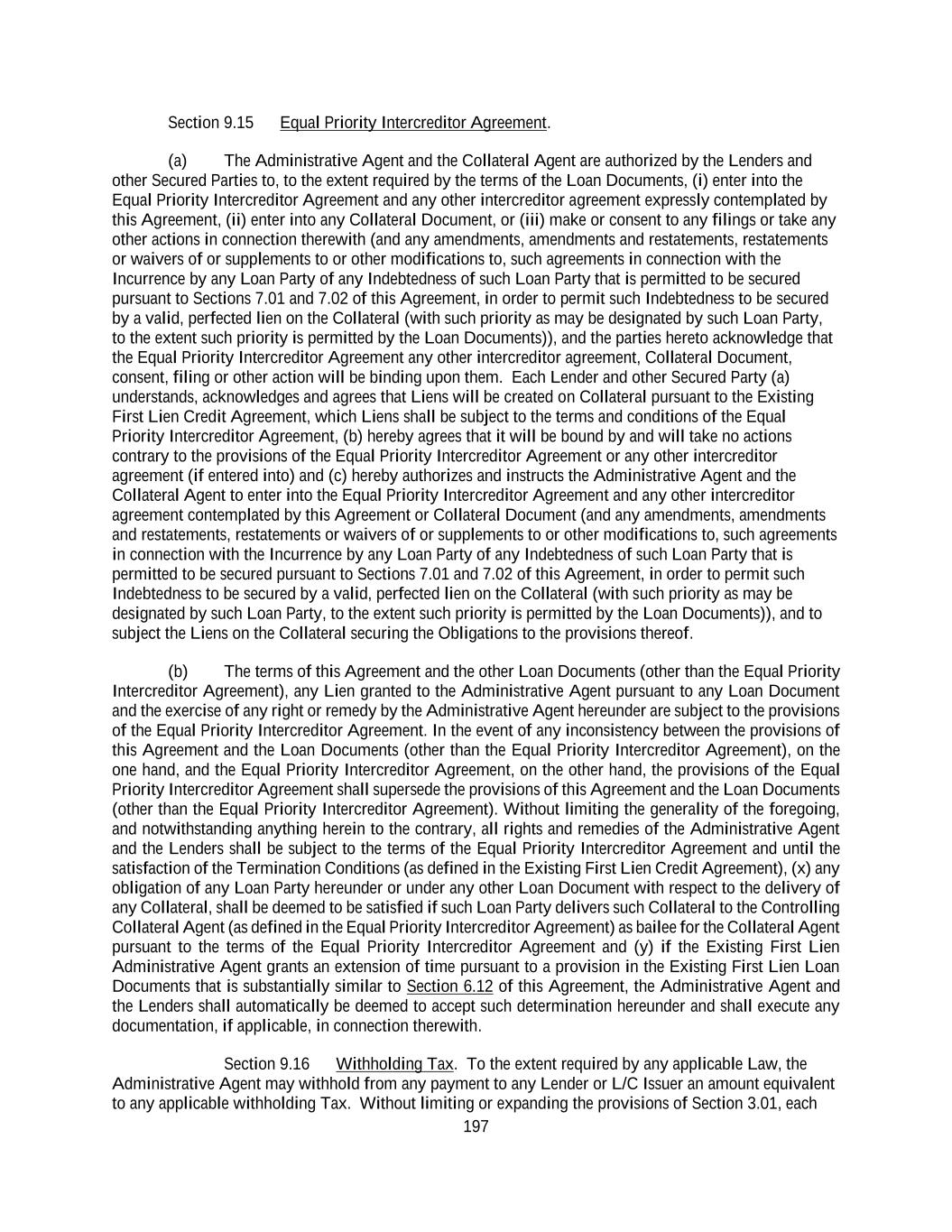 197 Section 9.15 Equal Priority Intercreditor Agreement. (a) The Administrative Agent and the Collateral Agent are authorized by the Lenders and other Secured Parties to, to the extent required by the terms of the Loan Documents, (i) enter into the Equal Priority Intercreditor Agreement and any other intercreditor agreement expressly contemplated by this Agreement, (ii) enter into any Collateral Document, or (iii) make or consent to any filings or take any other actions in connection therewith (and any amendments, amendments and restatements, restatements or waivers of or supplements to or other modifications to, such agreements in connection with the Incurrence by any Loan Party of any Indebtedness of such Loan Party that is permitted to be secured pursuant to Sections 7.01 and 7.02 of this Agreement, in order to permit such Indebtedness to be secured by a valid, perfected lien on the Collateral (with such priority as may be designated by such Loan Party, to the extent such priority is permitted by the Loan Documents)), and the parties hereto acknowledge that the Equal Priority Intercreditor Agreement any other intercreditor agreement, Collateral Document, consent, filing or other action will be binding upon them. Each Lender and other Secured Party (a) understands, acknowledges and agrees that Liens will be created on Collateral pursuant to the Existing First Lien Credit Agreement, which Liens shall be subject to the terms and conditions of the Equal Priority Intercreditor Agreement, (b) hereby agrees that it will be bound by and will take no actions contrary to the provisions of the Equal Priority Intercreditor Agreement or any other intercreditor agreement (if entered into) and (c) hereby authorizes and instructs the Administrative Agent and the Collateral Agent to enter into the Equal Priority Intercreditor Agreement and any other intercreditor agreement contemplated by this Agreement or Collateral Document (and any amendments, amendments and restatements, restatements or waivers of or supplements to or other modifications to, such agreements in connection with the Incurrence by any Loan Party of any Indebtedness of such Loan Party that is permitted to be secured pursuant to Sections 7.01 and 7.02 of this Agreement, in order to permit such Indebtedness to be secured by a valid, perfected lien on the Collateral (with such priority as may be designated by such Loan Party, to the extent such priority is permitted by the Loan Documents)), and to subject the Liens on the Collateral securing the Obligations to the provisions thereof. (b) The terms of this Agreement and the other Loan Documents (other than the Equal Priority Intercreditor Agreement), any Lien granted to the Administrative Agent pursuant to any Loan Document and the exercise of any right or remedy by the Administrative Agent hereunder are subject to the provisions of the Equal Priority Intercreditor Agreement. In the event of any inconsistency between the provisions of this Agreement and the Loan Documents (other than the Equal Priority Intercreditor Agreement), on the one hand, and the Equal Priority Intercreditor Agreement, on the other hand, the provisions of the Equal Priority Intercreditor Agreement shall supersede the provisions of this Agreement and the Loan Documents (other than the Equal Priority Intercreditor Agreement). Without limiting the generality of the foregoing, and notwithstanding anything herein to the contrary, all rights and remedies of the Administrative Agent and the Lenders shall be subject to the terms of the Equal Priority Intercreditor Agreement and until the satisfaction of the Termination Conditions (as defined in the Existing First Lien Credit Agreement), (x) any obligation of any Loan Party hereunder or under any other Loan Document with respect to the delivery of any Collateral, shall be deemed to be satisfied if such Loan Party delivers such Collateral to the Controlling Collateral Agent (as defined in the Equal Priority Intercreditor Agreement) as bailee for the Collateral Agent pursuant to the terms of the Equal Priority Intercreditor Agreement and (y) if the Existing First Lien Administrative Agent grants an extension of time pursuant to a provision in the Existing First Lien Loan Documents that is substantially similar to Section 6.12 of this Agreement, the Administrative Agent and the Lenders shall automatically be deemed to accept such determination hereunder and shall execute any documentation, if applicable, in connection therewith. Section 9.16 Withholding Tax. To the extent required by any applicable Law, the Administrative Agent may withhold from any payment to any Lender or L/C Issuer an amount equivalent to any applicable withholding Tax. Without limiting or expanding the provisions of Section 3.01, each