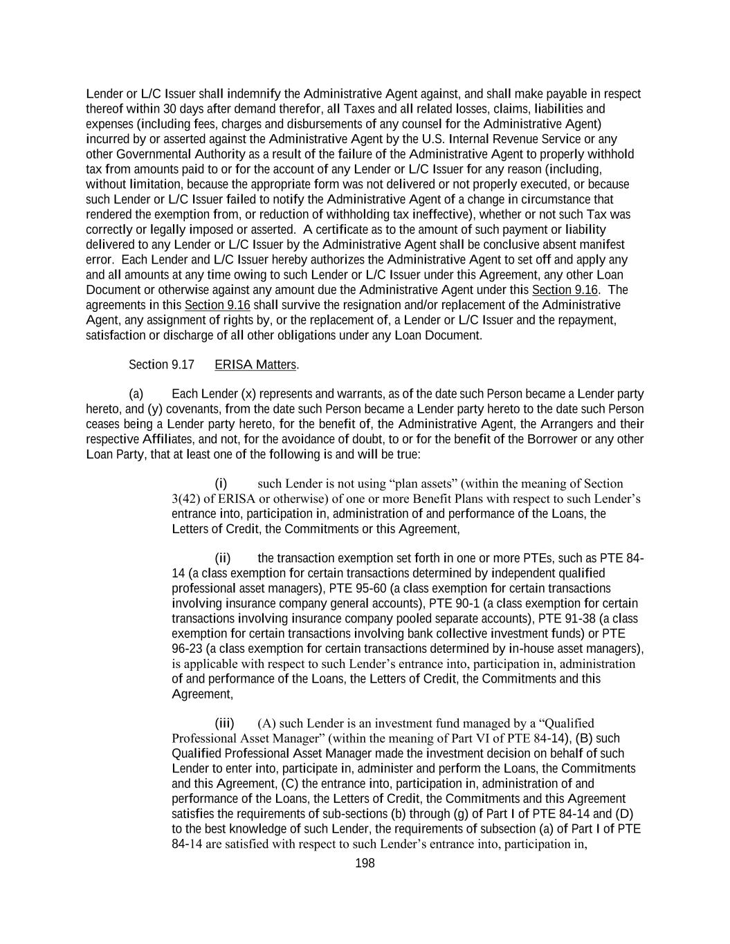 198 Lender or L/C Issuer shall indemnify the Administrative Agent against, and shall make payable in respect thereof within 30 days after demand therefor, all Taxes and all related losses, claims, liabilities and expenses (including fees, charges and disbursements of any counsel for the Administrative Agent) incurred by or asserted against the Administrative Agent by the U.S. Internal Revenue Service or any other Governmental Authority as a result of the failure of the Administrative Agent to properly withhold tax from amounts paid to or for the account of any Lender or L/C Issuer for any reason (including, without limitation, because the appropriate form was not delivered or not properly executed, or because such Lender or L/C Issuer failed to notify the Administrative Agent of a change in circumstance that rendered the exemption from, or reduction of withholding tax ineffective), whether or not such Tax was correctly or legally imposed or asserted. A certificate as to the amount of such payment or liability delivered to any Lender or L/C Issuer by the Administrative Agent shall be conclusive absent manifest error. Each Lender and L/C Issuer hereby authorizes the Administrative Agent to set off and apply any and all amounts at any time owing to such Lender or L/C Issuer under this Agreement, any other Loan Document or otherwise against any amount due the Administrative Agent under this Section 9.16. The agreements in this Section 9.16 shall survive the resignation and/or replacement of the Administrative Agent, any assignment of rights by, or the replacement of, a Lender or L/C Issuer and the repayment, satisfaction or discharge of all other obligations under any Loan Document. Section 9.17 ERISA Matters. (a) Each Lender (x) represents and warrants, as of the date such Person became a Lender party hereto, and (y) covenants, from the date such Person became a Lender party hereto to the date such Person ceases being a Lender party hereto, for the benefit of, the Administrative Agent, the Arrangers and their respective Affiliates, and not, for the avoidance of doubt, to or for the benefit of the Borrower or any other Loan Party, that at least one of the following is and will be true: (i) such Lender is not using “plan assets” (within the meaning of Section 3(42) of ERISA or otherwise) of one or more Benefit Plans with respect to such Lender’s entrance into, participation in, administration of and performance of the Loans, the Letters of Credit, the Commitments or this Agreement, (ii) the transaction exemption set forth in one or more PTEs, such as PTE 84- 14 (a class exemption for certain transactions determined by independent qualified professional asset managers), PTE 95-60 (a class exemption for certain transactions involving insurance company general accounts), PTE 90-1 (a class exemption for certain transactions involving insurance company pooled separate accounts), PTE 91-38 (a class exemption for certain transactions involving bank collective investment funds) or PTE 96-23 (a class exemption for certain transactions determined by in-house asset managers), is applicable with respect to such Lender’s entrance into, participation in, administration of and performance of the Loans, the Letters of Credit, the Commitments and this Agreement, (iii) (A) such Lender is an investment fund managed by a “Qualified Professional Asset Manager” (within the meaning of Part VI of PTE 84-14), (B) such Qualified Professional Asset Manager made the investment decision on behalf of such Lender to enter into, participate in, administer and perform the Loans, the Commitments and this Agreement, (C) the entrance into, participation in, administration of and performance of the Loans, the Letters of Credit, the Commitments and this Agreement satisfies the requirements of sub-sections (b) through (g) of Part I of PTE 84-14 and (D) to the best knowledge of such Lender, the requirements of subsection (a) of Part I of PTE 84-14 are satisfied with respect to such Lender’s entrance into, participation in,
