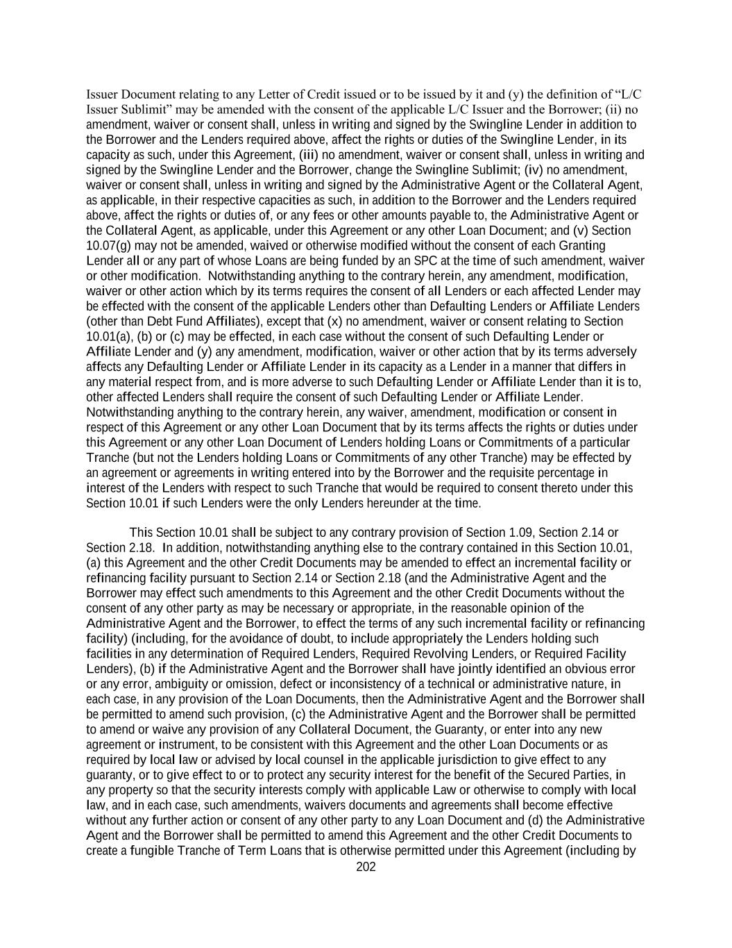 202 Issuer Document relating to any Letter of Credit issued or to be issued by it and (y) the definition of “L/C Issuer Sublimit” may be amended with the consent of the applicable L/C Issuer and the Borrower; (ii) no amendment, waiver or consent shall, unless in writing and signed by the Swingline Lender in addition to the Borrower and the Lenders required above, affect the rights or duties of the Swingline Lender, in its capacity as such, under this Agreement, (iii) no amendment, waiver or consent shall, unless in writing and signed by the Swingline Lender and the Borrower, change the Swingline Sublimit; (iv) no amendment, waiver or consent shall, unless in writing and signed by the Administrative Agent or the Collateral Agent, as applicable, in their respective capacities as such, in addition to the Borrower and the Lenders required above, affect the rights or duties of, or any fees or other amounts payable to, the Administrative Agent or the Collateral Agent, as applicable, under this Agreement or any other Loan Document; and (v) Section 10.07(g) may not be amended, waived or otherwise modified without the consent of each Granting Lender all or any part of whose Loans are being funded by an SPC at the time of such amendment, waiver or other modification. Notwithstanding anything to the contrary herein, any amendment, modification, waiver or other action which by its terms requires the consent of all Lenders or each affected Lender may be effected with the consent of the applicable Lenders other than Defaulting Lenders or Affiliate Lenders (other than Debt Fund Affiliates), except that (x) no amendment, waiver or consent relating to Section 10.01(a), (b) or (c) may be effected, in each case without the consent of such Defaulting Lender or Affiliate Lender and (y) any amendment, modification, waiver or other action that by its terms adversely affects any Defaulting Lender or Affiliate Lender in its capacity as a Lender in a manner that differs in any material respect from, and is more adverse to such Defaulting Lender or Affiliate Lender than it is to, other affected Lenders shall require the consent of such Defaulting Lender or Affiliate Lender. Notwithstanding anything to the contrary herein, any waiver, amendment, modification or consent in respect of this Agreement or any other Loan Document that by its terms affects the rights or duties under this Agreement or any other Loan Document of Lenders holding Loans or Commitments of a particular Tranche (but not the Lenders holding Loans or Commitments of any other Tranche) may be effected by an agreement or agreements in writing entered into by the Borrower and the requisite percentage in interest of the Lenders with respect to such Tranche that would be required to consent thereto under this Section 10.01 if such Lenders were the only Lenders hereunder at the time. This Section 10.01 shall be subject to any contrary provision of Section 1.09, Section 2.14 or Section 2.18. In addition, notwithstanding anything else to the contrary contained in this Section 10.01, (a) this Agreement and the other Credit Documents may be amended to effect an incremental facility or refinancing facility pursuant to Section 2.14 or Section 2.18 (and the Administrative Agent and the Borrower may effect such amendments to this Agreement and the other Credit Documents without the consent of any other party as may be necessary or appropriate, in the reasonable opinion of the Administrative Agent and the Borrower, to effect the terms of any such incremental facility or refinancing facility) (including, for the avoidance of doubt, to include appropriately the Lenders holding such facilities in any determination of Required Lenders, Required Revolving Lenders, or Required Facility Lenders), (b) if the Administrative Agent and the Borrower shall have jointly identified an obvious error or any error, ambiguity or omission, defect or inconsistency of a technical or administrative nature, in each case, in any provision of the Loan Documents, then the Administrative Agent and the Borrower shall be permitted to amend such provision, (c) the Administrative Agent and the Borrower shall be permitted to amend or waive any provision of any Collateral Document, the Guaranty, or enter into any new agreement or instrument, to be consistent with this Agreement and the other Loan Documents or as required by local law or advised by local counsel in the applicable jurisdiction to give effect to any guaranty, or to give effect to or to protect any security interest for the benefit of the Secured Parties, in any property so that the security interests comply with applicable Law or otherwise to comply with local law, and in each case, such amendments, waivers documents and agreements shall become effective without any further action or consent of any other party to any Loan Document and (d) the Administrative Agent and the Borrower shall be permitted to amend this Agreement and the other Credit Documents to create a fungible Tranche of Term Loans that is otherwise permitted under this Agreement (including by