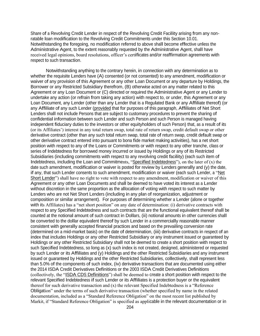 204 Share of a Revolving Credit Lender in respect of the Revolving Credit Facility arising from any non- ratable loan modification to the Revolving Credit Commitments under this Section 10.01. Notwithstanding the foregoing, no modification referred to above shall become effective unless the Administrative Agent, to the extent reasonably requested by the Administrative Agent, shall have received legal opinions, board resolutions, officer’s certificates and/or reaffirmation agreements with respect to such transaction. Notwithstanding anything to the contrary herein, in connection with any determination as to whether the requisite Lenders have (A) consented (or not consented) to any amendment, modification or waiver of any provision of this Agreement or any other Loan Document or any departure by Holdings, the Borrower or any Restricted Subsidiary therefrom, (B) otherwise acted on any matter related to this Agreement or any Loan Document or (C) directed or required the Administrative Agent or any Lender to undertake any action (or refrain from taking any action) with respect to, or under, this Agreement or any Loan Document, any Lender (other than any Lender that is a Regulated Bank or any Affiliate thereof) (or any Affiliate of any such Lender (provided that for purposes of this paragraph, Affiliates of Net Short Lenders shall not include Persons that are subject to customary procedures to prevent the sharing of confidential information between such Lender and such Person and such Person is managed having independent fiduciary duties to the investors or other equityholders of such Person) that, as a result of its (or its Affiliates’) interest in any total return swap, total rate of return swap, credit default swap or other derivative contract (other than any such total return swap, total rate of return swap, credit default swap or other derivative contract entered into pursuant to bona fide market making activities), has a net short position with respect to any of the Loans or Commitments or with respect to any other tranche, class or series of Indebtedness for borrowed money incurred or issued by Holdings or any of its Restricted Subsidiaries (including commitments with respect to any revolving credit facility) (each such item of Indebtedness, including the Loan and Commitments, “Specified Indebtedness”), on the later of (x) the date such amendment, modification or waiver is posted for review by Lenders generally and (y) the date, if any, that such Lender consents to such amendment, modification or waiver (each such Lender, a “Net Short Lender”) shall have no right to vote with respect to any amendment, modification or waiver of this Agreement or any other Loan Documents and shall be deemed to have voted its interest as a Lender without discretion in the same proportion as the allocation of voting with respect to such matter by Lenders who are not Net Short Lenders (including in any plan of reorganization, adjustment or composition or similar arrangement). For purposes of determining whether a Lender (alone or together with its Affiliates) has a “net short position” on any date of determination: (i) derivative contracts with respect to any Specified Indebtedness and such contracts that are the functional equivalent thereof shall be counted at the notional amount of such contract in Dollars, (ii) notional amounts in other currencies shall be converted to the dollar equivalent thereof by such Lender in a commercially reasonable manner consistent with generally accepted financial practices and based on the prevailing conversion rate (determined on a mid-market basis) on the date of determination, (iii) derivative contracts in respect of an index that includes Holdings or any other Restricted Subsidiary or any instrument issued or guaranteed by Holdings or any other Restricted Subsidiary shall not be deemed to create a short position with respect to such Specified Indebtedness, so long as (x) such index is not created, designed, administered or requested by such Lender or its Affiliates and (y) Holdings and the other Restricted Subsidiaries and any instrument issued or guaranteed by Holdings and the other Restricted Subsidiaries, collectively, shall represent less than 5.0% of the components of such index, (iv) derivative transactions that are documented using either the 2014 ISDA Credit Derivatives Definitions or the 2003 ISDA Credit Derivatives Definitions (collectively, the “ISDA CDS Definitions”) shall be deemed to create a short position with respect to the relevant Specified Indebtedness if such Lender or its Affiliates is a protection buyer or the equivalent thereof for such derivative transaction and (x) the relevant Specified Indebtedness is a “Reference Obligation” under the terms of such derivative transaction (whether specified by name in the related documentation, included as a “Standard Reference Obligation” on the most recent list published by Markit, if “Standard Reference Obligation” is specified as applicable in the relevant documentation or in