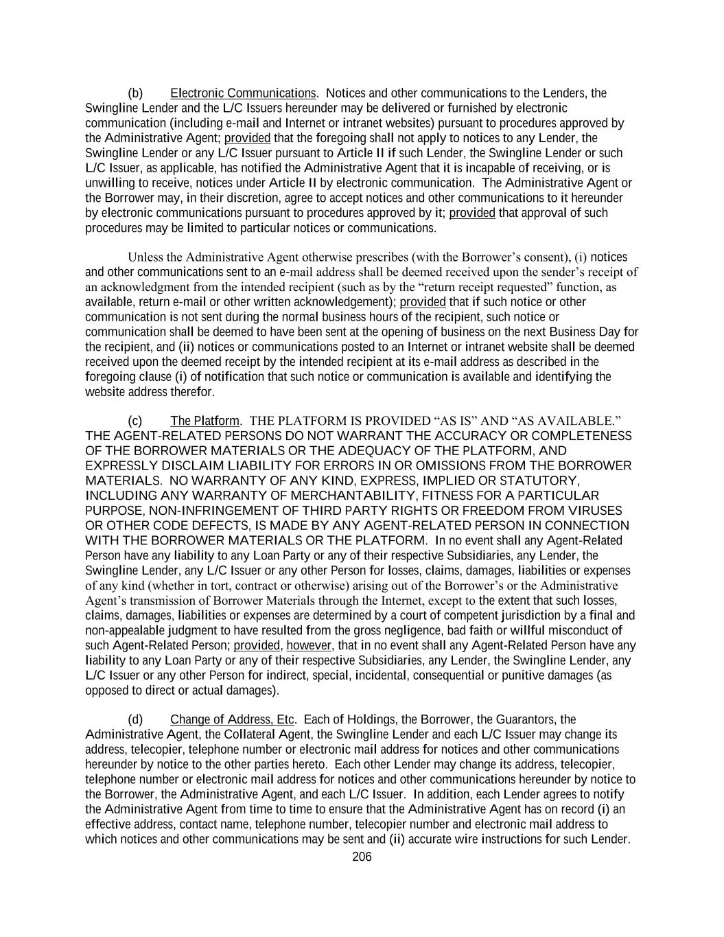 206 (b) Electronic Communications. Notices and other communications to the Lenders, the Swingline Lender and the L/C Issuers hereunder may be delivered or furnished by electronic communication (including e-mail and Internet or intranet websites) pursuant to procedures approved by the Administrative Agent; provided that the foregoing shall not apply to notices to any Lender, the Swingline Lender or any L/C Issuer pursuant to Article II if such Lender, the Swingline Lender or such L/C Issuer, as applicable, has notified the Administrative Agent that it is incapable of receiving, or is unwilling to receive, notices under Article II by electronic communication. The Administrative Agent or the Borrower may, in their discretion, agree to accept notices and other communications to it hereunder by electronic communications pursuant to procedures approved by it; provided that approval of such procedures may be limited to particular notices or communications. Unless the Administrative Agent otherwise prescribes (with the Borrower’s consent), (i) notices and other communications sent to an e-mail address shall be deemed received upon the sender’s receipt of an acknowledgment from the intended recipient (such as by the “return receipt requested” function, as available, return e-mail or other written acknowledgement); provided that if such notice or other communication is not sent during the normal business hours of the recipient, such notice or communication shall be deemed to have been sent at the opening of business on the next Business Day for the recipient, and (ii) notices or communications posted to an Internet or intranet website shall be deemed received upon the deemed receipt by the intended recipient at its e-mail address as described in the foregoing clause (i) of notification that such notice or communication is available and identifying the website address therefor. (c) The Platform. THE PLATFORM IS PROVIDED “AS IS” AND “AS AVAILABLE.” THE AGENT-RELATED PERSONS DO NOT WARRANT THE ACCURACY OR COMPLETENESS OF THE BORROWER MATERIALS OR THE ADEQUACY OF THE PLATFORM, AND EXPRESSLY DISCLAIM LIABILITY FOR ERRORS IN OR OMISSIONS FROM THE BORROWER MATERIALS. NO WARRANTY OF ANY KIND, EXPRESS, IMPLIED OR STATUTORY, INCLUDING ANY WARRANTY OF MERCHANTABILITY, FITNESS FOR A PARTICULAR PURPOSE, NON-INFRINGEMENT OF THIRD PARTY RIGHTS OR FREEDOM FROM VIRUSES OR OTHER CODE DEFECTS, IS MADE BY ANY AGENT-RELATED PERSON IN CONNECTION WITH THE BORROWER MATERIALS OR THE PLATFORM. In no event shall any Agent-Related Person have any liability to any Loan Party or any of their respective Subsidiaries, any Lender, the Swingline Lender, any L/C Issuer or any other Person for losses, claims, damages, liabilities or expenses of any kind (whether in tort, contract or otherwise) arising out of the Borrower’s or the Administrative Agent’s transmission of Borrower Materials through the Internet, except to the extent that such losses, claims, damages, liabilities or expenses are determined by a court of competent jurisdiction by a final and non-appealable judgment to have resulted from the gross negligence, bad faith or willful misconduct of such Agent-Related Person; provided, however, that in no event shall any Agent-Related Person have any liability to any Loan Party or any of their respective Subsidiaries, any Lender, the Swingline Lender, any L/C Issuer or any other Person for indirect, special, incidental, consequential or punitive damages (as opposed to direct or actual damages). (d) Change of Address, Etc. Each of Holdings, the Borrower, the Guarantors, the Administrative Agent, the Collateral Agent, the Swingline Lender and each L/C Issuer may change its address, telecopier, telephone number or electronic mail address for notices and other communications hereunder by notice to the other parties hereto. Each other Lender may change its address, telecopier, telephone number or electronic mail address for notices and other communications hereunder by notice to the Borrower, the Administrative Agent, and each L/C Issuer. In addition, each Lender agrees to notify the Administrative Agent from time to time to ensure that the Administrative Agent has on record (i) an effective address, contact name, telephone number, telecopier number and electronic mail address to which notices and other communications may be sent and (ii) accurate wire instructions for such Lender.
