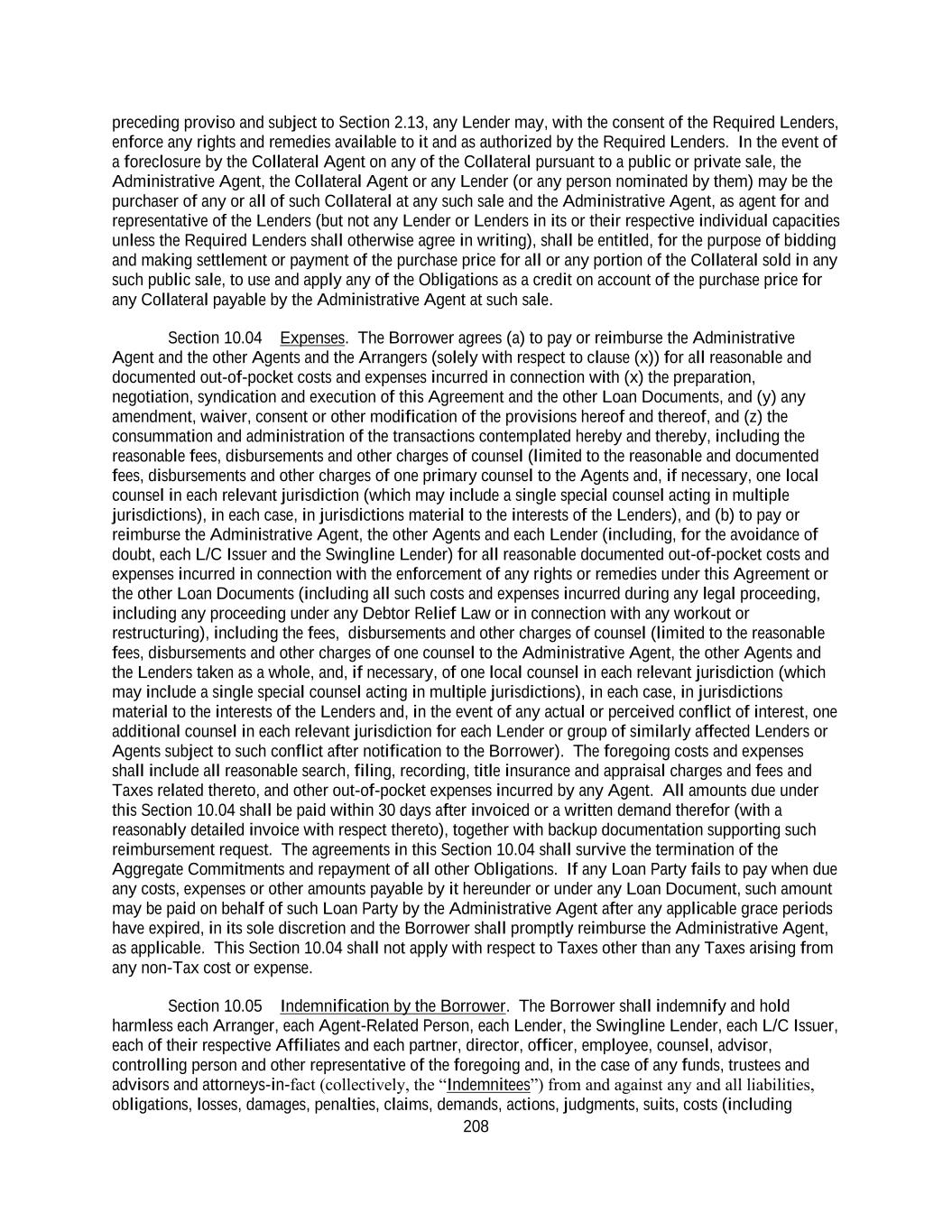 208 preceding proviso and subject to Section 2.13, any Lender may, with the consent of the Required Lenders, enforce any rights and remedies available to it and as authorized by the Required Lenders. In the event of a foreclosure by the Collateral Agent on any of the Collateral pursuant to a public or private sale, the Administrative Agent, the Collateral Agent or any Lender (or any person nominated by them) may be the purchaser of any or all of such Collateral at any such sale and the Administrative Agent, as agent for and representative of the Lenders (but not any Lender or Lenders in its or their respective individual capacities unless the Required Lenders shall otherwise agree in writing), shall be entitled, for the purpose of bidding and making settlement or payment of the purchase price for all or any portion of the Collateral sold in any such public sale, to use and apply any of the Obligations as a credit on account of the purchase price for any Collateral payable by the Administrative Agent at such sale. Section 10.04 Expenses. The Borrower agrees (a) to pay or reimburse the Administrative Agent and the other Agents and the Arrangers (solely with respect to clause (x)) for all reasonable and documented out-of-pocket costs and expenses incurred in connection with (x) the preparation, negotiation, syndication and execution of this Agreement and the other Loan Documents, and (y) any amendment, waiver, consent or other modification of the provisions hereof and thereof, and (z) the consummation and administration of the transactions contemplated hereby and thereby, including the reasonable fees, disbursements and other charges of counsel (limited to the reasonable and documented fees, disbursements and other charges of one primary counsel to the Agents and, if necessary, one local counsel in each relevant jurisdiction (which may include a single special counsel acting in multiple jurisdictions), in each case, in jurisdictions material to the interests of the Lenders), and (b) to pay or reimburse the Administrative Agent, the other Agents and each Lender (including, for the avoidance of doubt, each L/C Issuer and the Swingline Lender) for all reasonable documented out-of-pocket costs and expenses incurred in connection with the enforcement of any rights or remedies under this Agreement or the other Loan Documents (including all such costs and expenses incurred during any legal proceeding, including any proceeding under any Debtor Relief Law or in connection with any workout or restructuring), including the fees, disbursements and other charges of counsel (limited to the reasonable fees, disbursements and other charges of one counsel to the Administrative Agent, the other Agents and the Lenders taken as a whole, and, if necessary, of one local counsel in each relevant jurisdiction (which may include a single special counsel acting in multiple jurisdictions), in each case, in jurisdictions material to the interests of the Lenders and, in the event of any actual or perceived conflict of interest, one additional counsel in each relevant jurisdiction for each Lender or group of similarly affected Lenders or Agents subject to such conflict after notification to the Borrower). The foregoing costs and expenses shall include all reasonable search, filing, recording, title insurance and appraisal charges and fees and Taxes related thereto, and other out-of-pocket expenses incurred by any Agent. All amounts due under this Section 10.04 shall be paid within 30 days after invoiced or a written demand therefor (with a reasonably detailed invoice with respect thereto), together with backup documentation supporting such reimbursement request. The agreements in this Section 10.04 shall survive the termination of the Aggregate Commitments and repayment of all other Obligations. If any Loan Party fails to pay when due any costs, expenses or other amounts payable by it hereunder or under any Loan Document, such amount may be paid on behalf of such Loan Party by the Administrative Agent after any applicable grace periods have expired, in its sole discretion and the Borrower shall promptly reimburse the Administrative Agent, as applicable. This Section 10.04 shall not apply with respect to Taxes other than any Taxes arising from any non-Tax cost or expense. Section 10.05 Indemnification by the Borrower. The Borrower shall indemnify and hold harmless each Arranger, each Agent-Related Person, each Lender, the Swingline Lender, each L/C Issuer, each of their respective Affiliates and each partner, director, officer, employee, counsel, advisor, controlling person and other representative of the foregoing and, in the case of any funds, trustees and advisors and attorneys-in-fact (collectively, the “Indemnitees”) from and against any and all liabilities, obligations, losses, damages, penalties, claims, demands, actions, judgments, suits, costs (including