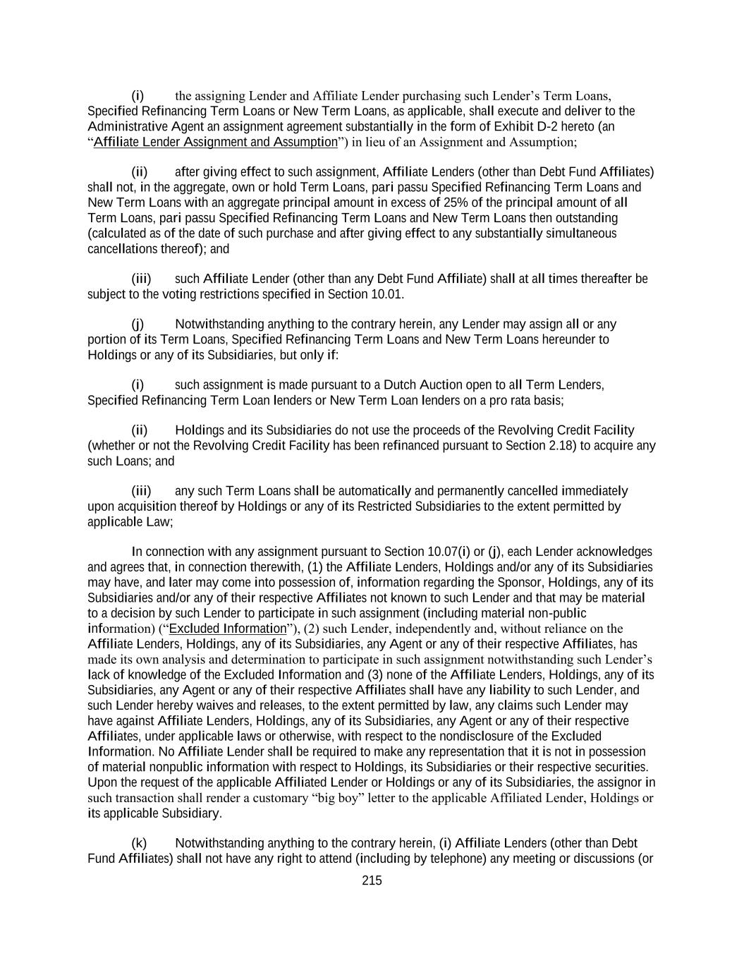 215 (i) the assigning Lender and Affiliate Lender purchasing such Lender’s Term Loans, Specified Refinancing Term Loans or New Term Loans, as applicable, shall execute and deliver to the Administrative Agent an assignment agreement substantially in the form of Exhibit D-2 hereto (an “Affiliate Lender Assignment and Assumption”) in lieu of an Assignment and Assumption; (ii) after giving effect to such assignment, Affiliate Lenders (other than Debt Fund Affiliates) shall not, in the aggregate, own or hold Term Loans, pari passu Specified Refinancing Term Loans and New Term Loans with an aggregate principal amount in excess of 25% of the principal amount of all Term Loans, pari passu Specified Refinancing Term Loans and New Term Loans then outstanding (calculated as of the date of such purchase and after giving effect to any substantially simultaneous cancellations thereof); and (iii) such Affiliate Lender (other than any Debt Fund Affiliate) shall at all times thereafter be subject to the voting restrictions specified in Section 10.01. (j) Notwithstanding anything to the contrary herein, any Lender may assign all or any portion of its Term Loans, Specified Refinancing Term Loans and New Term Loans hereunder to Holdings or any of its Subsidiaries, but only if: (i) such assignment is made pursuant to a Dutch Auction open to all Term Lenders, Specified Refinancing Term Loan lenders or New Term Loan lenders on a pro rata basis; (ii) Holdings and its Subsidiaries do not use the proceeds of the Revolving Credit Facility (whether or not the Revolving Credit Facility has been refinanced pursuant to Section 2.18) to acquire any such Loans; and (iii) any such Term Loans shall be automatically and permanently cancelled immediately upon acquisition thereof by Holdings or any of its Restricted Subsidiaries to the extent permitted by applicable Law; In connection with any assignment pursuant to Section 10.07(i) or (j), each Lender acknowledges and agrees that, in connection therewith, (1) the Affiliate Lenders, Holdings and/or any of its Subsidiaries may have, and later may come into possession of, information regarding the Sponsor, Holdings, any of its Subsidiaries and/or any of their respective Affiliates not known to such Lender and that may be material to a decision by such Lender to participate in such assignment (including material non-public information) (“Excluded Information”), (2) such Lender, independently and, without reliance on the Affiliate Lenders, Holdings, any of its Subsidiaries, any Agent or any of their respective Affiliates, has made its own analysis and determination to participate in such assignment notwithstanding such Lender’s lack of knowledge of the Excluded Information and (3) none of the Affiliate Lenders, Holdings, any of its Subsidiaries, any Agent or any of their respective Affiliates shall have any liability to such Lender, and such Lender hereby waives and releases, to the extent permitted by law, any claims such Lender may have against Affiliate Lenders, Holdings, any of its Subsidiaries, any Agent or any of their respective Affiliates, under applicable laws or otherwise, with respect to the nondisclosure of the Excluded Information. No Affiliate Lender shall be required to make any representation that it is not in possession of material nonpublic information with respect to Holdings, its Subsidiaries or their respective securities. Upon the request of the applicable Affiliated Lender or Holdings or any of its Subsidiaries, the assignor in such transaction shall render a customary “big boy” letter to the applicable Affiliated Lender, Holdings or its applicable Subsidiary. (k) Notwithstanding anything to the contrary herein, (i) Affiliate Lenders (other than Debt Fund Affiliates) shall not have any right to attend (including by telephone) any meeting or discussions (or