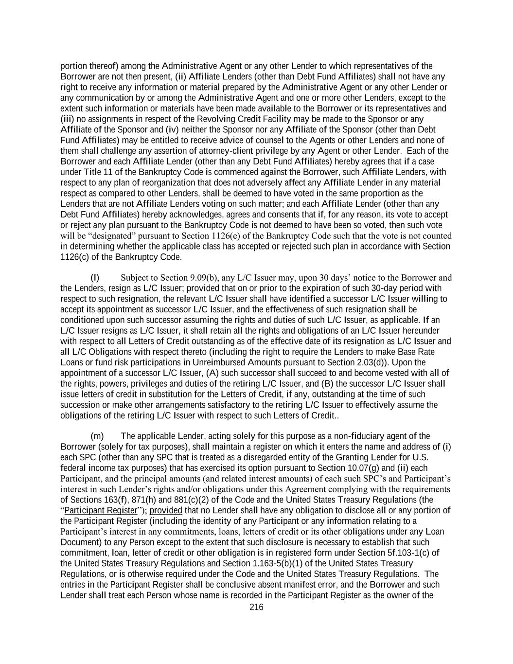 216 portion thereof) among the Administrative Agent or any other Lender to which representatives of the Borrower are not then present, (ii) Affiliate Lenders (other than Debt Fund Affiliates) shall not have any right to receive any information or material prepared by the Administrative Agent or any other Lender or any communication by or among the Administrative Agent and one or more other Lenders, except to the extent such information or materials have been made available to the Borrower or its representatives and (iii) no assignments in respect of the Revolving Credit Facility may be made to the Sponsor or any Affiliate of the Sponsor and (iv) neither the Sponsor nor any Affiliate of the Sponsor (other than Debt Fund Affiliates) may be entitled to receive advice of counsel to the Agents or other Lenders and none of them shall challenge any assertion of attorney-client privilege by any Agent or other Lender. Each of the Borrower and each Affiliate Lender (other than any Debt Fund Affiliates) hereby agrees that if a case under Title 11 of the Bankruptcy Code is commenced against the Borrower, such Affiliate Lenders, with respect to any plan of reorganization that does not adversely affect any Affiliate Lender in any material respect as compared to other Lenders, shall be deemed to have voted in the same proportion as the Lenders that are not Affiliate Lenders voting on such matter; and each Affiliate Lender (other than any Debt Fund Affiliates) hereby acknowledges, agrees and consents that if, for any reason, its vote to accept or reject any plan pursuant to the Bankruptcy Code is not deemed to have been so voted, then such vote will be “designated” pursuant to Section 1126(e) of the Bankruptcy Code such that the vote is not counted in determining whether the applicable class has accepted or rejected such plan in accordance with Section 1126(c) of the Bankruptcy Code. (l) Subject to Section 9.09(b), any L/C Issuer may, upon 30 days’ notice to the Borrower and the Lenders, resign as L/C Issuer; provided that on or prior to the expiration of such 30-day period with respect to such resignation, the relevant L/C Issuer shall have identified a successor L/C Issuer willing to accept its appointment as successor L/C Issuer, and the effectiveness of such resignation shall be conditioned upon such successor assuming the rights and duties of such L/C Issuer, as applicable. If an L/C Issuer resigns as L/C Issuer, it shall retain all the rights and obligations of an L/C Issuer hereunder with respect to all Letters of Credit outstanding as of the effective date of its resignation as L/C Issuer and all L/C Obligations with respect thereto (including the right to require the Lenders to make Base Rate Loans or fund risk participations in Unreimbursed Amounts pursuant to Section 2.03(d)). Upon the appointment of a successor L/C Issuer, (A) such successor shall succeed to and become vested with all of the rights, powers, privileges and duties of the retiring L/C Issuer, and (B) the successor L/C Issuer shall issue letters of credit in substitution for the Letters of Credit, if any, outstanding at the time of such succession or make other arrangements satisfactory to the retiring L/C Issuer to effectively assume the obligations of the retiring L/C Issuer with respect to such Letters of Credit.. (m) The applicable Lender, acting solely for this purpose as a non-fiduciary agent of the Borrower (solely for tax purposes), shall maintain a register on which it enters the name and address of (i) each SPC (other than any SPC that is treated as a disregarded entity of the Granting Lender for U.S. federal income tax purposes) that has exercised its option pursuant to Section 10.07(g) and (ii) each Participant, and the principal amounts (and related interest amounts) of each such SPC’s and Participant’s interest in such Lender’s rights and/or obligations under this Agreement complying with the requirements of Sections 163(f), 871(h) and 881(c)(2) of the Code and the United States Treasury Regulations (the “Participant Register”); provided that no Lender shall have any obligation to disclose all or any portion of the Participant Register (including the identity of any Participant or any information relating to a Participant’s interest in any commitments, loans, letters of credit or its other obligations under any Loan Document) to any Person except to the extent that such disclosure is necessary to establish that such commitment, loan, letter of credit or other obligation is in registered form under Section 5f.103-1(c) of the United States Treasury Regulations and Section 1.163-5(b)(1) of the United States Treasury Regulations, or is otherwise required under the Code and the United States Treasury Regulations. The entries in the Participant Register shall be conclusive absent manifest error, and the Borrower and such Lender shall treat each Person whose name is recorded in the Participant Register as the owner of the