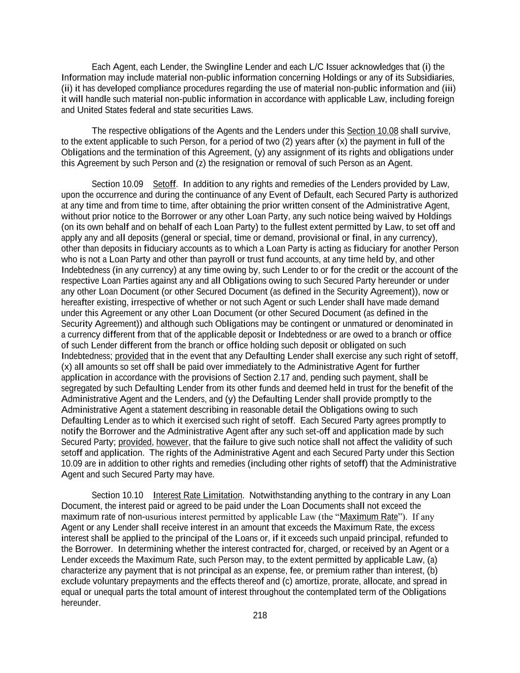218 Each Agent, each Lender, the Swingline Lender and each L/C Issuer acknowledges that (i) the Information may include material non-public information concerning Holdings or any of its Subsidiaries, (ii) it has developed compliance procedures regarding the use of material non-public information and (iii) it will handle such material non-public information in accordance with applicable Law, including foreign and United States federal and state securities Laws. The respective obligations of the Agents and the Lenders under this Section 10.08 shall survive, to the extent applicable to such Person, for a period of two (2) years after (x) the payment in full of the Obligations and the termination of this Agreement, (y) any assignment of its rights and obligations under this Agreement by such Person and (z) the resignation or removal of such Person as an Agent. Section 10.09 Setoff. In addition to any rights and remedies of the Lenders provided by Law, upon the occurrence and during the continuance of any Event of Default, each Secured Party is authorized at any time and from time to time, after obtaining the prior written consent of the Administrative Agent, without prior notice to the Borrower or any other Loan Party, any such notice being waived by Holdings (on its own behalf and on behalf of each Loan Party) to the fullest extent permitted by Law, to set off and apply any and all deposits (general or special, time or demand, provisional or final, in any currency), other than deposits in fiduciary accounts as to which a Loan Party is acting as fiduciary for another Person who is not a Loan Party and other than payroll or trust fund accounts, at any time held by, and other Indebtedness (in any currency) at any time owing by, such Lender to or for the credit or the account of the respective Loan Parties against any and all Obligations owing to such Secured Party hereunder or under any other Loan Document (or other Secured Document (as defined in the Security Agreement)), now or hereafter existing, irrespective of whether or not such Agent or such Lender shall have made demand under this Agreement or any other Loan Document (or other Secured Document (as defined in the Security Agreement)) and although such Obligations may be contingent or unmatured or denominated in a currency different from that of the applicable deposit or Indebtedness or are owed to a branch or office of such Lender different from the branch or office holding such deposit or obligated on such Indebtedness; provided that in the event that any Defaulting Lender shall exercise any such right of setoff, (x) all amounts so set off shall be paid over immediately to the Administrative Agent for further application in accordance with the provisions of Section 2.17 and, pending such payment, shall be segregated by such Defaulting Lender from its other funds and deemed held in trust for the benefit of the Administrative Agent and the Lenders, and (y) the Defaulting Lender shall provide promptly to the Administrative Agent a statement describing in reasonable detail the Obligations owing to such Defaulting Lender as to which it exercised such right of setoff. Each Secured Party agrees promptly to notify the Borrower and the Administrative Agent after any such set-off and application made by such Secured Party; provided, however, that the failure to give such notice shall not affect the validity of such setoff and application. The rights of the Administrative Agent and each Secured Party under this Section 10.09 are in addition to other rights and remedies (including other rights of setoff) that the Administrative Agent and such Secured Party may have. Section 10.10 Interest Rate Limitation. Notwithstanding anything to the contrary in any Loan Document, the interest paid or agreed to be paid under the Loan Documents shall not exceed the maximum rate of non-usurious interest permitted by applicable Law (the “Maximum Rate”). If any Agent or any Lender shall receive interest in an amount that exceeds the Maximum Rate, the excess interest shall be applied to the principal of the Loans or, if it exceeds such unpaid principal, refunded to the Borrower. In determining whether the interest contracted for, charged, or received by an Agent or a Lender exceeds the Maximum Rate, such Person may, to the extent permitted by applicable Law, (a) characterize any payment that is not principal as an expense, fee, or premium rather than interest, (b) exclude voluntary prepayments and the effects thereof and (c) amortize, prorate, allocate, and spread in equal or unequal parts the total amount of interest throughout the contemplated term of the Obligations hereunder.