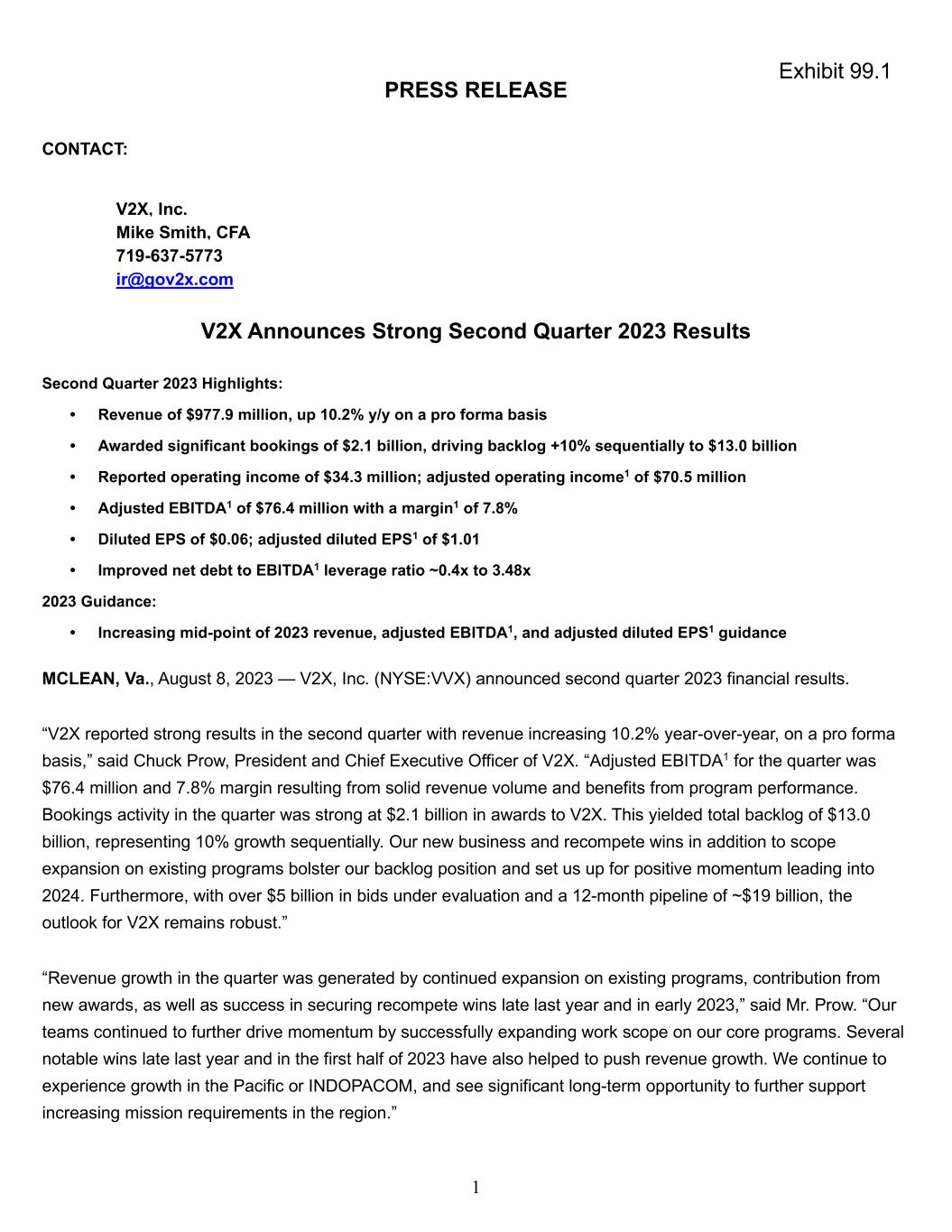 1 PRESS RELEASE CONTACT: V2X, Inc. Mike Smith, CFA 719-637-5773 ir@gov2x.com V2X Announces Strong Second Quarter 2023 Results Second Quarter 2023 Highlights: • Revenue of $977.9 million, up 10.2% y/y on a pro forma basis • Awarded significant bookings of $2.1 billion, driving backlog +10% sequentially to $13.0 billion • Reported operating income of $34.3 million; adjusted operating income1 of $70.5 million • Adjusted EBITDA1 of $76.4 million with a margin1 of 7.8% • Diluted EPS of $0.06; adjusted diluted EPS1 of $1.01 • Improved net debt to EBITDA1 leverage ratio ~0.4x to 3.48x 2023 Guidance: • Increasing mid-point of 2023 revenue, adjusted EBITDA1, and adjusted diluted EPS1 guidance MCLEAN, Va., August 8, 2023 — V2X, Inc. (NYSE:VVX) announced second quarter 2023 financial results. “V2X reported strong results in the second quarter with revenue increasing 10.2% year-over-year, on a pro forma basis,” said Chuck Prow, President and Chief Executive Officer of V2X. “Adjusted EBITDA1 for the quarter was $76.4 million and 7.8% margin resulting from solid revenue volume and benefits from program performance. Bookings activity in the quarter was strong at $2.1 billion in awards to V2X. This yielded total backlog of $13.0 billion, representing 10% growth sequentially. Our new business and recompete wins in addition to scope expansion on existing programs bolster our backlog position and set us up for positive momentum leading into 2024. Furthermore, with over $5 billion in bids under evaluation and a 12-month pipeline of ~$19 billion, the outlook for V2X remains robust.” “Revenue growth in the quarter was generated by continued expansion on existing programs, contribution from new awards, as well as success in securing recompete wins late last year and in early 2023,” said Mr. Prow. “Our teams continued to further drive momentum by successfully expanding work scope on our core programs. Several notable wins late last year and in the first half of 2023 have also helped to push revenue growth. We continue to experience growth in the Pacific or INDOPACOM, and see significant long-term opportunity to further support increasing mission requirements in the region.” Exhibit 99.1