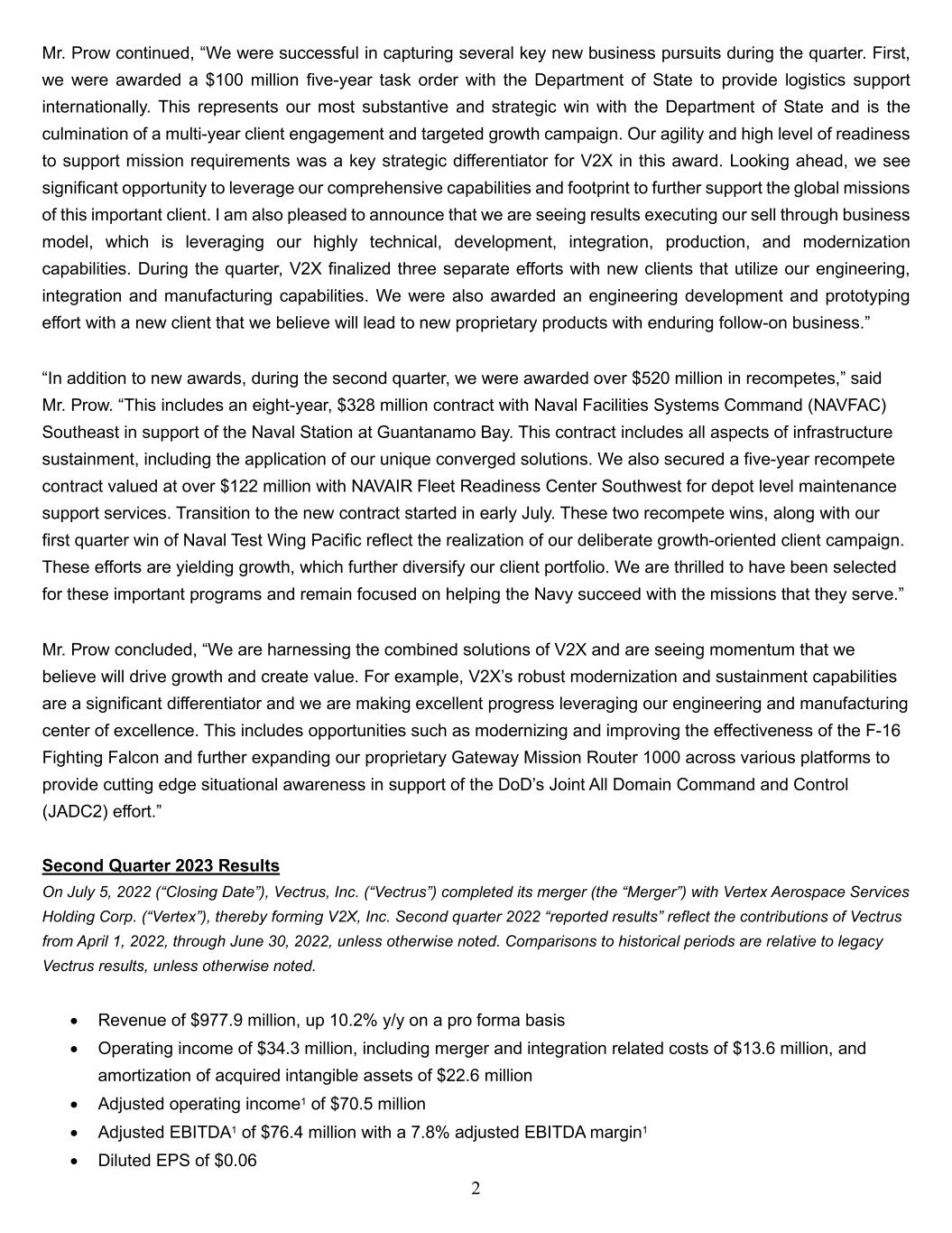 2 Mr. Prow continued, “We were successful in capturing several key new business pursuits during the quarter. First, we were awarded a $100 million five-year task order with the Department of State to provide logistics support internationally. This represents our most substantive and strategic win with the Department of State and is the culmination of a multi-year client engagement and targeted growth campaign. Our agility and high level of readiness to support mission requirements was a key strategic differentiator for V2X in this award. Looking ahead, we see significant opportunity to leverage our comprehensive capabilities and footprint to further support the global missions of this important client. I am also pleased to announce that we are seeing results executing our sell through business model, which is leveraging our highly technical, development, integration, production, and modernization capabilities. During the quarter, V2X finalized three separate efforts with new clients that utilize our engineering, integration and manufacturing capabilities. We were also awarded an engineering development and prototyping effort with a new client that we believe will lead to new proprietary products with enduring follow-on business.” “In addition to new awards, during the second quarter, we were awarded over $520 million in recompetes,” said Mr. Prow. “This includes an eight-year, $328 million contract with Naval Facilities Systems Command (NAVFAC) Southeast in support of the Naval Station at Guantanamo Bay. This contract includes all aspects of infrastructure sustainment, including the application of our unique converged solutions. We also secured a five-year recompete contract valued at over $122 million with NAVAIR Fleet Readiness Center Southwest for depot level maintenance support services. Transition to the new contract started in early July. These two recompete wins, along with our first quarter win of Naval Test Wing Pacific reflect the realization of our deliberate growth-oriented client campaign. These efforts are yielding growth, which further diversify our client portfolio. We are thrilled to have been selected for these important programs and remain focused on helping the Navy succeed with the missions that they serve.” Mr. Prow concluded, “We are harnessing the combined solutions of V2X and are seeing momentum that we believe will drive growth and create value. For example, V2X’s robust modernization and sustainment capabilities are a significant differentiator and we are making excellent progress leveraging our engineering and manufacturing center of excellence. This includes opportunities such as modernizing and improving the effectiveness of the F-16 Fighting Falcon and further expanding our proprietary Gateway Mission Router 1000 across various platforms to provide cutting edge situational awareness in support of the DoD’s Joint All Domain Command and Control (JADC2) effort.” Second Quarter 2023 Results On July 5, 2022 (“Closing Date”), Vectrus, Inc. (“Vectrus”) completed its merger (the “Merger”) with Vertex Aerospace Services Holding Corp. (“Vertex”), thereby forming V2X, Inc. Second quarter 2022 “reported results” reflect the contributions of Vectrus from April 1, 2022, through June 30, 2022, unless otherwise noted. Comparisons to historical periods are relative to legacy Vectrus results, unless otherwise noted. • Revenue of $977.9 million, up 10.2% y/y on a pro forma basis • Operating income of $34.3 million, including merger and integration related costs of $13.6 million, and amortization of acquired intangible assets of $22.6 million • Adjusted operating income1 of $70.5 million • Adjusted EBITDA1 of $76.4 million with a 7.8% adjusted EBITDA margin1 • Diluted EPS of $0.06