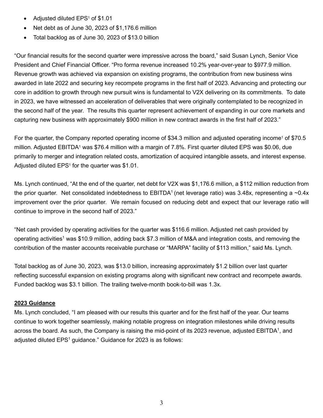 3 • Adjusted diluted EPS1 of $1.01 • Net debt as of June 30, 2023 of $1,176.6 million • Total backlog as of June 30, 2023 of $13.0 billion “Our financial results for the second quarter were impressive across the board,” said Susan Lynch, Senior Vice President and Chief Financial Officer. “Pro forma revenue increased 10.2% year-over-year to $977.9 million. Revenue growth was achieved via expansion on existing programs, the contribution from new business wins awarded in late 2022 and securing key recompete programs in the first half of 2023. Advancing and protecting our core in addition to growth through new pursuit wins is fundamental to V2X delivering on its commitments. To date in 2023, we have witnessed an acceleration of deliverables that were originally contemplated to be recognized in the second half of the year. The results this quarter represent achievement of expanding in our core markets and capturing new business with approximately $900 million in new contract awards in the first half of 2023.” For the quarter, the Company reported operating income of $34.3 million and adjusted operating income1 of $70.5 million. Adjusted EBITDA1 was $76.4 million with a margin of 7.8%. First quarter diluted EPS was $0.06, due primarily to merger and integration related costs, amortization of acquired intangible assets, and interest expense. Adjusted diluted EPS1 for the quarter was $1.01. Ms. Lynch continued, “At the end of the quarter, net debt for V2X was $1,176.6 million, a $112 million reduction from the prior quarter. Net consolidated indebtedness to EBITDA1 (net leverage ratio) was 3.48x, representing a ~0.4x improvement over the prior quarter. We remain focused on reducing debt and expect that our leverage ratio will continue to improve in the second half of 2023.” “Net cash provided by operating activities for the quarter was $116.6 million. Adjusted net cash provided by operating activities1 was $10.9 million, adding back $7.3 million of M&A and integration costs, and removing the contribution of the master accounts receivable purchase or “MARPA” facility of $113 million,” said Ms. Lynch. Total backlog as of June 30, 2023, was $13.0 billion, increasing approximately $1.2 billion over last quarter reflecting successful expansion on existing programs along with significant new contract and recompete awards. Funded backlog was $3.1 billion. The trailing twelve-month book-to-bill was 1.3x. 2023 Guidance Ms. Lynch concluded, “I am pleased with our results this quarter and for the first half of the year. Our teams continue to work together seamlessly, making notable progress on integration milestones while driving results across the board. As such, the Company is raising the mid-point of its 2023 revenue, adjusted EBITDA1, and adjusted diluted EPS1 guidance.” Guidance for 2023 is as follows: