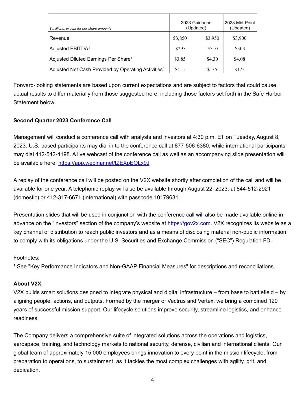 4 $ millions, except for per share amounts 2023 Guidance (Updated) 2023 Mid-Point (Updated) Revenue $3,850 $3,950 $3,900 Adjusted EBITDA1 $295 $310 $303 Adjusted Diluted Earnings Per Share1 $3.85 $4.30 $4.08 Adjusted Net Cash Provided by Operating Activities1 $115 $135 $125 Forward-looking statements are based upon current expectations and are subject to factors that could cause actual results to differ materially from those suggested here, including those factors set forth in the Safe Harbor Statement below. Second Quarter 2023 Conference Call Management will conduct a conference call with analysts and investors at 4:30 p.m. ET on Tuesday, August 8, 2023. U.S.-based participants may dial in to the conference call at 877-506-6380, while international participants may dial 412-542-4198. A live webcast of the conference call as well as an accompanying slide presentation will be available here: https://app.webinar.net/lZEXpEOLx9J A replay of the conference call will be posted on the V2X website shortly after completion of the call and will be available for one year. A telephonic replay will also be available through August 22, 2023, at 844-512-2921 (domestic) or 412-317-6671 (international) with passcode 10179631. Presentation slides that will be used in conjunction with the conference call will also be made available online in advance on the “investors” section of the company’s website at https://gov2x.com. V2X recognizes its website as a key channel of distribution to reach public investors and as a means of disclosing material non-public information to comply with its obligations under the U.S. Securities and Exchange Commission (“SEC”) Regulation FD. Footnotes: 1 See "Key Performance Indicators and Non-GAAP Financial Measures" for descriptions and reconciliations. About V2X V2X builds smart solutions designed to integrate physical and digital infrastructure – from base to battlefield – by aligning people, actions, and outputs. Formed by the merger of Vectrus and Vertex, we bring a combined 120 years of successful mission support. Our lifecycle solutions improve security, streamline logistics, and enhance readiness. The Company delivers a comprehensive suite of integrated solutions across the operations and logistics, aerospace, training, and technology markets to national security, defense, civilian and international clients. Our global team of approximately 15,000 employees brings innovation to every point in the mission lifecycle, from preparation to operations, to sustainment, as it tackles the most complex challenges with agility, grit, and dedication.