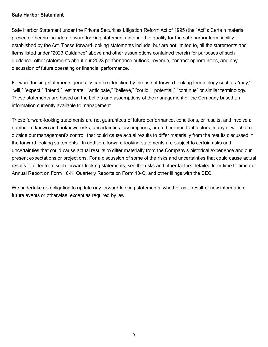 5 Safe Harbor Statement Safe Harbor Statement under the Private Securities Litigation Reform Act of 1995 (the "Act"): Certain material presented herein includes forward-looking statements intended to qualify for the safe harbor from liability established by the Act. These forward-looking statements include, but are not limited to, all the statements and items listed under "2023 Guidance" above and other assumptions contained therein for purposes of such guidance, other statements about our 2023 performance outlook, revenue, contract opportunities, and any discussion of future operating or financial performance. Forward-looking statements generally can be identified by the use of forward-looking terminology such as “may,” “will,” “expect,” “intend,” “estimate,” “anticipate,” “believe,” “could,” “potential,” “continue” or similar terminology. These statements are based on the beliefs and assumptions of the management of the Company based on information currently available to management. These forward-looking statements are not guarantees of future performance, conditions, or results, and involve a number of known and unknown risks, uncertainties, assumptions, and other important factors, many of which are outside our management’s control, that could cause actual results to differ materially from the results discussed in the forward-looking statements. In addition, forward-looking statements are subject to certain risks and uncertainties that could cause actual results to differ materially from the Company's historical experience and our present expectations or projections. For a discussion of some of the risks and uncertainties that could cause actual results to differ from such forward-looking statements, see the risks and other factors detailed from time to time our Annual Report on Form 10-K, Quarterly Reports on Form 10-Q, and other filings with the SEC. We undertake no obligation to update any forward-looking statements, whether as a result of new information, future events or otherwise, except as required by law.