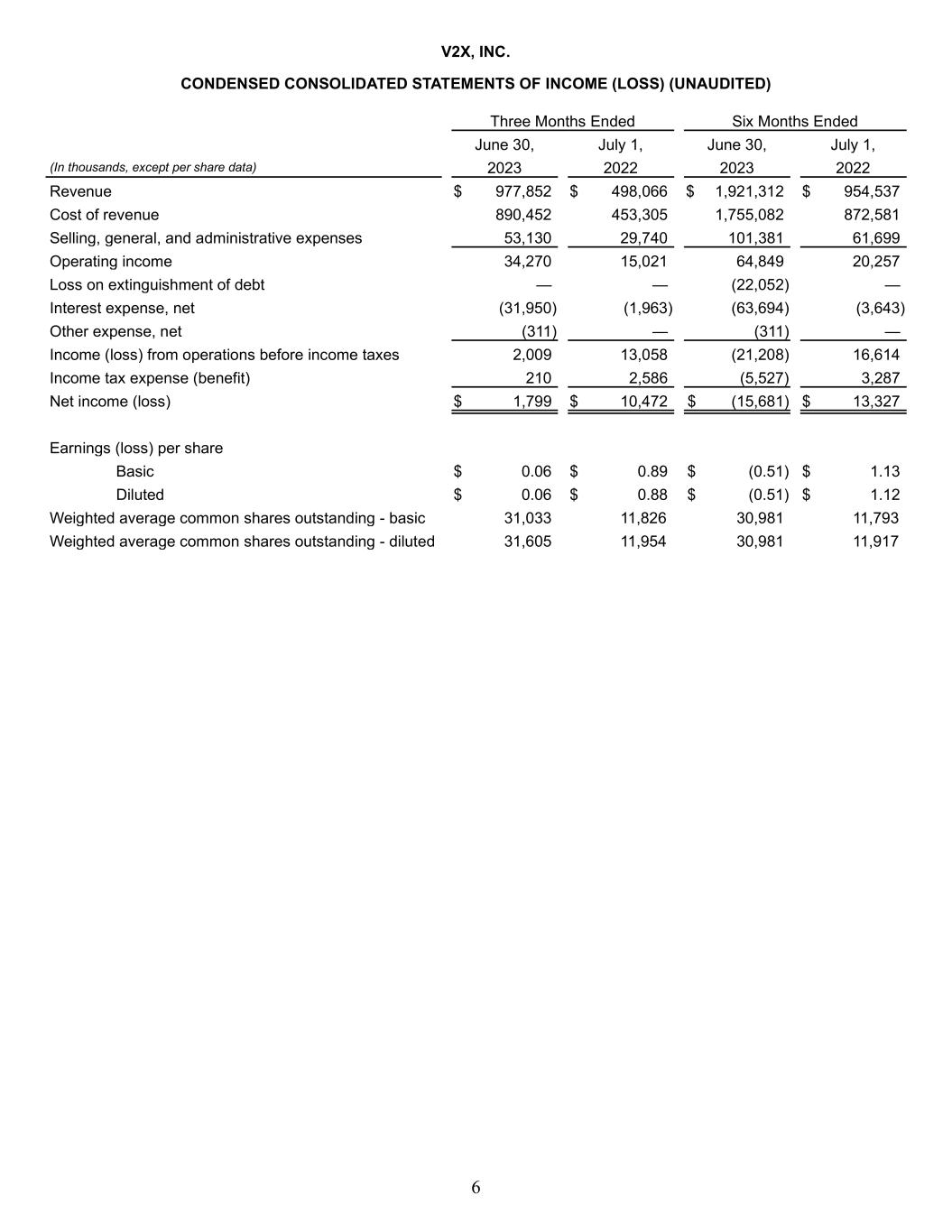 6 V2X, INC. CONDENSED CONSOLIDATED STATEMENTS OF INCOME (LOSS) (UNAUDITED) Three Months Ended Six Months Ended June 30, July 1, June 30, July 1, (In thousands, except per share data) 2023 2022 2023 2022 Revenue $ 977,852 $ 498,066 $ 1,921,312 $ 954,537 Cost of revenue 890,452 453,305 1,755,082 872,581 Selling, general, and administrative expenses 53,130 29,740 101,381 61,699 Operating income 34,270 15,021 64,849 20,257 Loss on extinguishment of debt — — (22,052) — Interest expense, net (31,950) (1,963) (63,694) (3,643) Other expense, net (311) — (311) — Income (loss) from operations before income taxes 2,009 13,058 (21,208) 16,614 Income tax expense (benefit) 210 2,586 (5,527) 3,287 Net income (loss) $ 1,799 $ 10,472 $ (15,681) $ 13,327 Earnings (loss) per share Basic $ 0.06 $ 0.89 $ (0.51) $ 1.13 Diluted $ 0.06 $ 0.88 $ (0.51) $ 1.12 Weighted average common shares outstanding - basic 31,033 11,826 30,981 11,793 Weighted average common shares outstanding - diluted 31,605 11,954 30,981 11,917