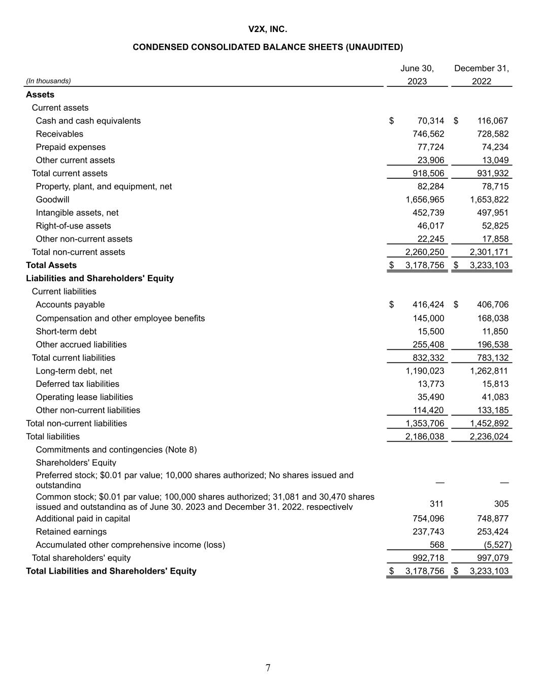 7 V2X, INC. CONDENSED CONSOLIDATED BALANCE SHEETS (UNAUDITED) June 30, December 31, (In thousands) 2023 2022 Assets Current assets Cash and cash equivalents $ 70,314 $ 116,067 Receivables 746,562 728,582 Prepaid expenses 77,724 74,234 Other current assets 23,906 13,049 Total current assets 918,506 931,932 Property, plant, and equipment, net 82,284 78,715 Goodwill 1,656,965 1,653,822 Intangible assets, net 452,739 497,951 Right-of-use assets 46,017 52,825 Other non-current assets 22,245 17,858 Total non-current assets 2,260,250 2,301,171 Total Assets $ 3,178,756 $ 3,233,103 Liabilities and Shareholders' Equity Current liabilities Accounts payable $ 416,424 $ 406,706 Compensation and other employee benefits 145,000 168,038 Short-term debt 15,500 11,850 Other accrued liabilities 255,408 196,538 Total current liabilities 832,332 783,132 Long-term debt, net 1,190,023 1,262,811 Deferred tax liabilities 13,773 15,813 Operating lease liabilities 35,490 41,083 Other non-current liabilities 114,420 133,185 Total non-current liabilities 1,353,706 1,452,892 Total liabilities 2,186,038 2,236,024 Commitments and contingencies (Note 8) Shareholders' Equity Preferred stock; $0.01 par value; 10,000 shares authorized; No shares issued and outstanding — — Common stock; $0.01 par value; 100,000 shares authorized; 31,081 and 30,470 shares issued and outstanding as of June 30, 2023 and December 31, 2022, respectively 311 305 Additional paid in capital 754,096 748,877 Retained earnings 237,743 253,424 Accumulated other comprehensive income (loss) 568 (5,527) Total shareholders' equity 992,718 997,079 Total Liabilities and Shareholders' Equity $ 3,178,756 $ 3,233,103