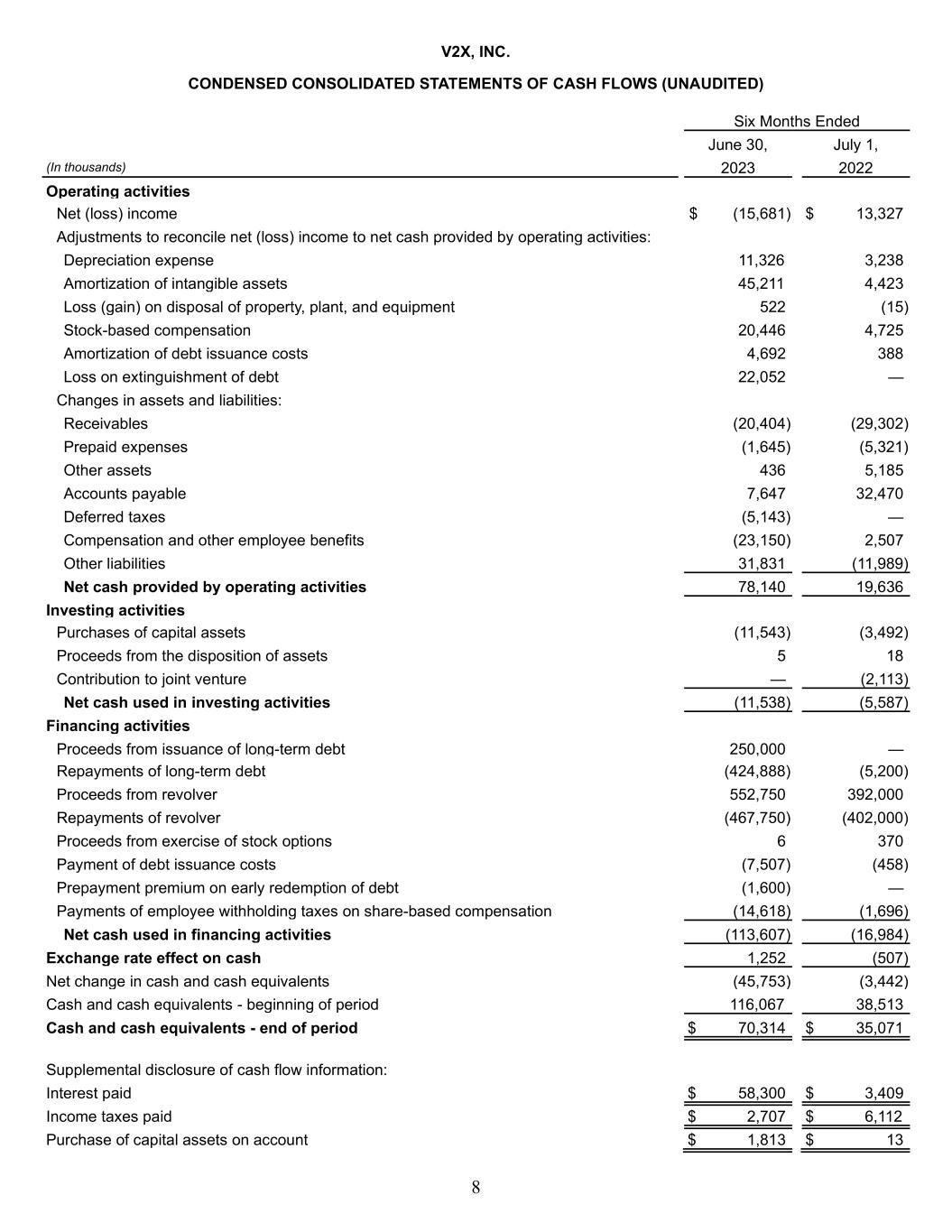 8 V2X, INC. CONDENSED CONSOLIDATED STATEMENTS OF CASH FLOWS (UNAUDITED) Six Months Ended June 30, July 1, (In thousands) 2023 2022 Operating activities Net (loss) income $ (15,681) $ 13,327 Adjustments to reconcile net (loss) income to net cash provided by operating activities: Depreciation expense 11,326 3,238 Amortization of intangible assets 45,211 4,423 Loss (gain) on disposal of property, plant, and equipment 522 (15) Stock-based compensation 20,446 4,725 Amortization of debt issuance costs 4,692 388 Loss on extinguishment of debt 22,052 — Changes in assets and liabilities: Receivables (20,404) (29,302) Prepaid expenses (1,645) (5,321) Other assets 436 5,185 Accounts payable 7,647 32,470 Deferred taxes (5,143) — Compensation and other employee benefits (23,150) 2,507 Other liabilities 31,831 (11,989) Net cash provided by operating activities 78,140 19,636 Investing activities Purchases of capital assets (11,543) (3,492) Proceeds from the disposition of assets 5 18 Contribution to joint venture — (2,113) Net cash used in investing activities (11,538) (5,587) Financing activities Proceeds from issuance of long-term debt 250,000 — Repayments of long-term debt (424,888) (5,200) Proceeds from revolver 552,750 392,000 Repayments of revolver (467,750) (402,000) Proceeds from exercise of stock options 6 370 Payment of debt issuance costs (7,507) (458) Prepayment premium on early redemption of debt (1,600) — Payments of employee withholding taxes on share-based compensation (14,618) (1,696) Net cash used in financing activities (113,607) (16,984) Exchange rate effect on cash 1,252 (507) Net change in cash and cash equivalents (45,753) (3,442) Cash and cash equivalents - beginning of period 116,067 38,513 Cash and cash equivalents - end of period $ 70,314 $ 35,071 Supplemental disclosure of cash flow information: Interest paid $ 58,300 $ 3,409 Income taxes paid $ 2,707 $ 6,112 Purchase of capital assets on account $ 1,813 $ 13