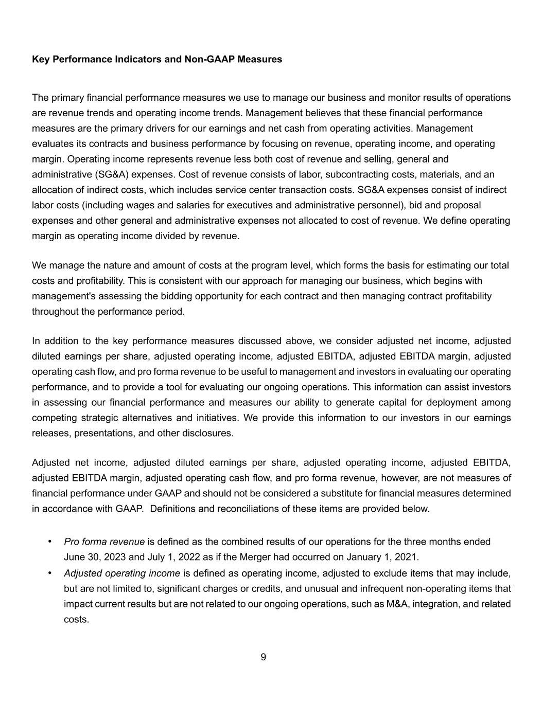 9 Key Performance Indicators and Non-GAAP Measures The primary financial performance measures we use to manage our business and monitor results of operations are revenue trends and operating income trends. Management believes that these financial performance measures are the primary drivers for our earnings and net cash from operating activities. Management evaluates its contracts and business performance by focusing on revenue, operating income, and operating margin. Operating income represents revenue less both cost of revenue and selling, general and administrative (SG&A) expenses. Cost of revenue consists of labor, subcontracting costs, materials, and an allocation of indirect costs, which includes service center transaction costs. SG&A expenses consist of indirect labor costs (including wages and salaries for executives and administrative personnel), bid and proposal expenses and other general and administrative expenses not allocated to cost of revenue. We define operating margin as operating income divided by revenue. We manage the nature and amount of costs at the program level, which forms the basis for estimating our total costs and profitability. This is consistent with our approach for managing our business, which begins with management's assessing the bidding opportunity for each contract and then managing contract profitability throughout the performance period. In addition to the key performance measures discussed above, we consider adjusted net income, adjusted diluted earnings per share, adjusted operating income, adjusted EBITDA, adjusted EBITDA margin, adjusted operating cash flow, and pro forma revenue to be useful to management and investors in evaluating our operating performance, and to provide a tool for evaluating our ongoing operations. This information can assist investors in assessing our financial performance and measures our ability to generate capital for deployment among competing strategic alternatives and initiatives. We provide this information to our investors in our earnings releases, presentations, and other disclosures. Adjusted net income, adjusted diluted earnings per share, adjusted operating income, adjusted EBITDA, adjusted EBITDA margin, adjusted operating cash flow, and pro forma revenue, however, are not measures of financial performance under GAAP and should not be considered a substitute for financial measures determined in accordance with GAAP. Definitions and reconciliations of these items are provided below. • Pro forma revenue is defined as the combined results of our operations for the three months ended June 30, 2023 and July 1, 2022 as if the Merger had occurred on January 1, 2021. • Adjusted operating income is defined as operating income, adjusted to exclude items that may include, but are not limited to, significant charges or credits, and unusual and infrequent non-operating items that impact current results but are not related to our ongoing operations, such as M&A, integration, and related costs.