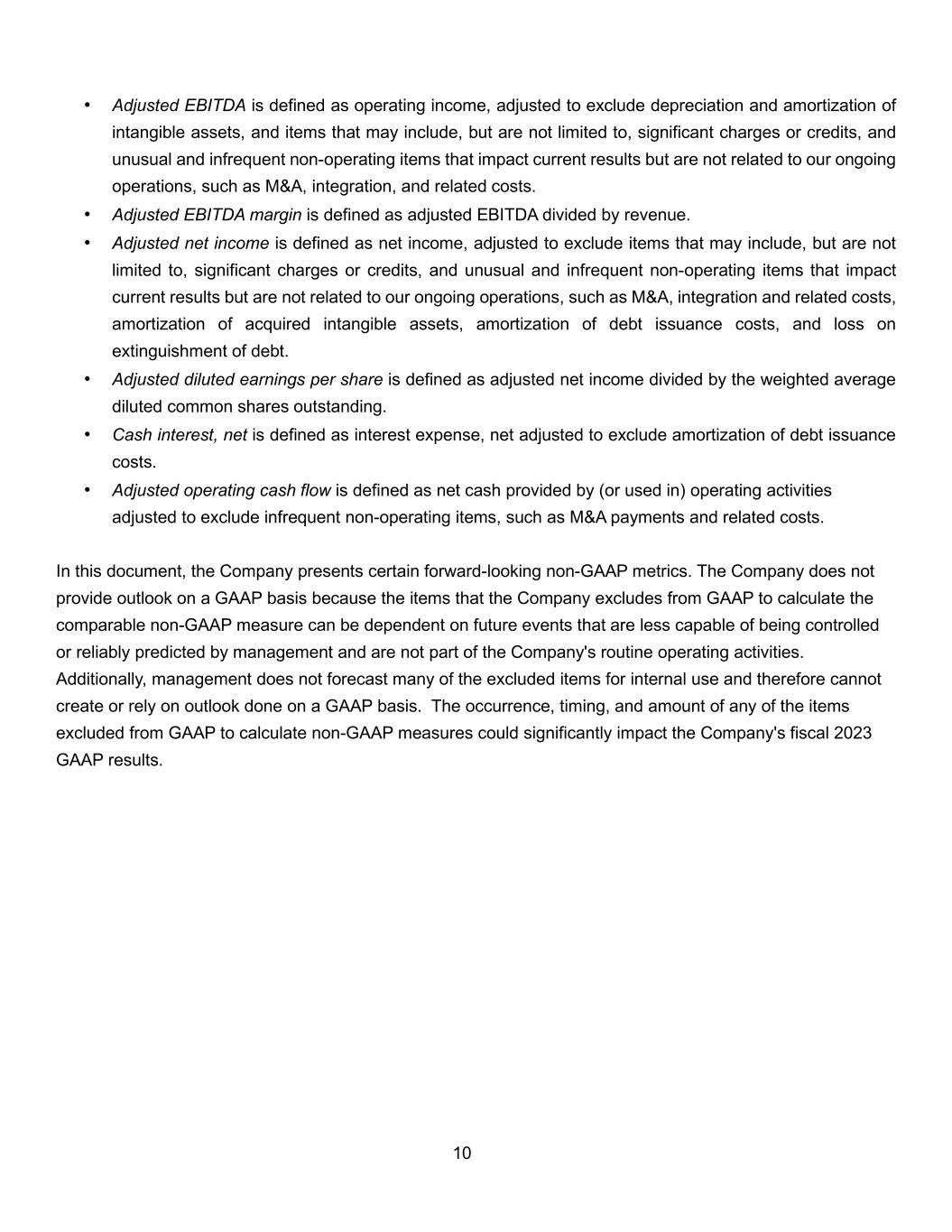 10 • Adjusted EBITDA is defined as operating income, adjusted to exclude depreciation and amortization of intangible assets, and items that may include, but are not limited to, significant charges or credits, and unusual and infrequent non-operating items that impact current results but are not related to our ongoing operations, such as M&A, integration, and related costs. • Adjusted EBITDA margin is defined as adjusted EBITDA divided by revenue. • Adjusted net income is defined as net income, adjusted to exclude items that may include, but are not limited to, significant charges or credits, and unusual and infrequent non-operating items that impact current results but are not related to our ongoing operations, such as M&A, integration and related costs, amortization of acquired intangible assets, amortization of debt issuance costs, and loss on extinguishment of debt. • Adjusted diluted earnings per share is defined as adjusted net income divided by the weighted average diluted common shares outstanding. • Cash interest, net is defined as interest expense, net adjusted to exclude amortization of debt issuance costs. • Adjusted operating cash flow is defined as net cash provided by (or used in) operating activities adjusted to exclude infrequent non-operating items, such as M&A payments and related costs. In this document, the Company presents certain forward-looking non-GAAP metrics. The Company does not provide outlook on a GAAP basis because the items that the Company excludes from GAAP to calculate the comparable non-GAAP measure can be dependent on future events that are less capable of being controlled or reliably predicted by management and are not part of the Company's routine operating activities. Additionally, management does not forecast many of the excluded items for internal use and therefore cannot create or rely on outlook done on a GAAP basis. The occurrence, timing, and amount of any of the items excluded from GAAP to calculate non-GAAP measures could significantly impact the Company's fiscal 2023 GAAP results.