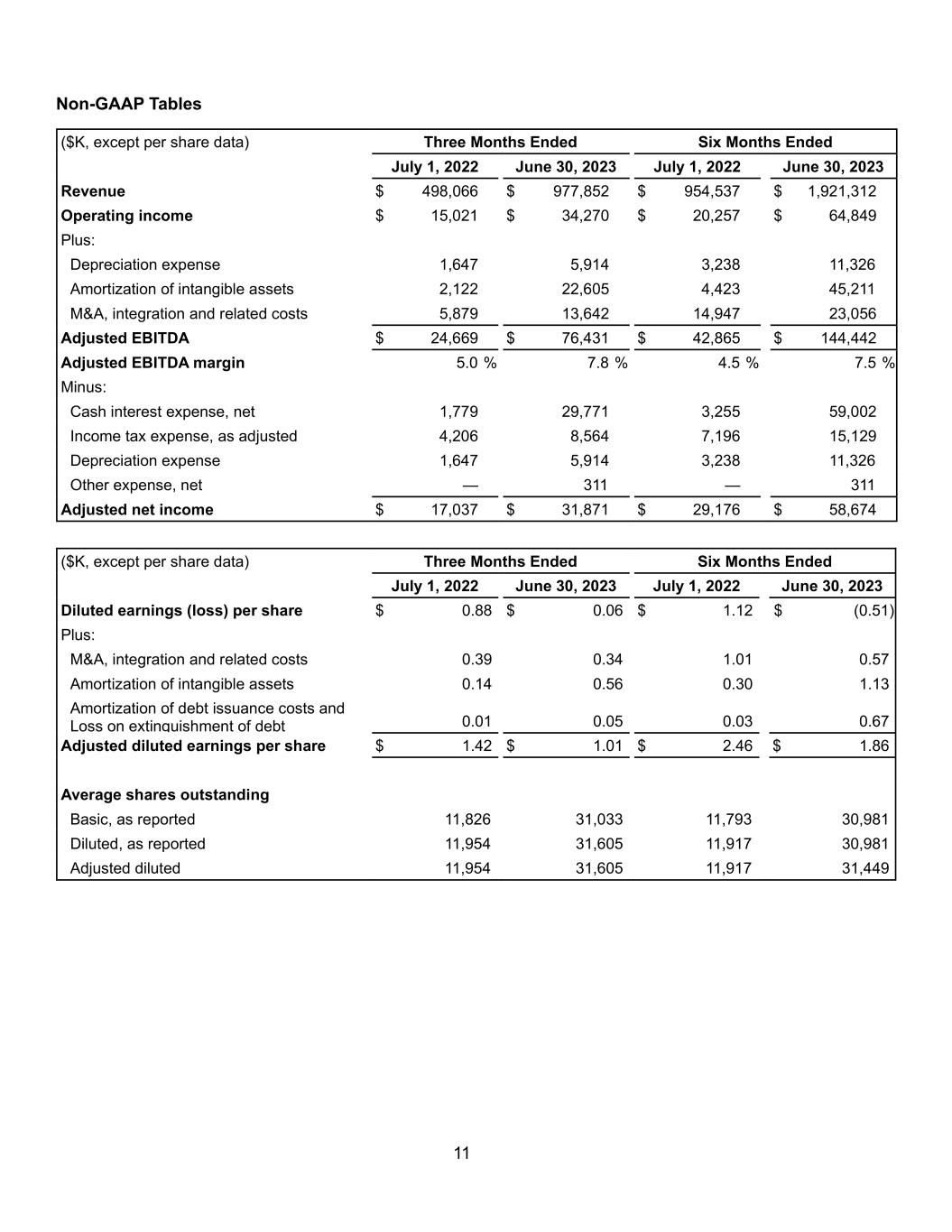11 Non-GAAP Tables ($K, except per share data) Three Months Ended Six Months Ended July 1, 2022 June 30, 2023 July 1, 2022 June 30, 2023 Revenue $ 498,066 $ 977,852 $ 954,537 $ 1,921,312 Operating income $ 15,021 $ 34,270 $ 20,257 $ 64,849 Plus: Depreciation expense 1,647 5,914 3,238 11,326 Amortization of intangible assets 2,122 22,605 4,423 45,211 M&A, integration and related costs 5,879 13,642 14,947 23,056 Adjusted EBITDA $ 24,669 $ 76,431 $ 42,865 $ 144,442 Adjusted EBITDA margin 5.0 % 7.8 % 4.5 % 7.5 % Minus: Cash interest expense, net 1,779 29,771 3,255 59,002 Income tax expense, as adjusted 4,206 8,564 7,196 15,129 Depreciation expense 1,647 5,914 3,238 11,326 Other expense, net — 311 — 311 Adjusted net income $ 17,037 $ 31,871 $ 29,176 $ 58,674 ($K, except per share data) Three Months Ended Six Months Ended July 1, 2022 June 30, 2023 July 1, 2022 June 30, 2023 Diluted earnings (loss) per share $ 0.88 $ 0.06 $ 1.12 $ (0.51) Plus: M&A, integration and related costs 0.39 0.34 1.01 0.57 Amortization of intangible assets 0.14 0.56 0.30 1.13 Amortization of debt issuance costs and Loss on extinguishment of debt 0.01 0.05 0.03 0.67 Adjusted diluted earnings per share $ 1.42 $ 1.01 $ 2.46 $ 1.86 Average shares outstanding Basic, as reported 11,826 31,033 11,793 30,981 Diluted, as reported 11,954 31,605 11,917 30,981 Adjusted diluted 11,954 31,605 11,917 31,449