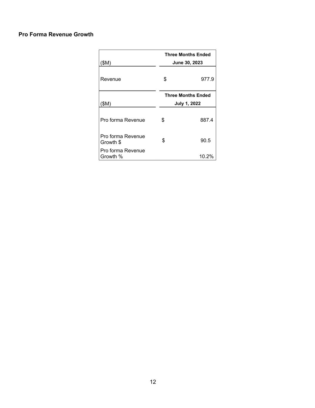 12 Pro Forma Revenue Growth Three Months Ended ($M) June 30, 2023 Revenue $ 977.9 Three Months Ended ($M) July 1, 2022 Pro forma Revenue $ 887.4 Pro forma Revenue Growth $ $ 90.5 Pro forma Revenue Growth % 10.2%